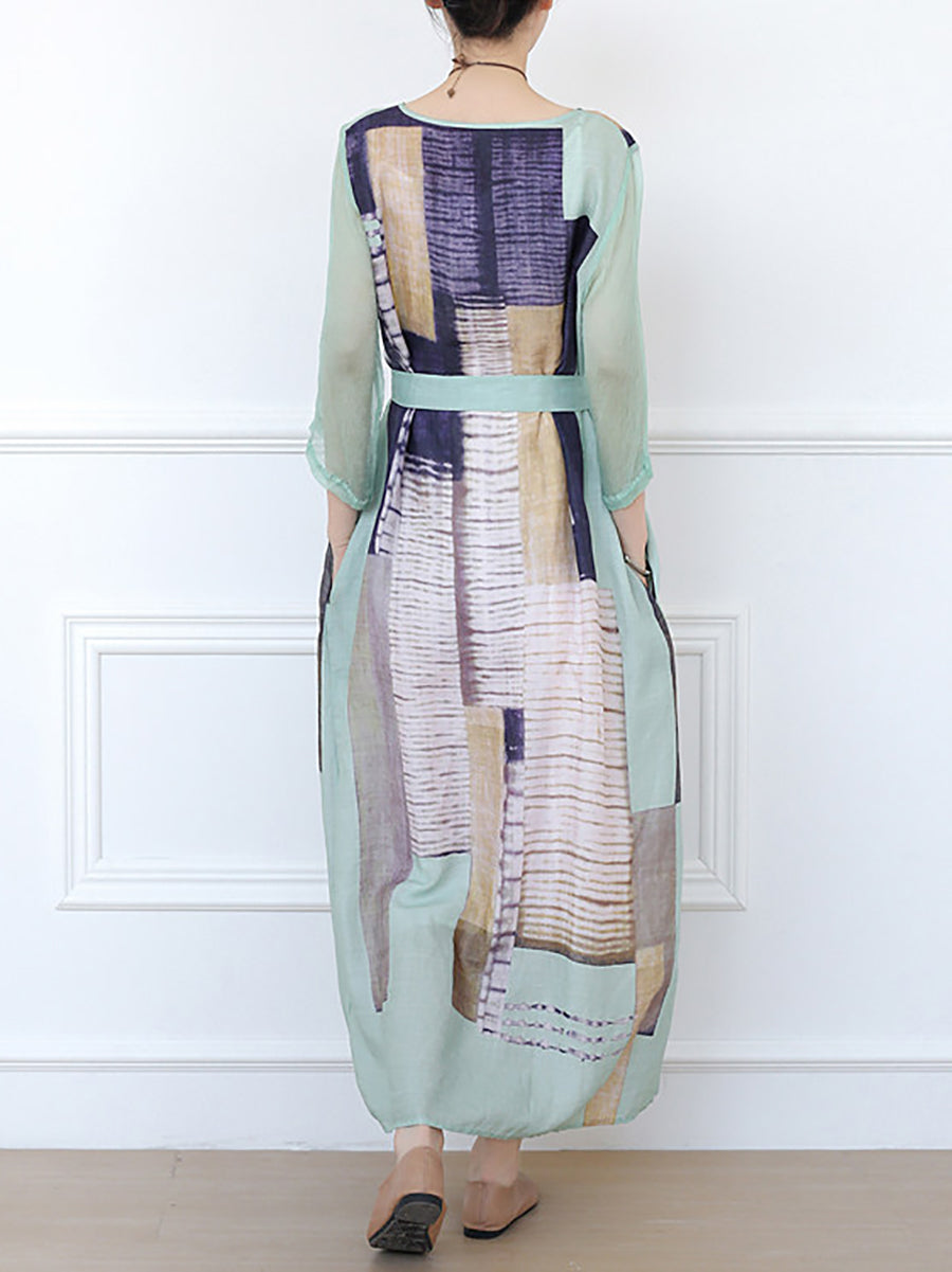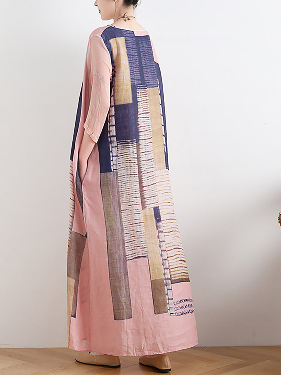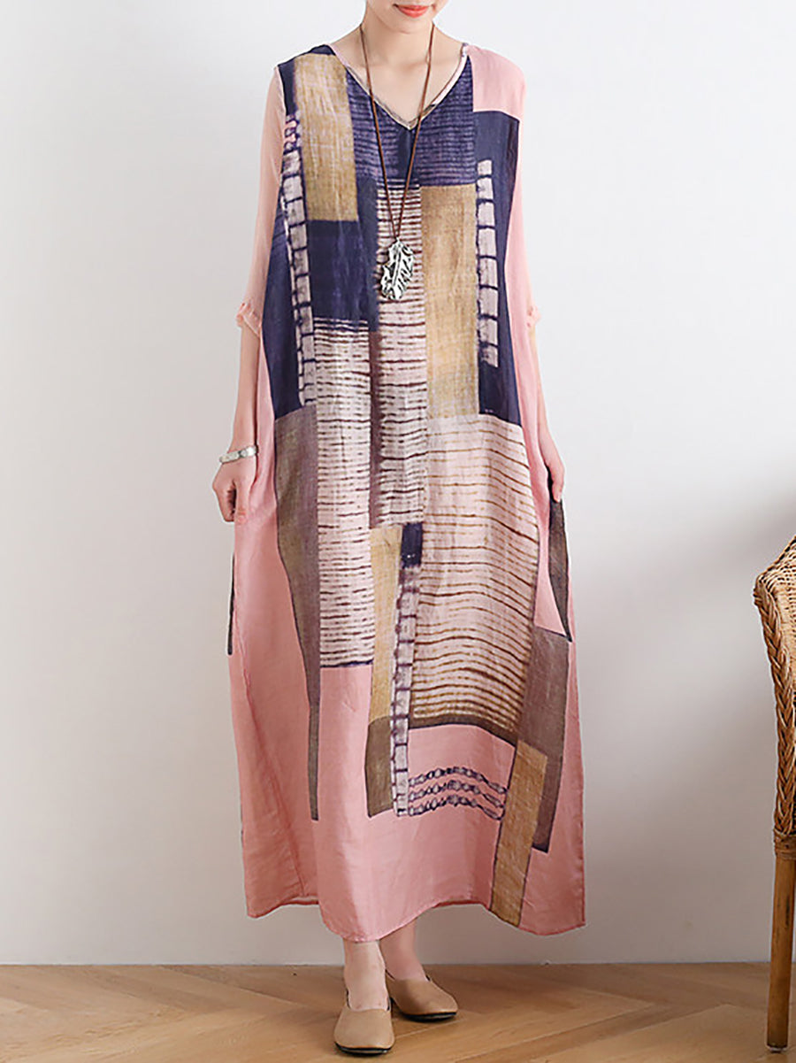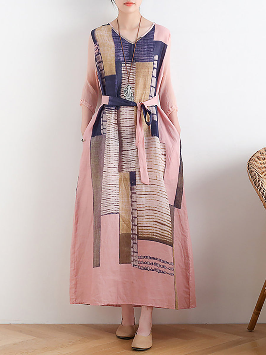 Women Summer Artsy Patchwork Ramie V-Neck Dress