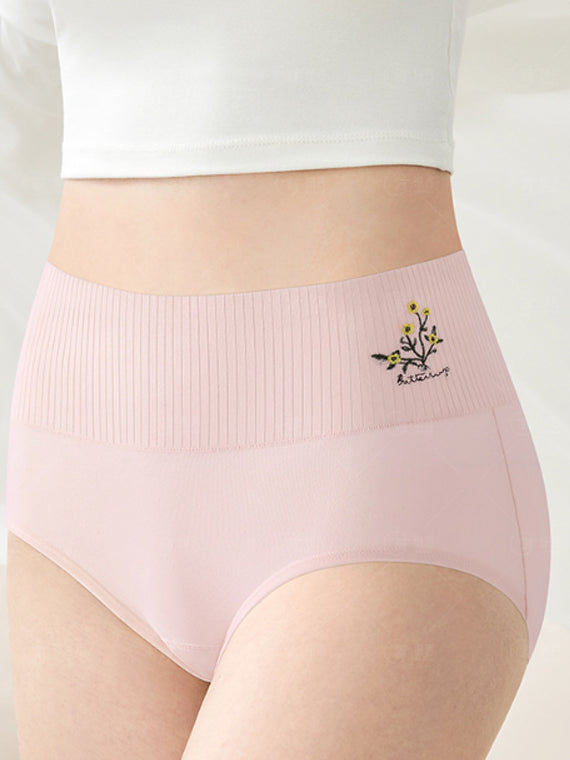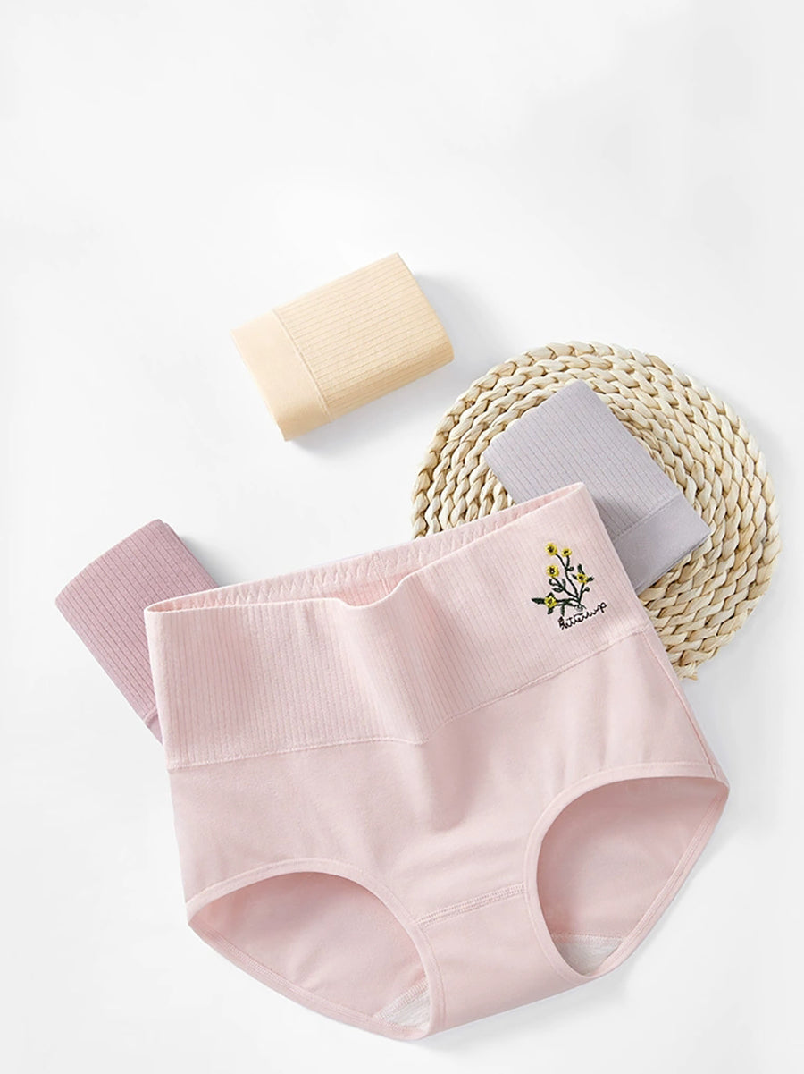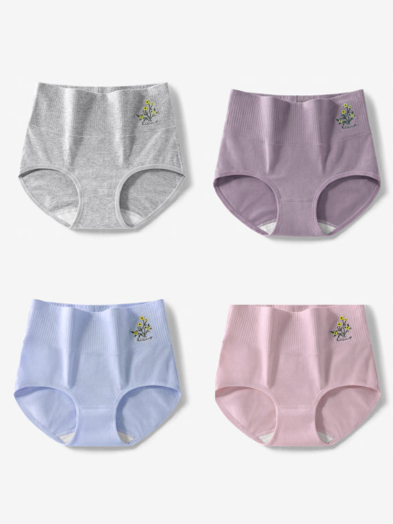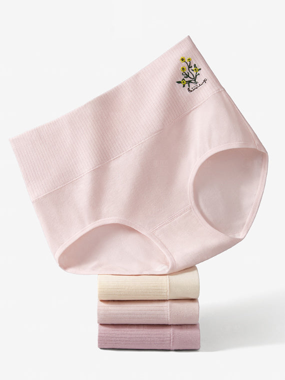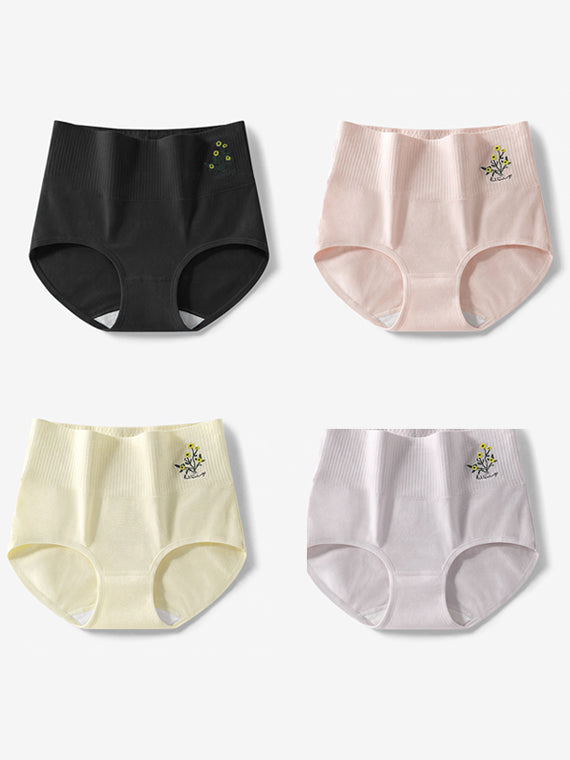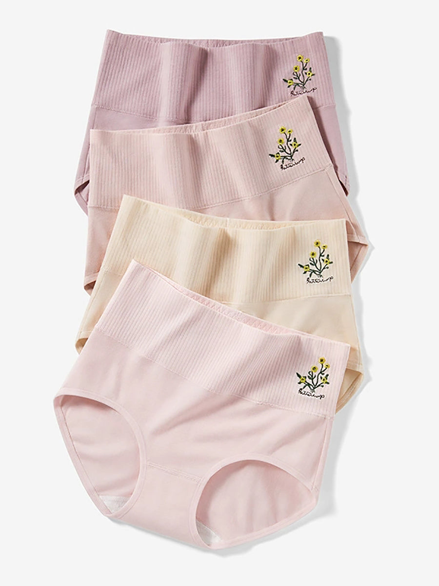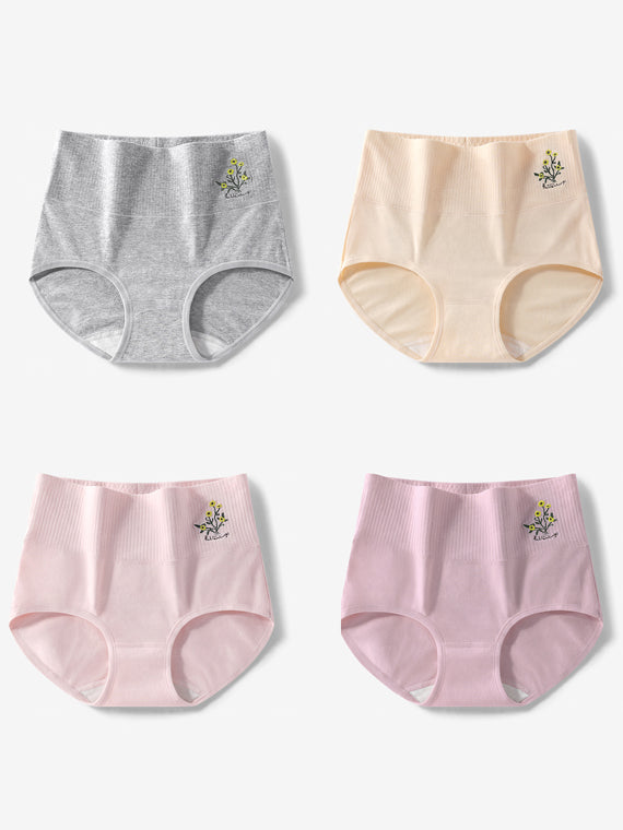 4 Pieces Women Artsy Flower Embroidery High Waist Underwear