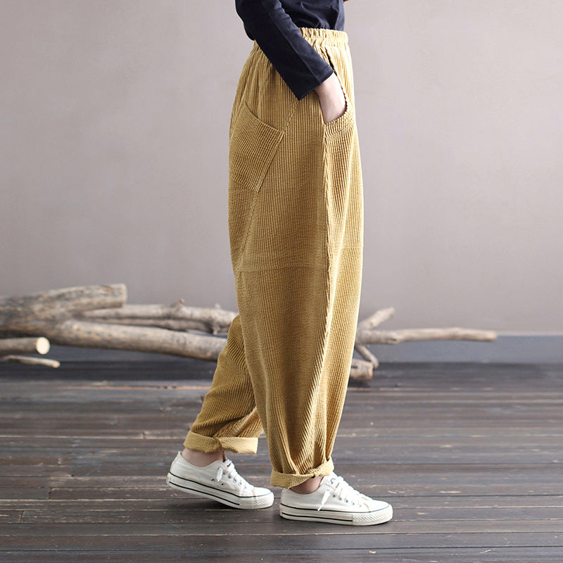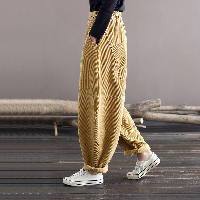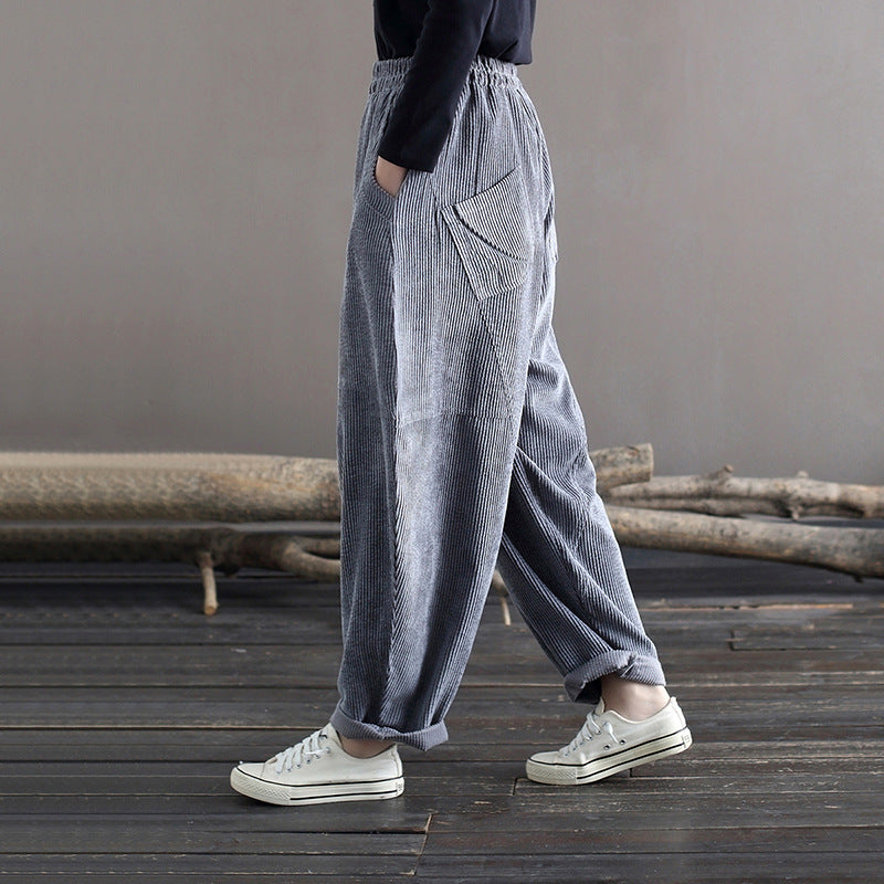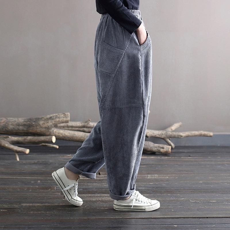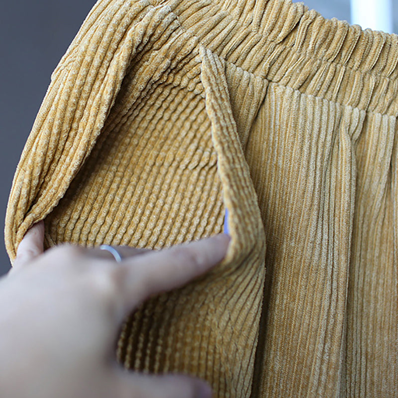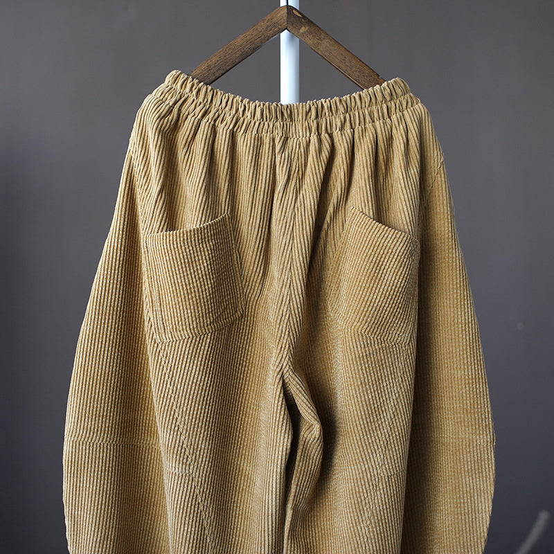 Corduroy Women Pocket Elastic Waist Solid Color Pants