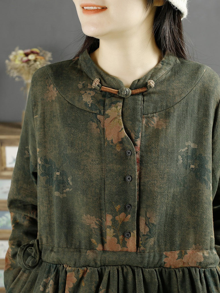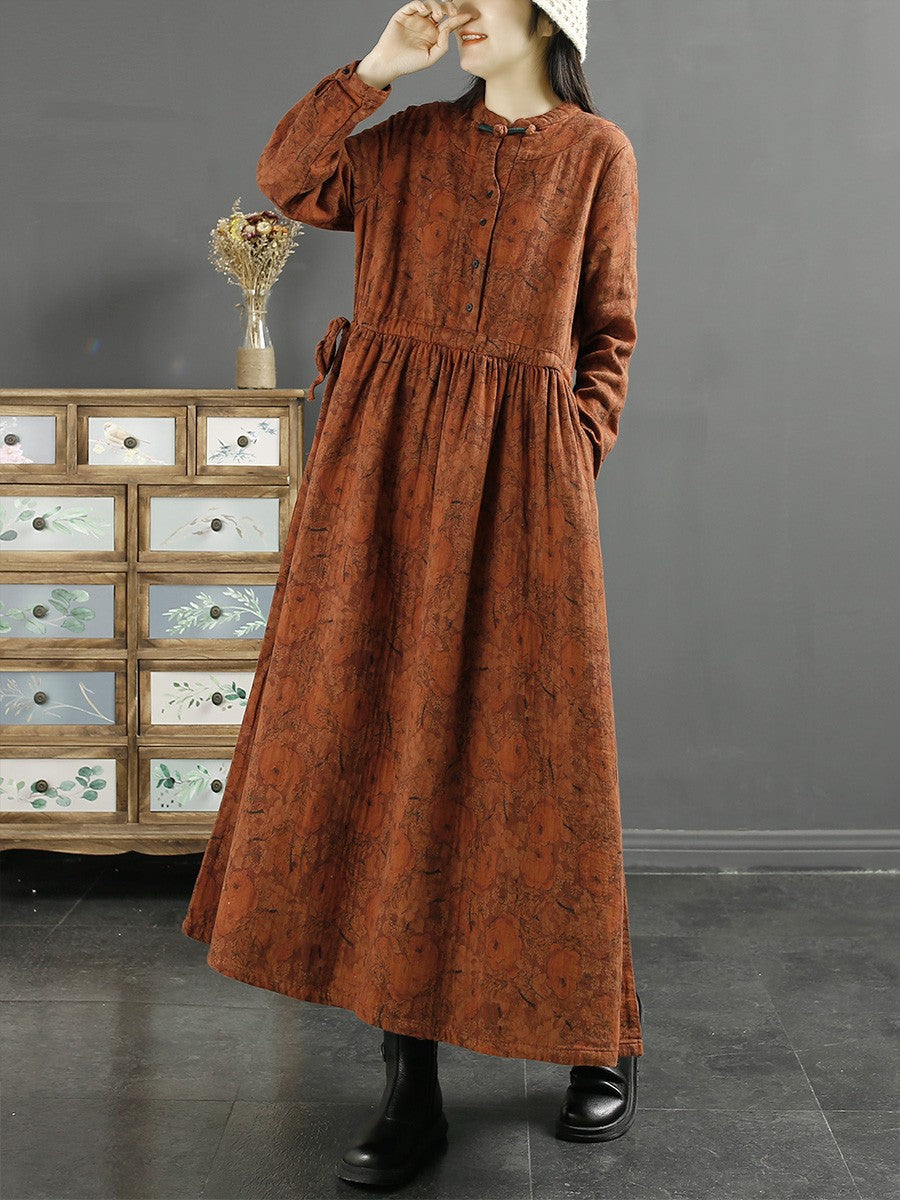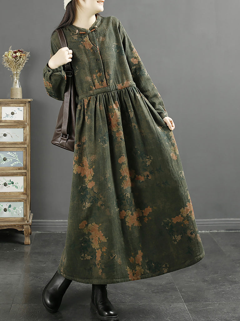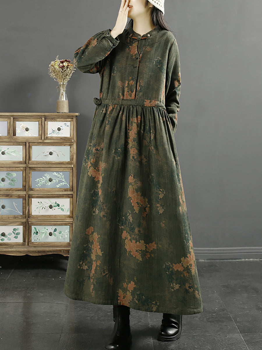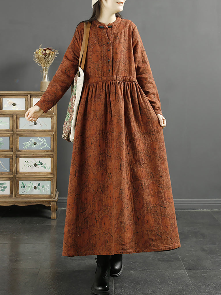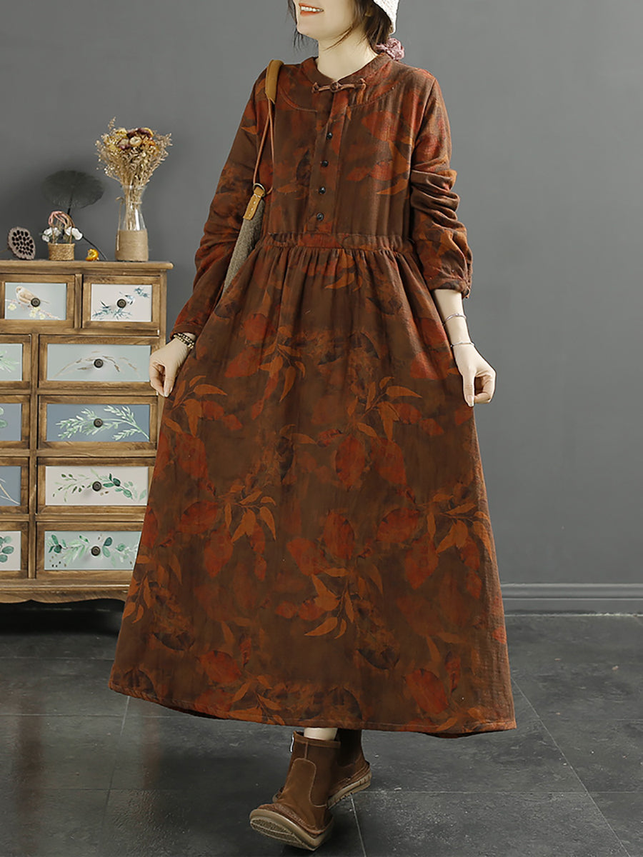 Crafted from 100% cotton, this ankle-length dress features a stand collar and full sleeves. Its vintage leaf print gives a floral touch, complemented by button details. Designed for autumn wear, it combines comfort and style for plus size women.