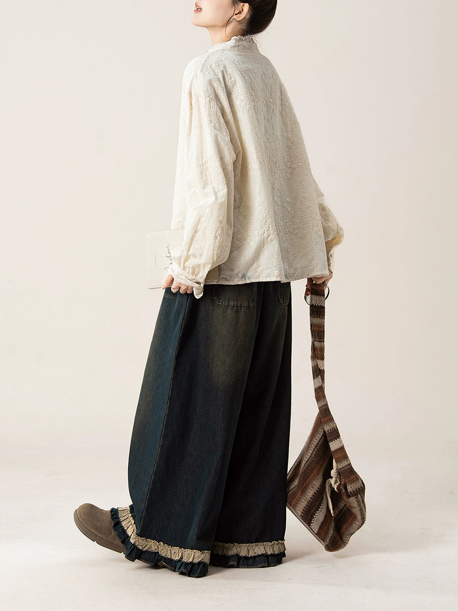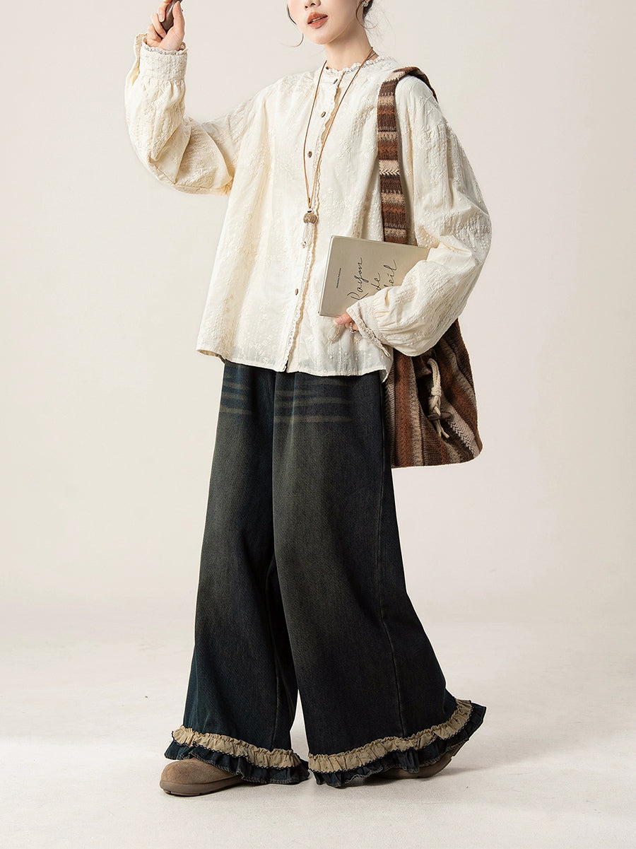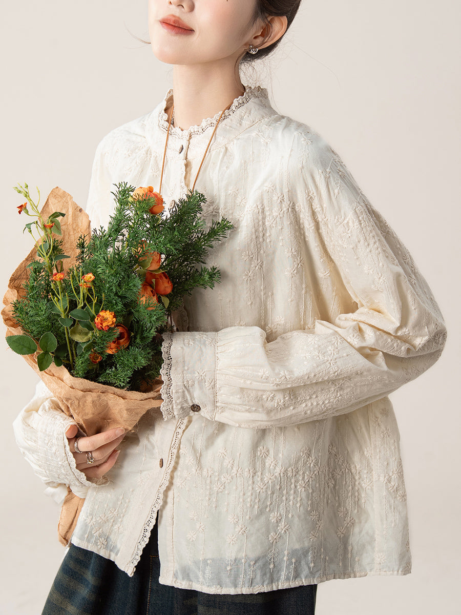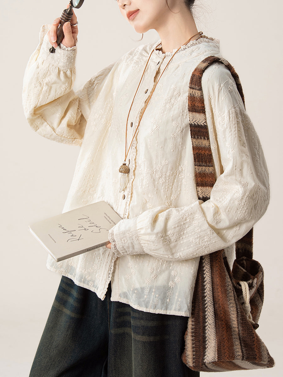 Women Artsy Autumn Embroidery Lace Collar Shirt