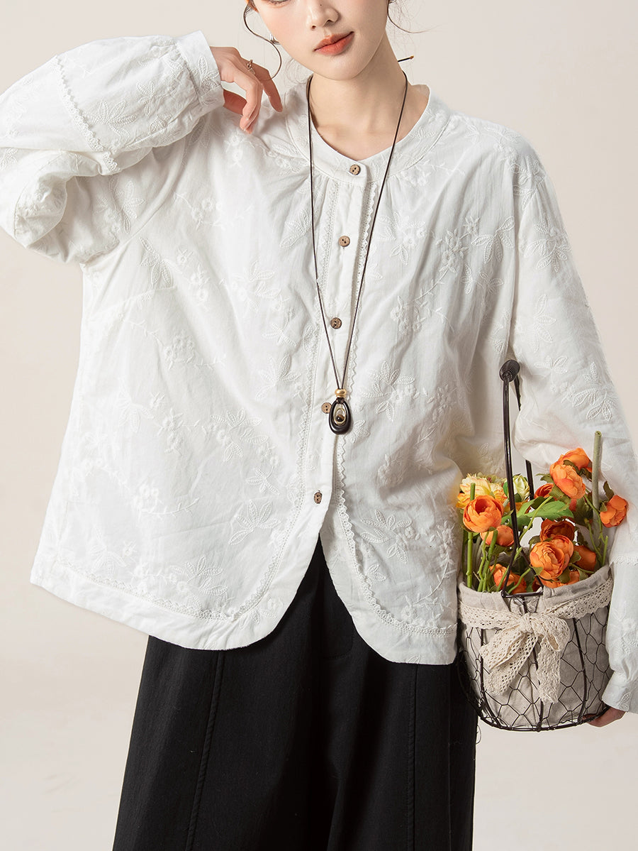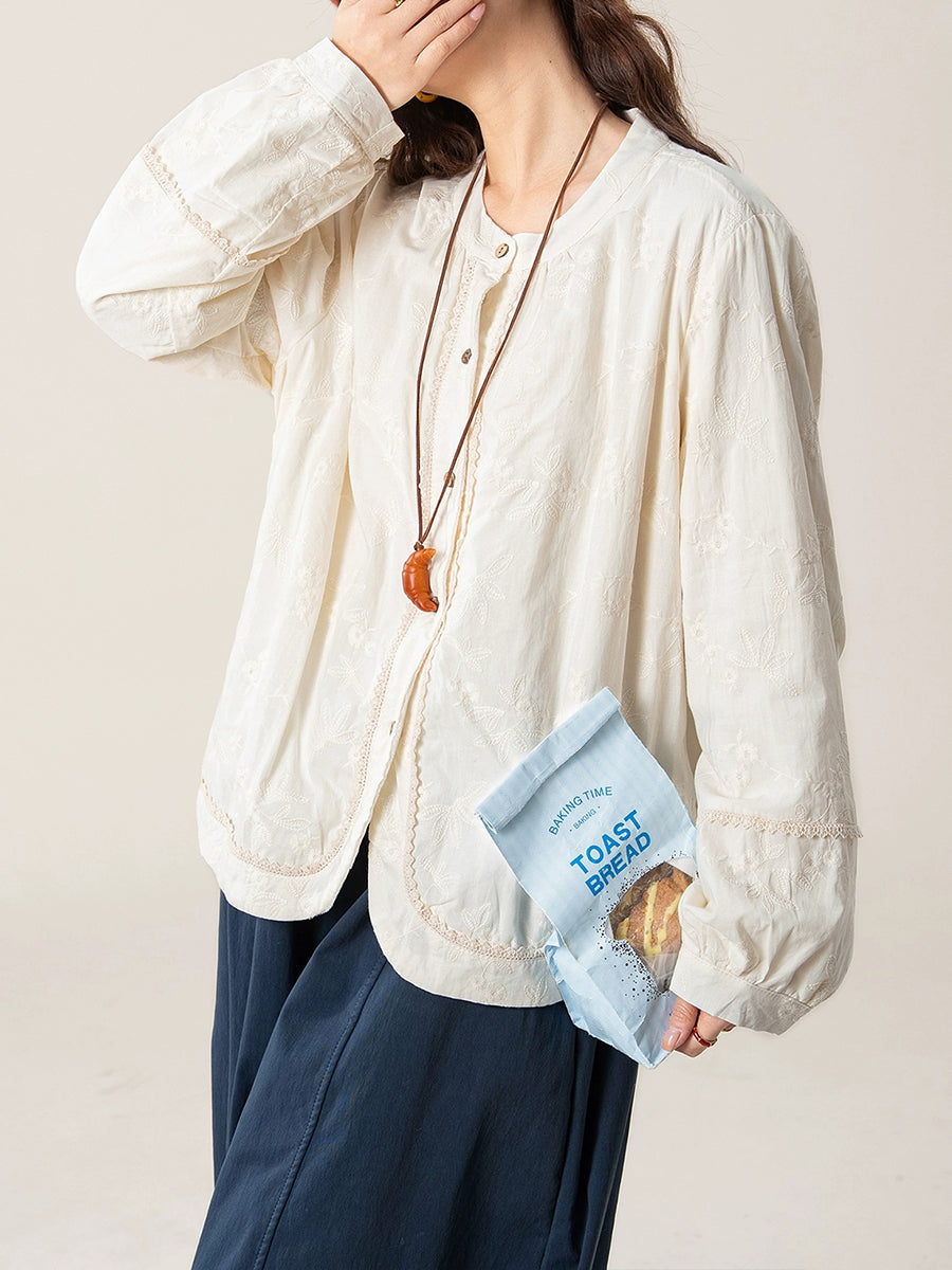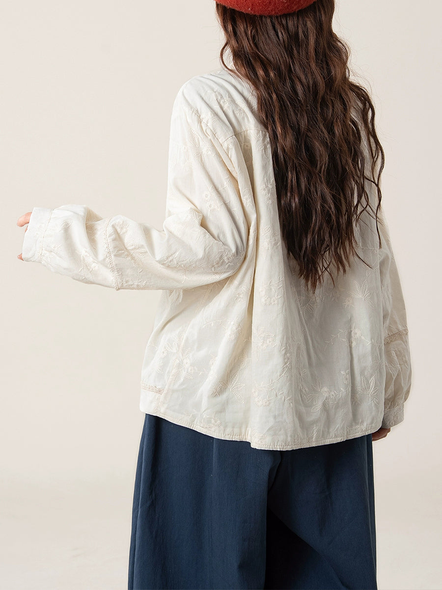 Women Artsy Autumn Embroidery O-Neck Shirt