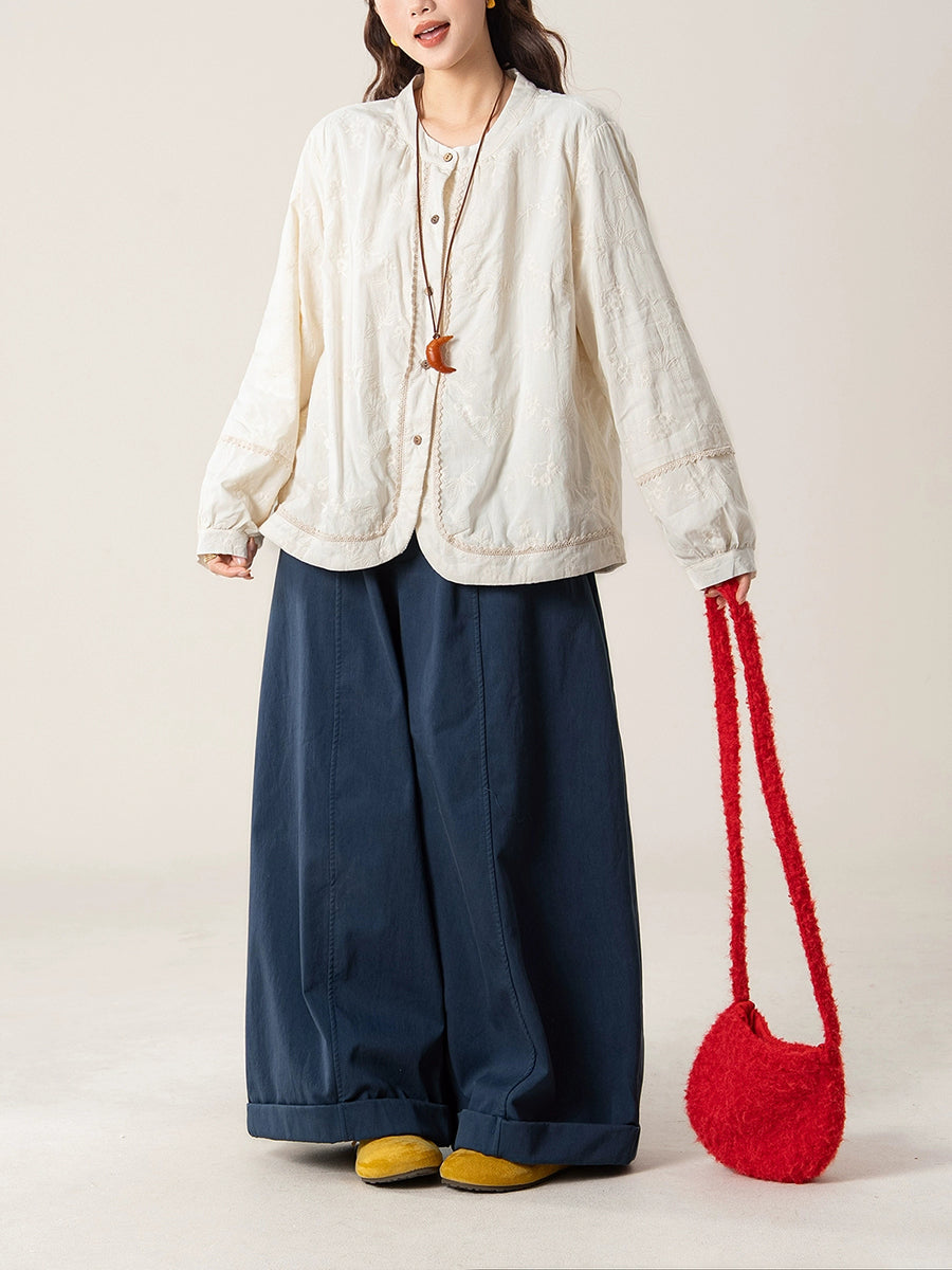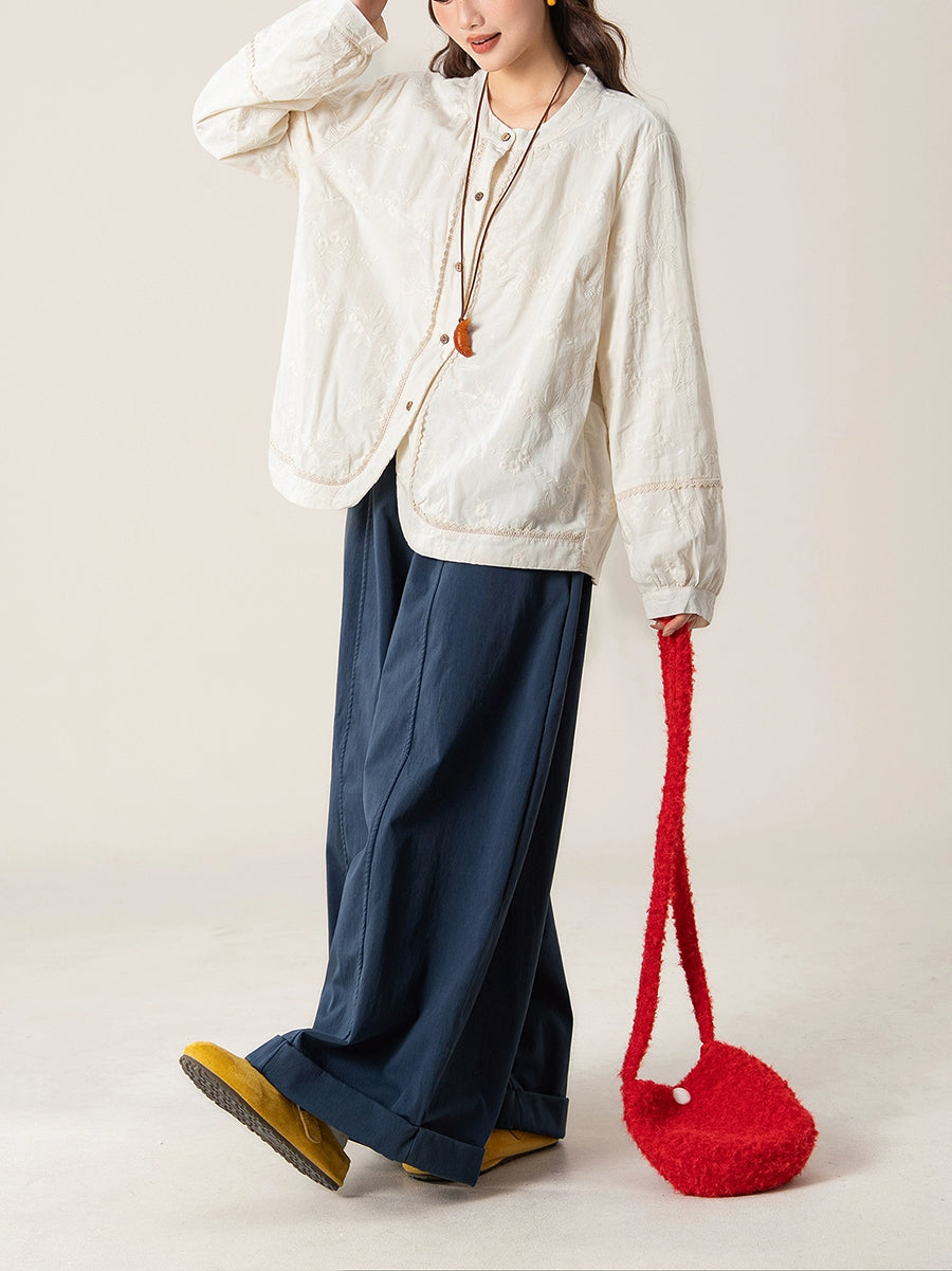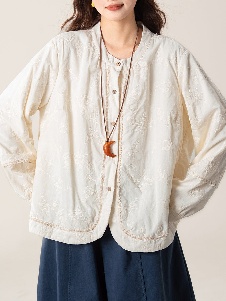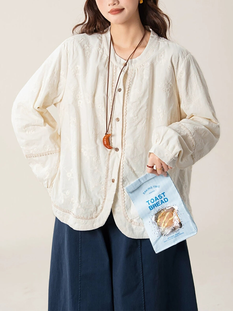 Women Artsy Autumn Embroidery O-Neck Shirt