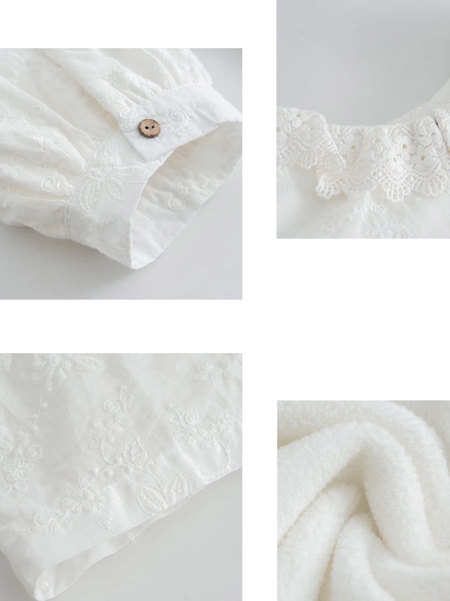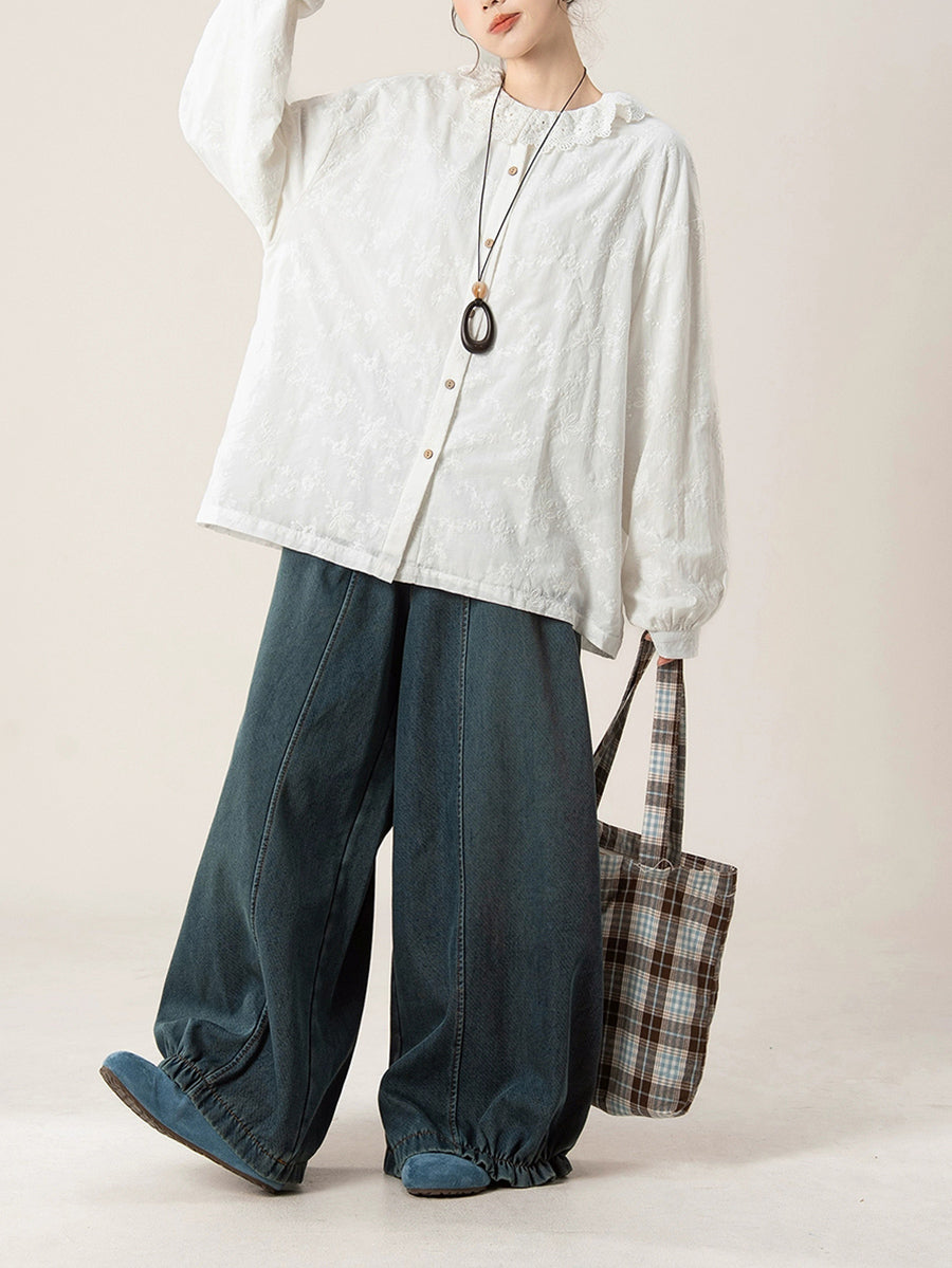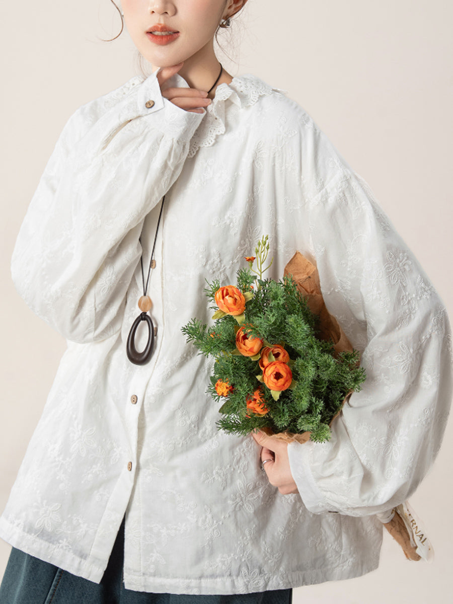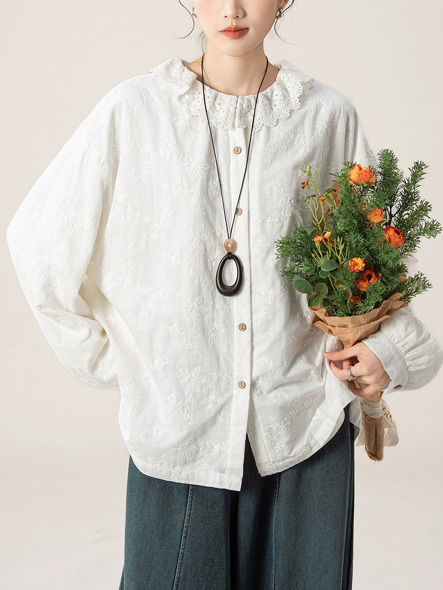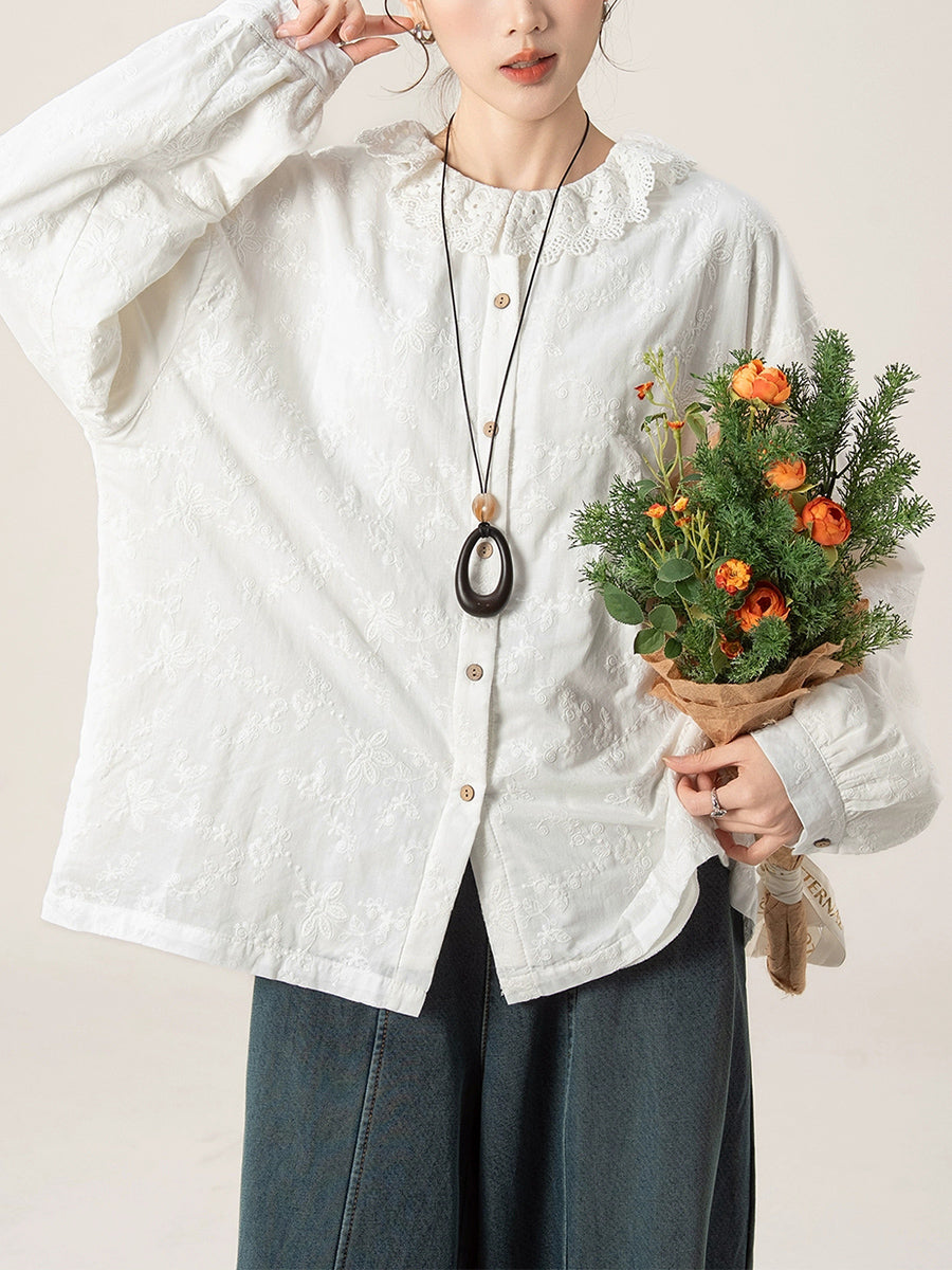 Women Artsy Autumn Embroidery Turn-down Collar Shirt