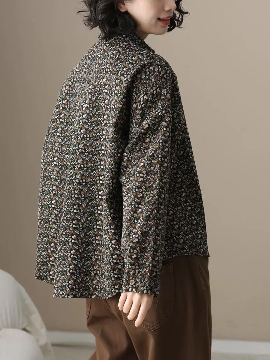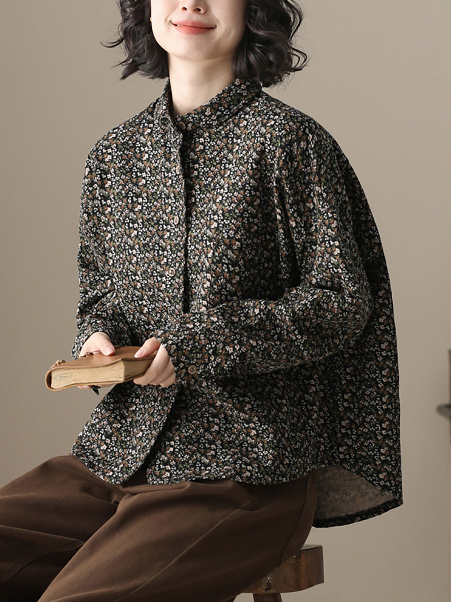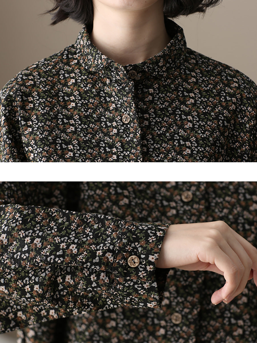 Women Artsy Autumn Floral Turn-down Collar Cotton Shirt