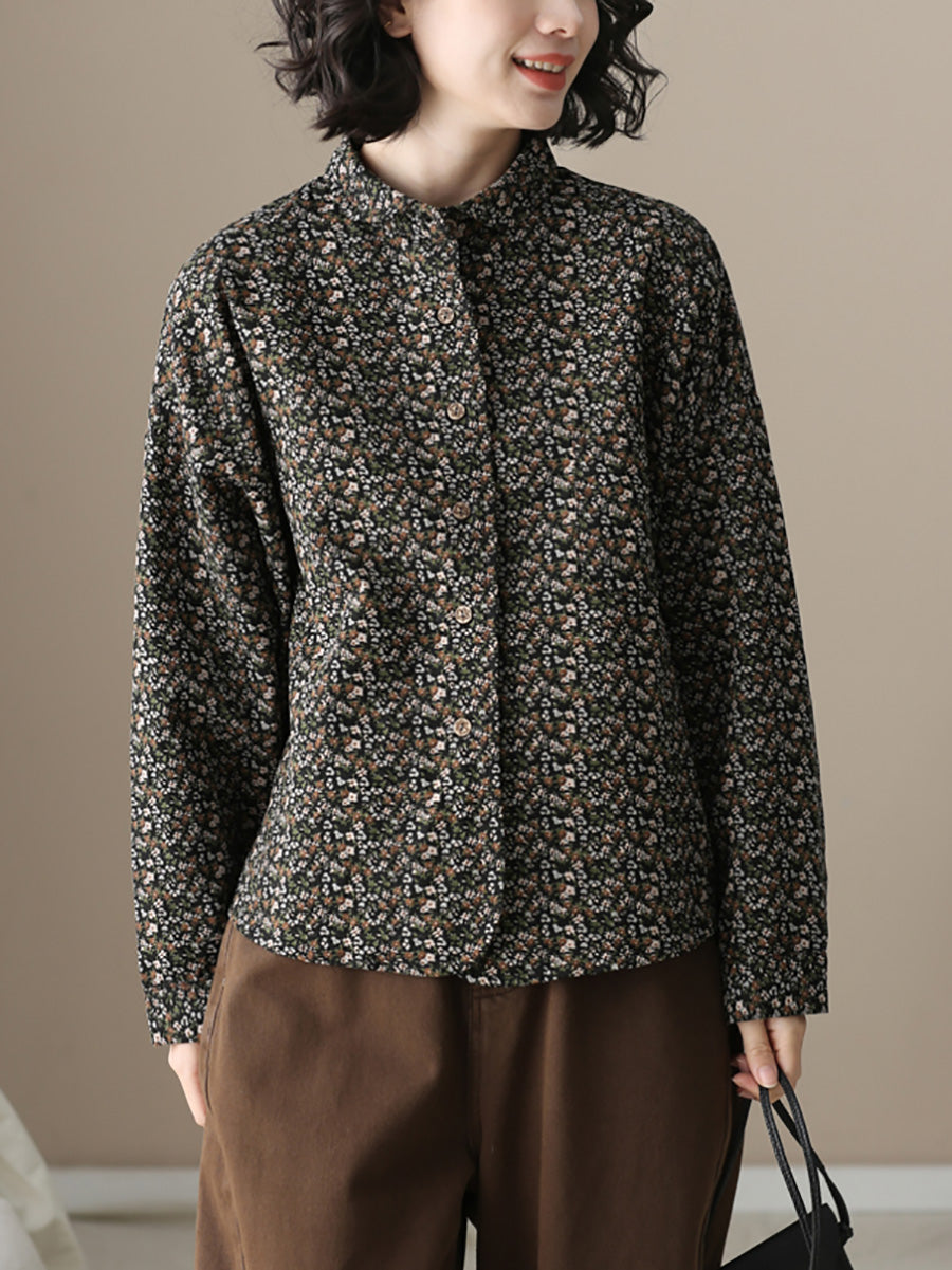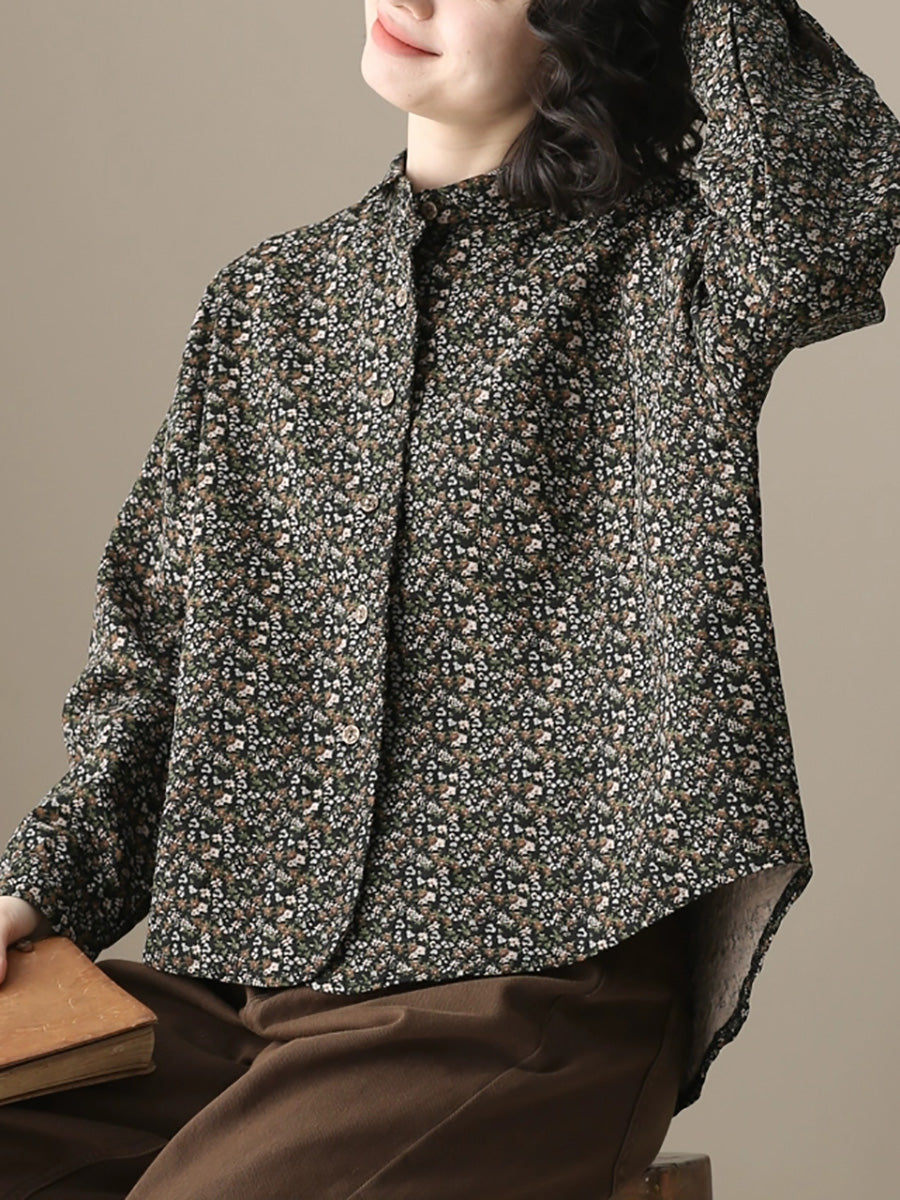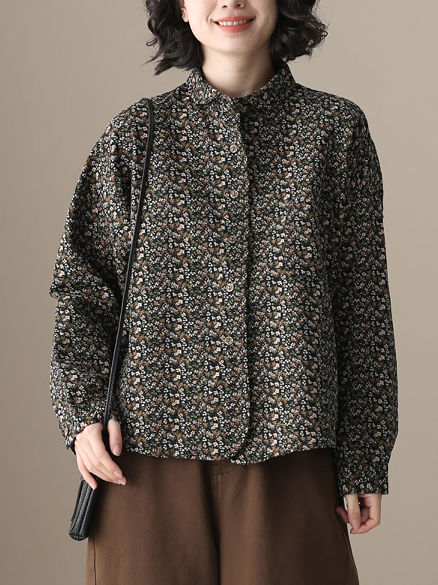 Women Artsy Autumn Floral Turn-down Collar Cotton Shirt