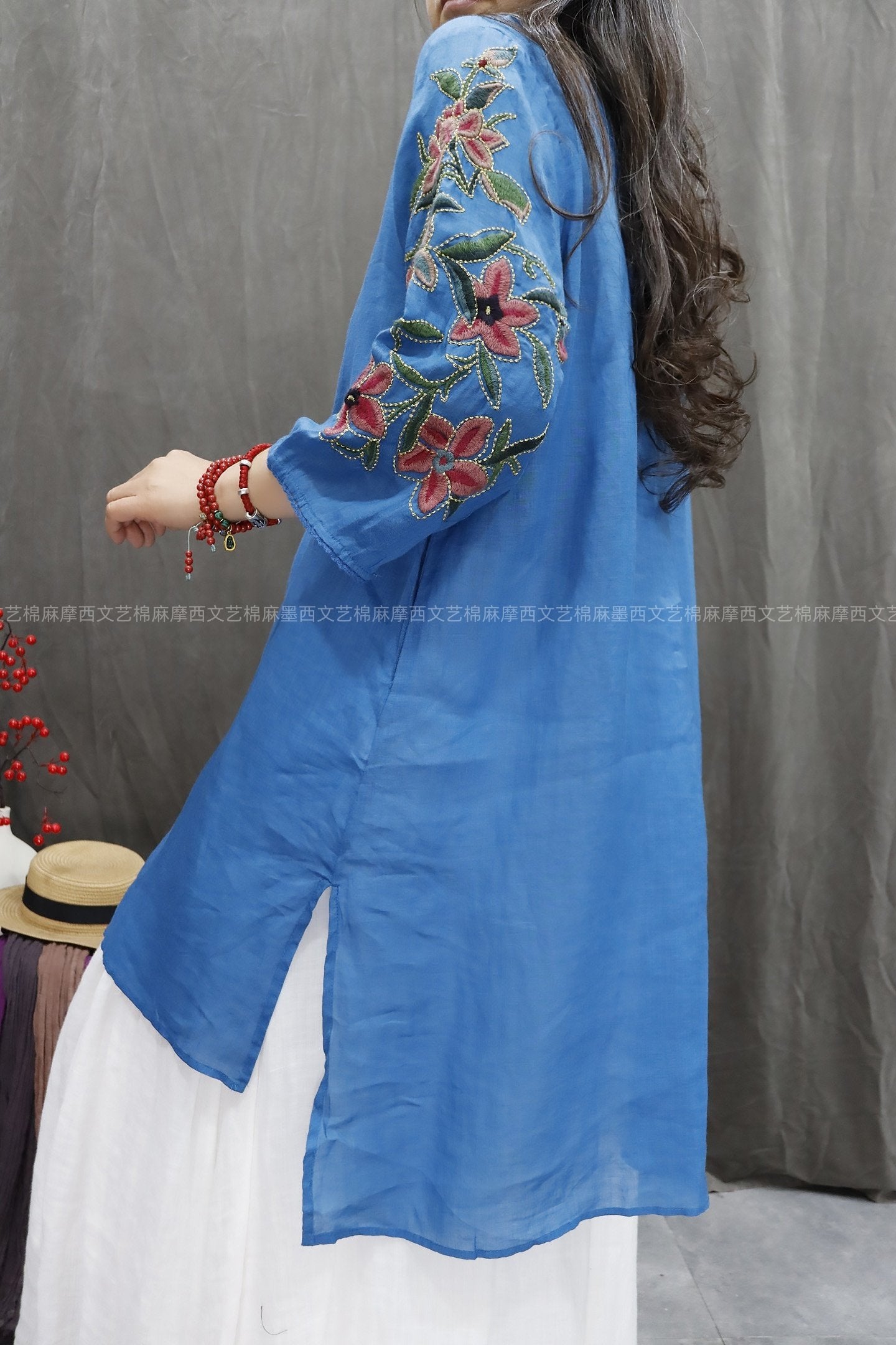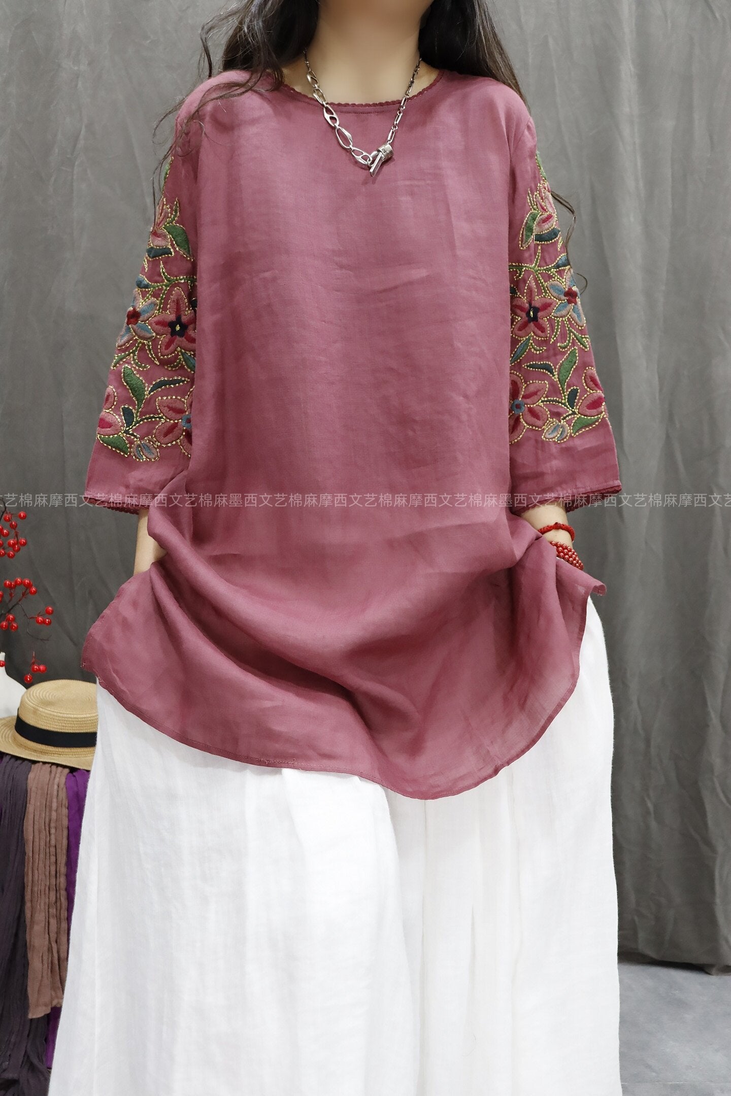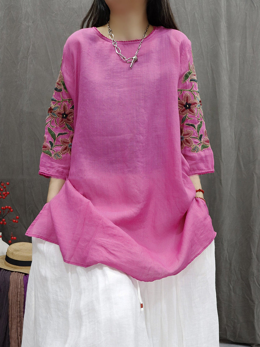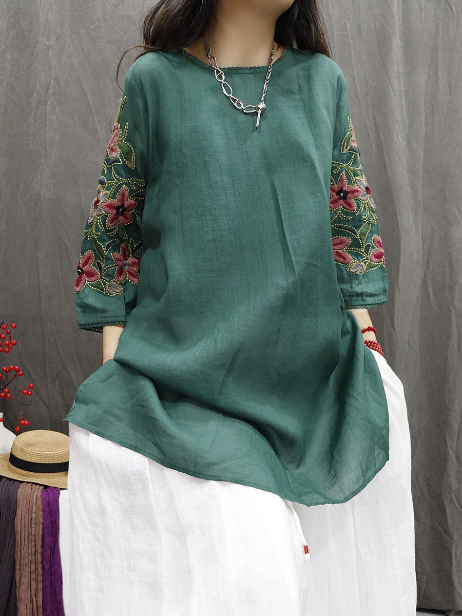 Women Artsy Embroidery Flower O-Neck 100%Ramie Blouse