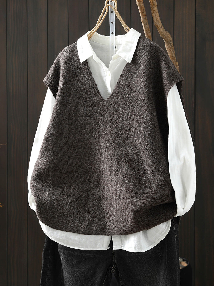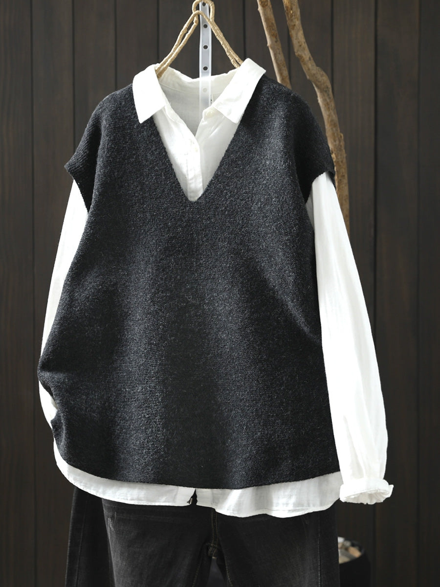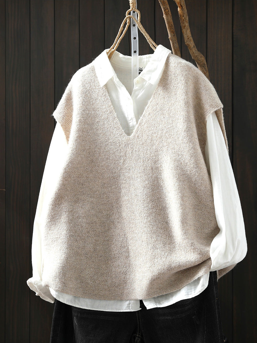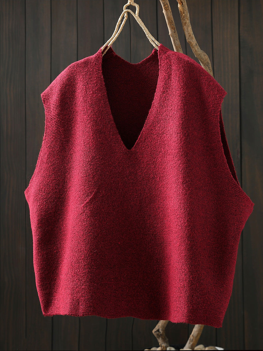 Women Artsy Pure Color Hem V-Neck Knitted Vest