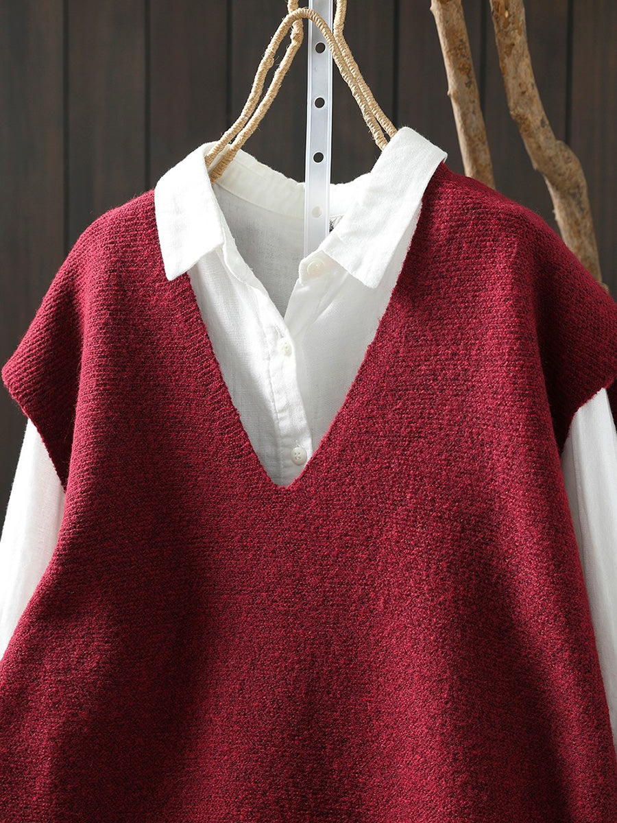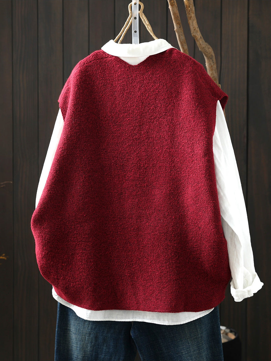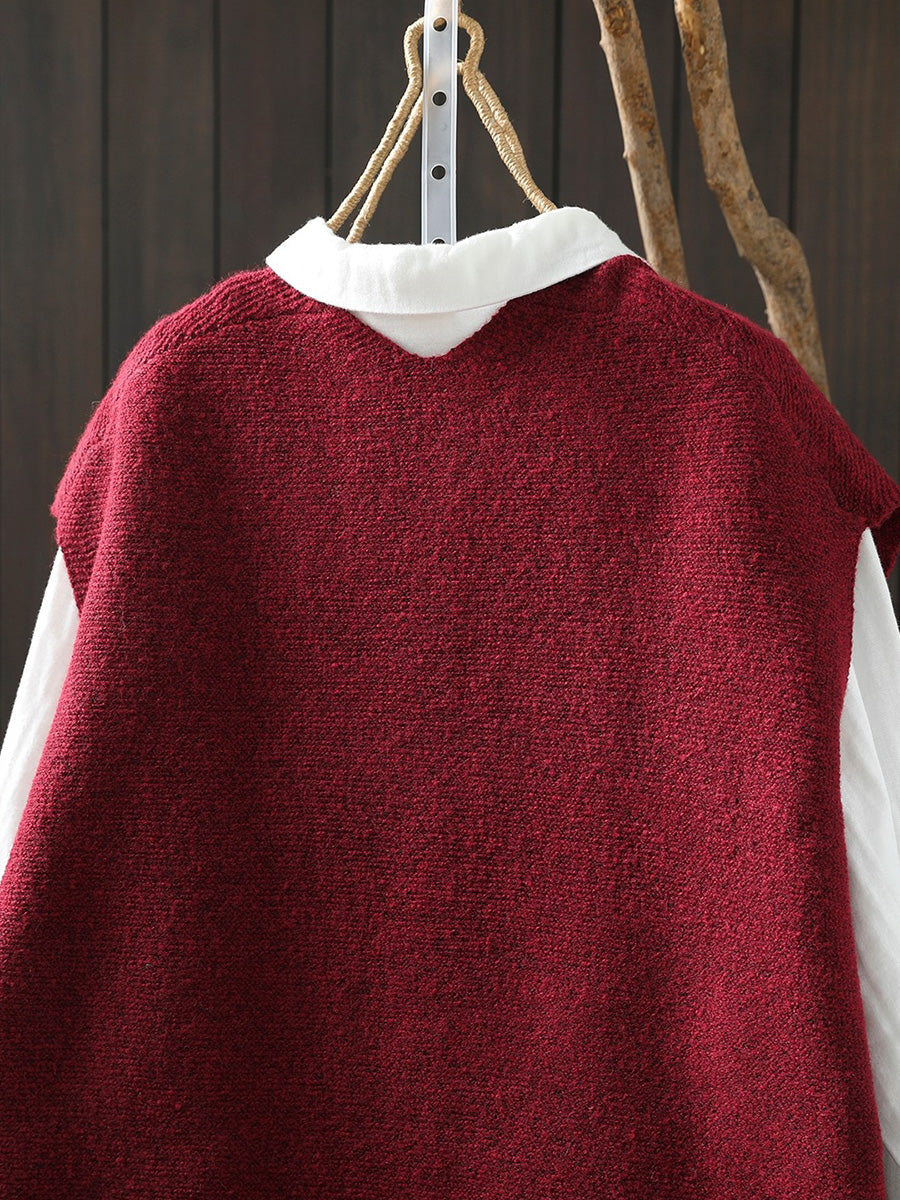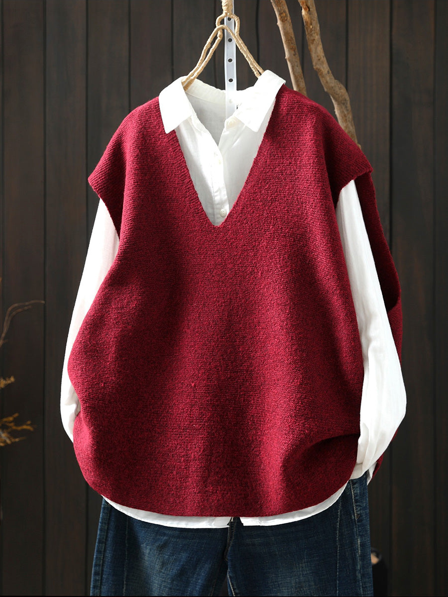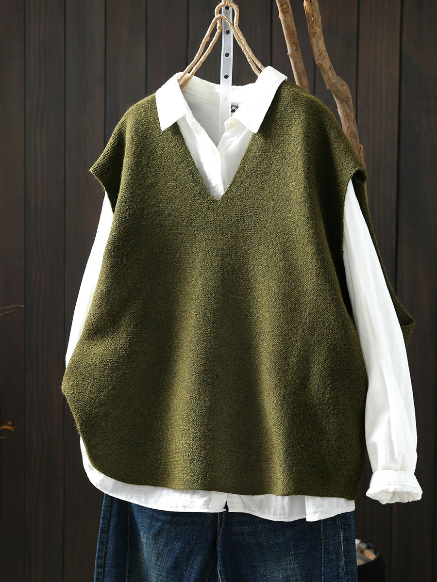 Women Artsy Pure Color Hem V-Neck Knitted Vest
