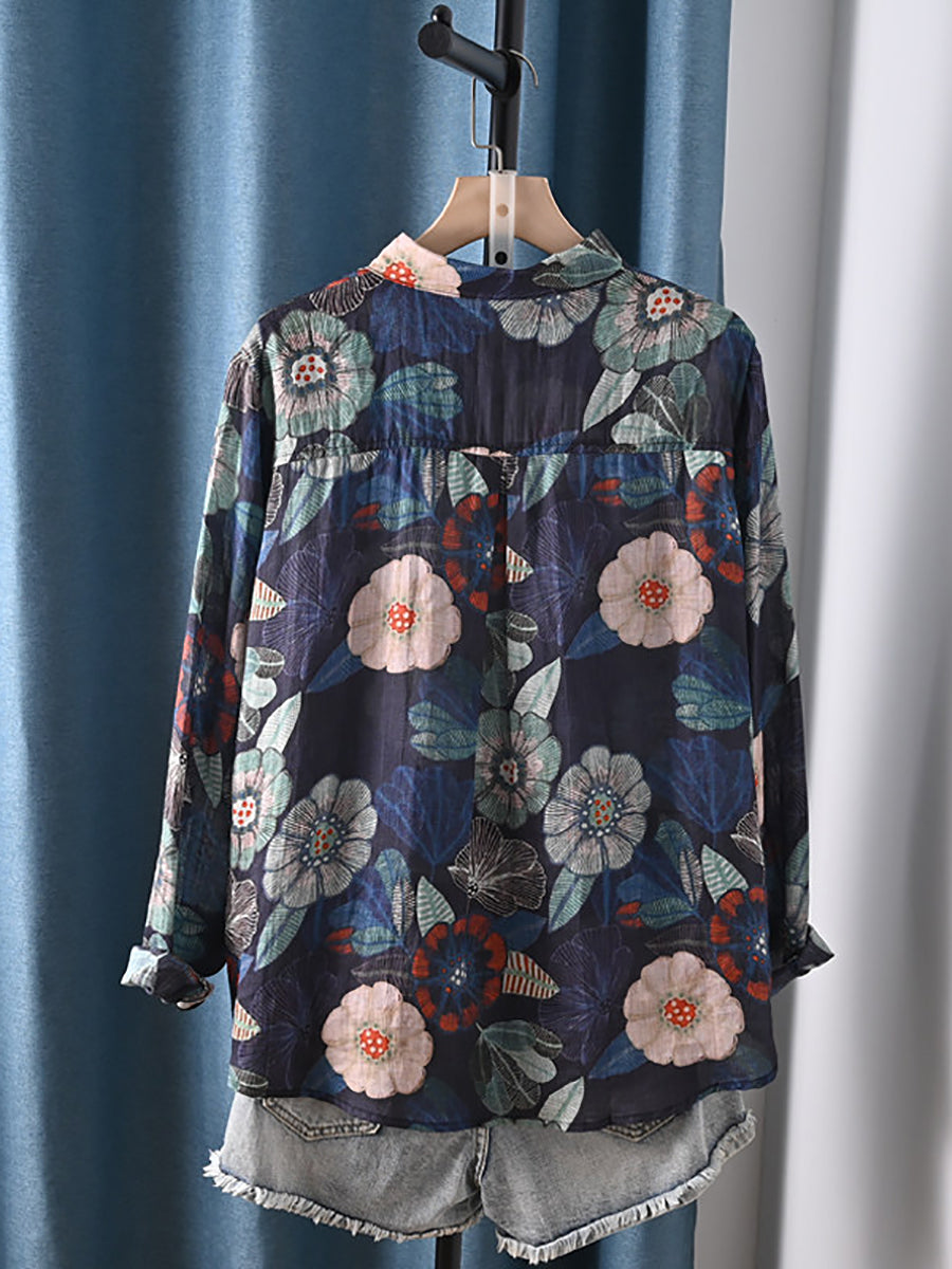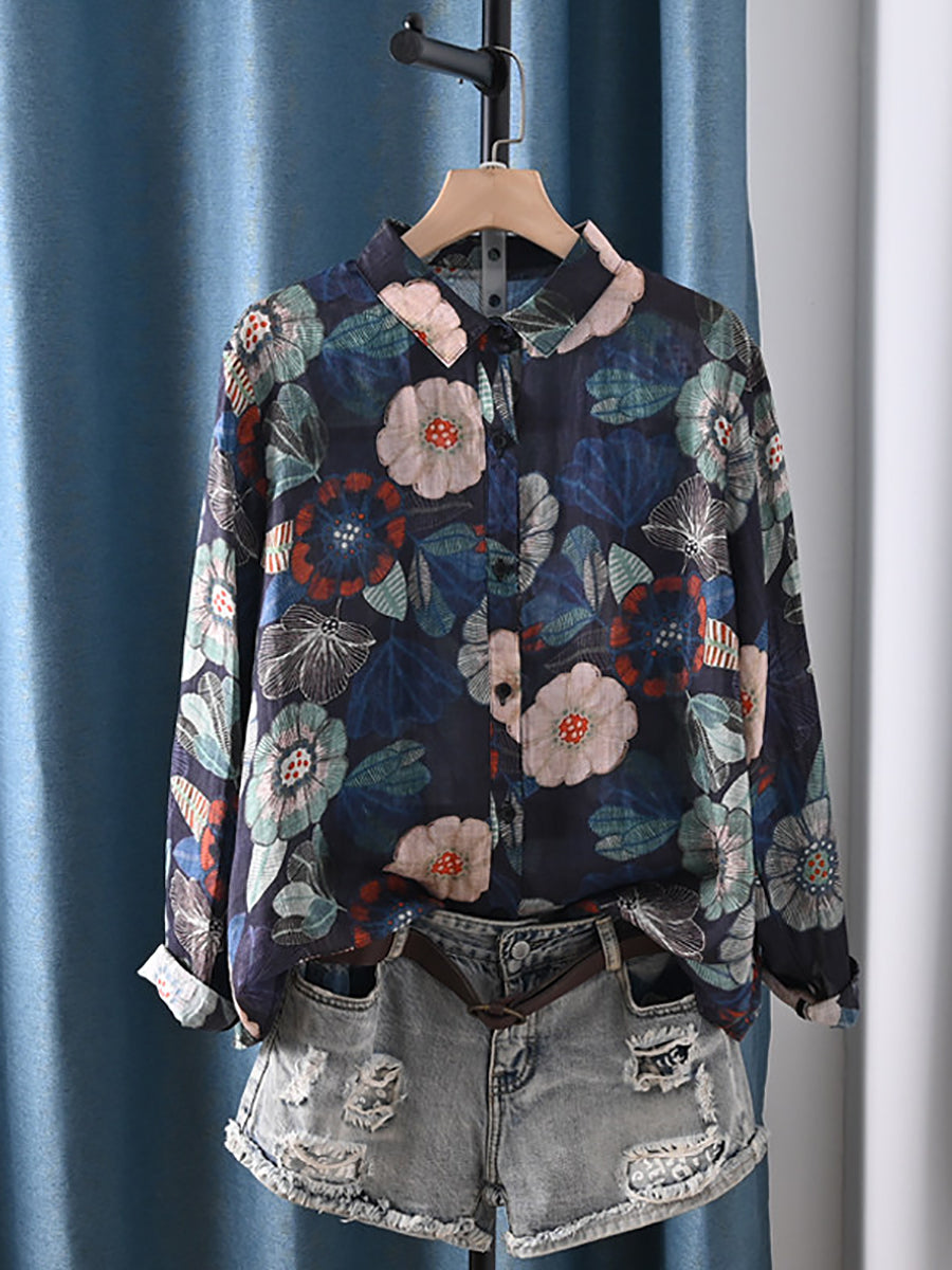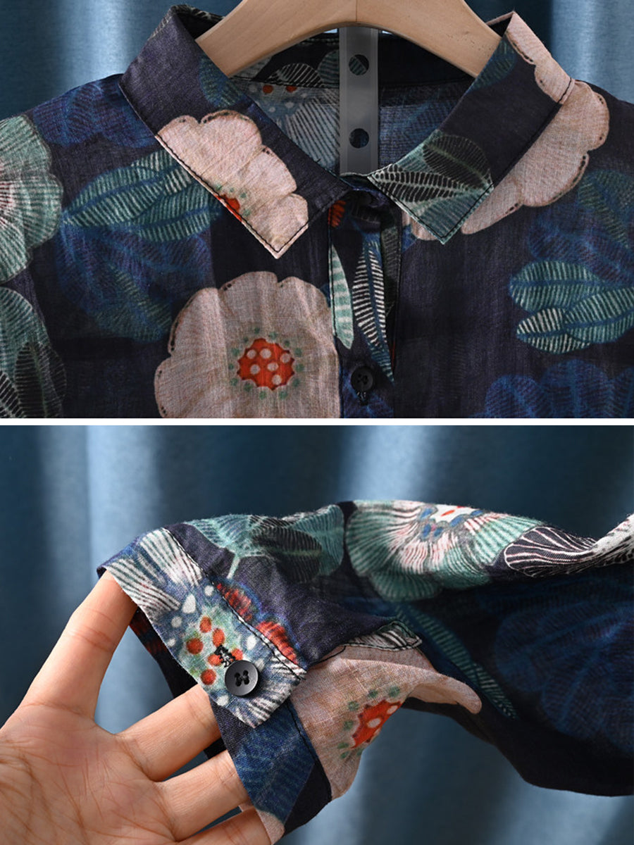 Women Artsy Spring Flower 100%Ramie Shirt