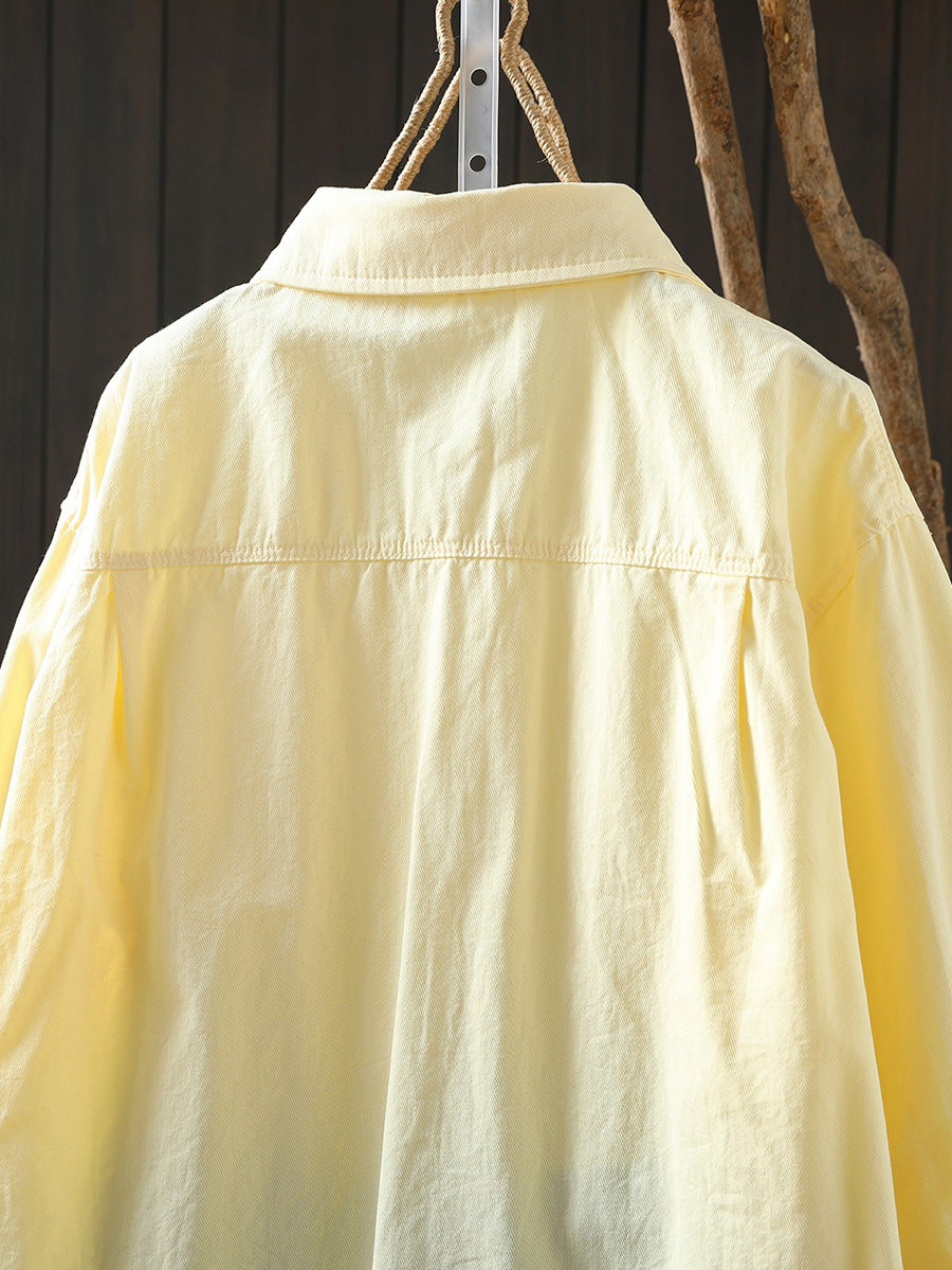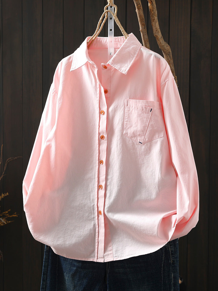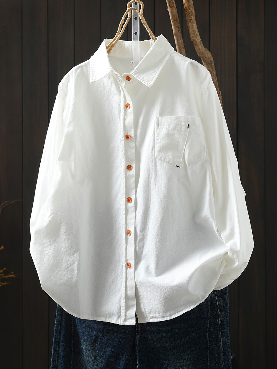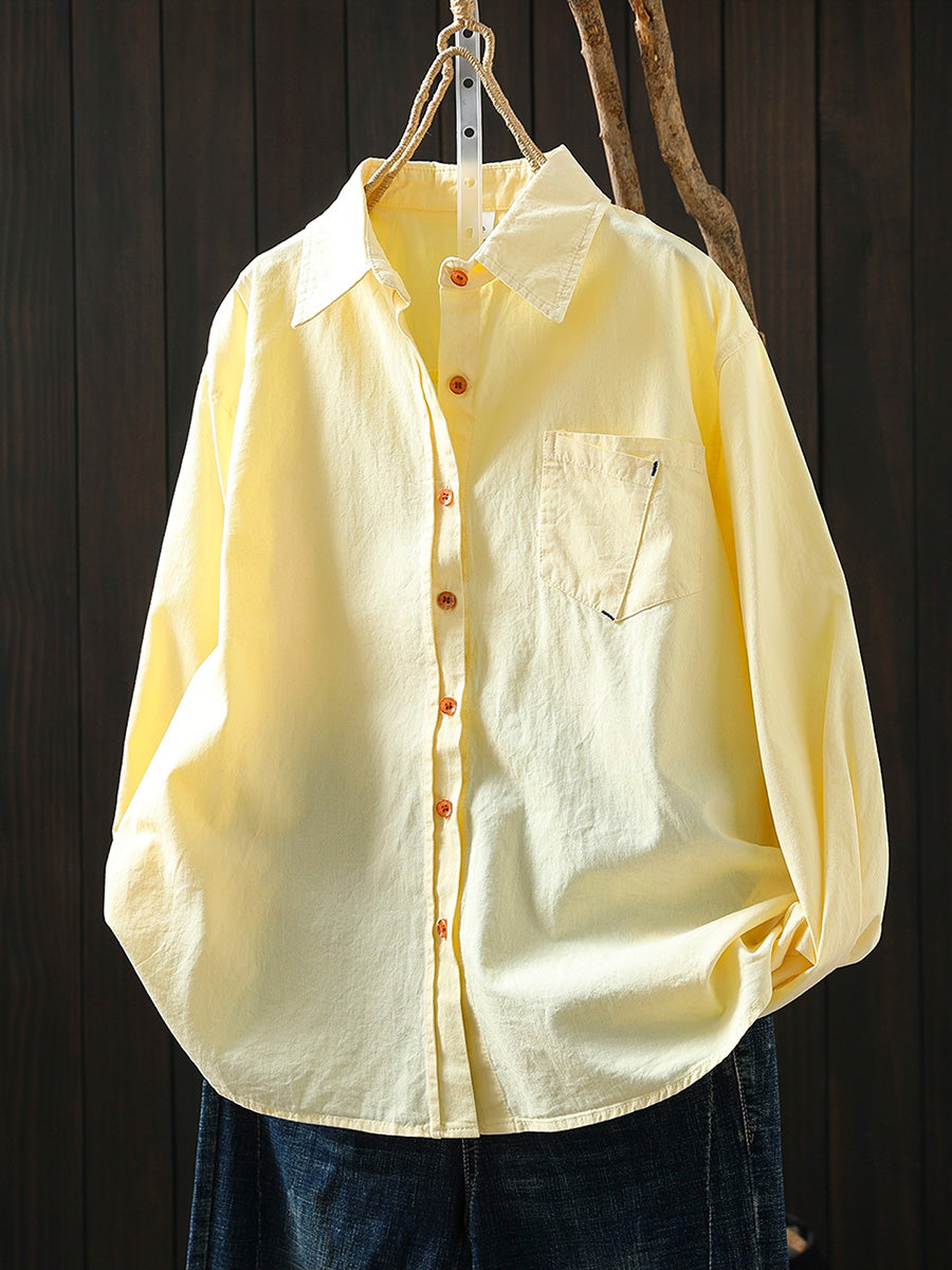 Women Artsy Spring Pure Color 100%Cotton Turn-down Collar Shirt