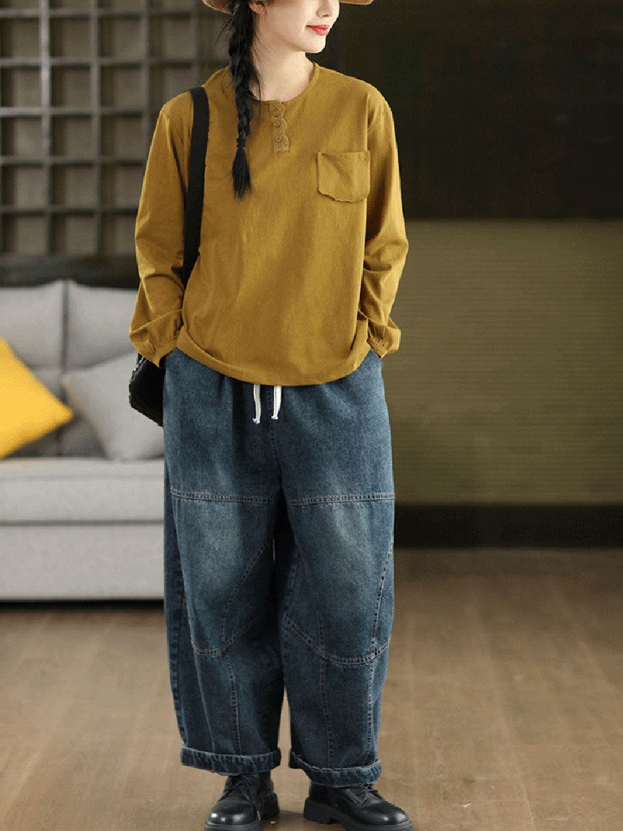Women Artsy Spring Pure Color Cotton O-Neck Blouse