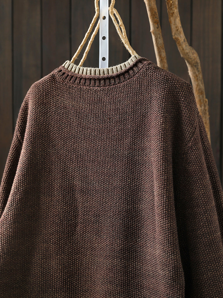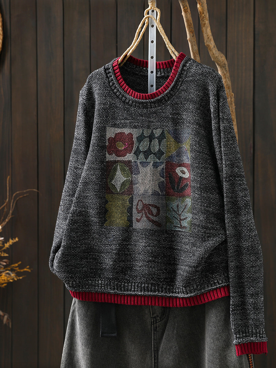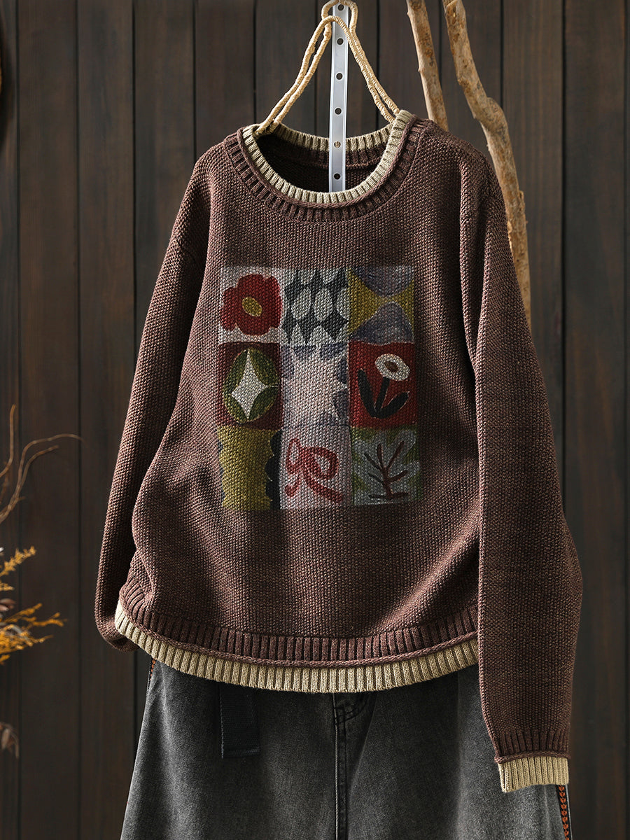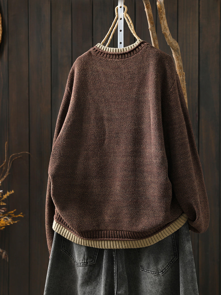 Women Autumn Artsy Colorblock Knitted O-Neck Sweater