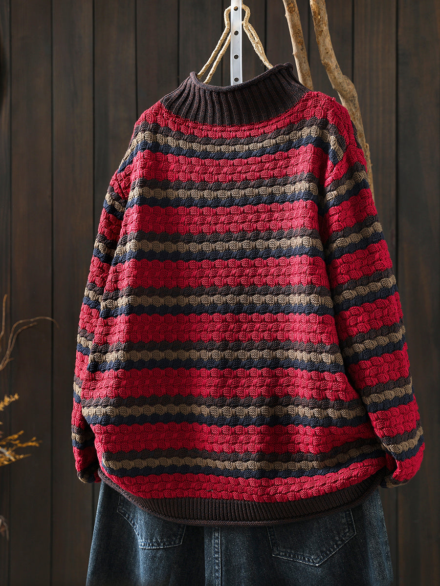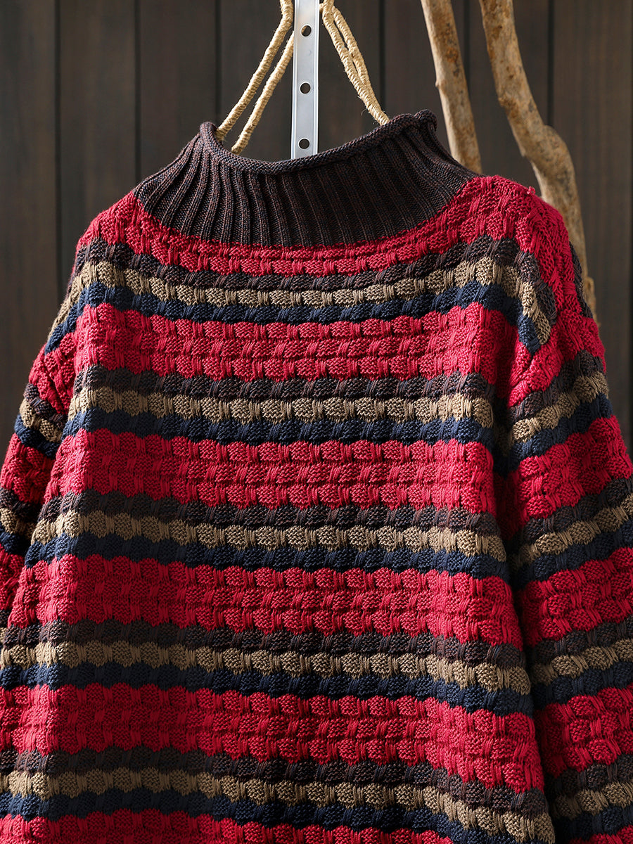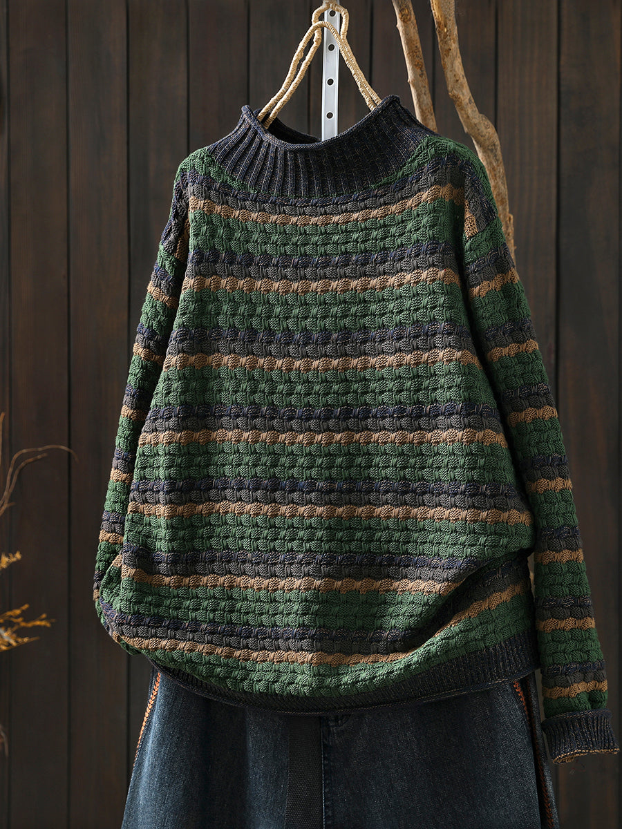 Women Autumn Artsy Colorblock Stripe Half-Turtleneck Sweater