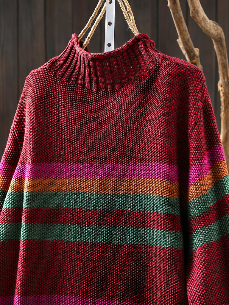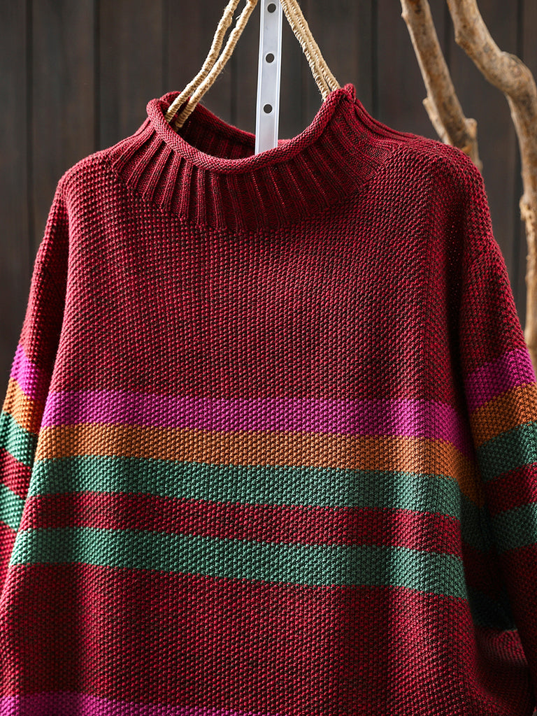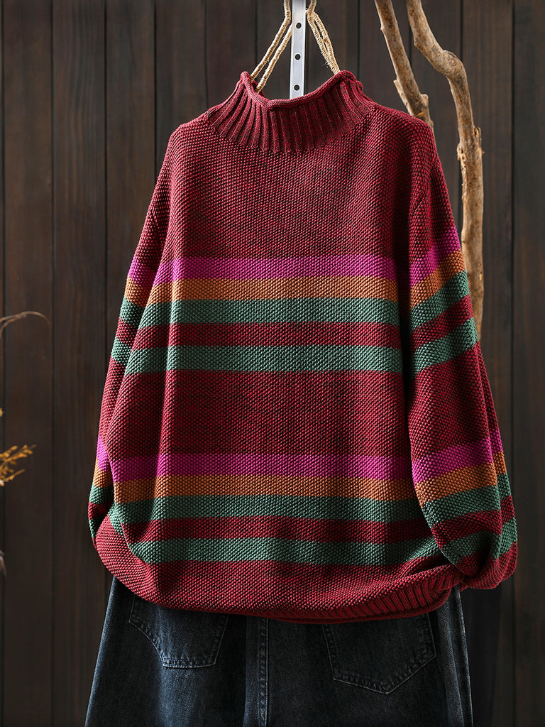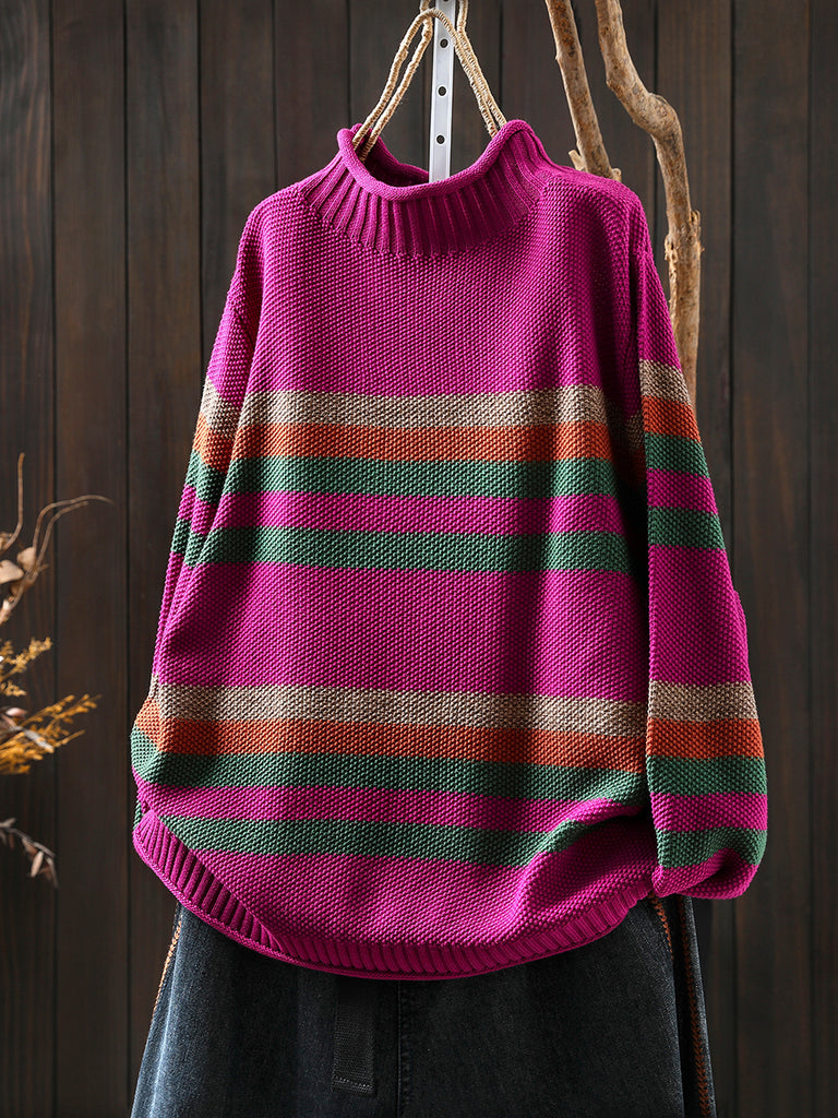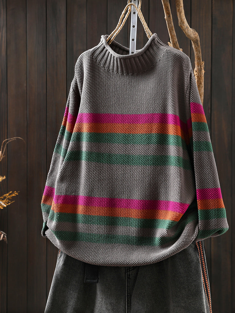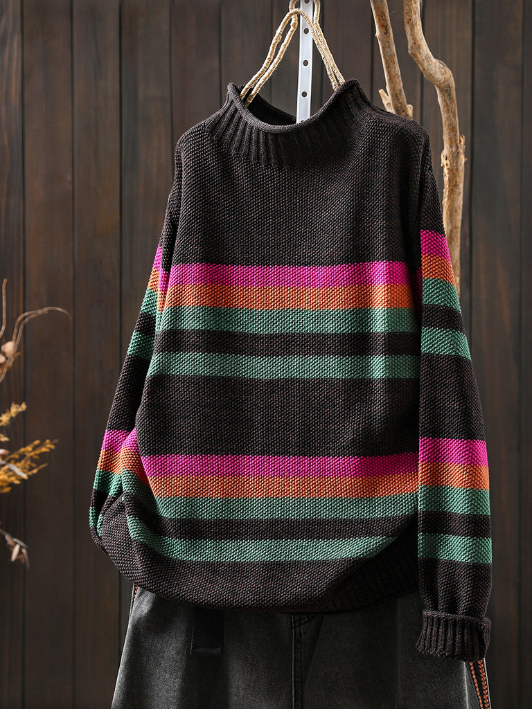 Women Autumn Artsy Stripe Half-Turtleneck Sweater
