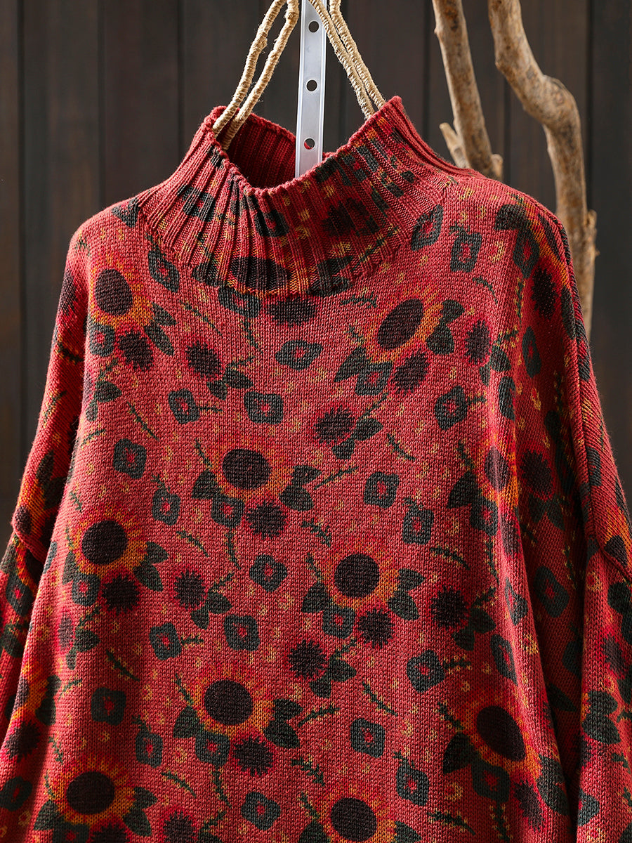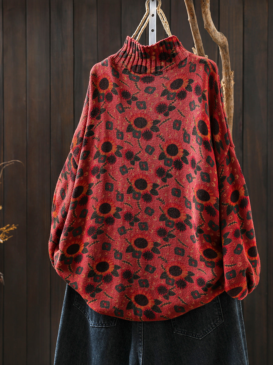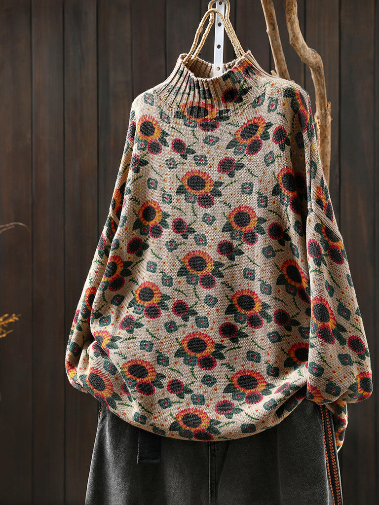 Women Autumn Artsy Sunflower Half-Turtleneck Sweater