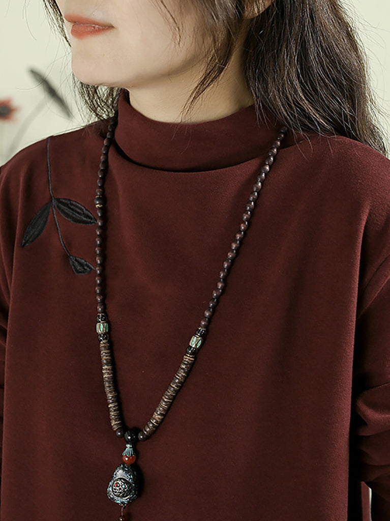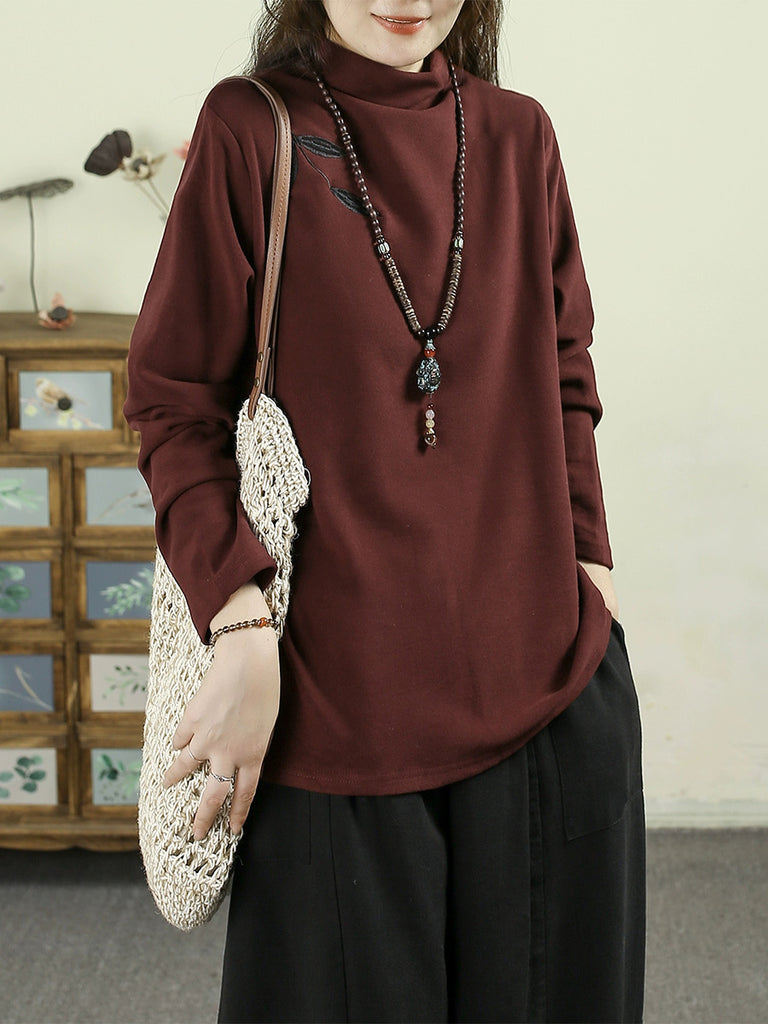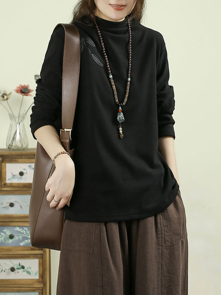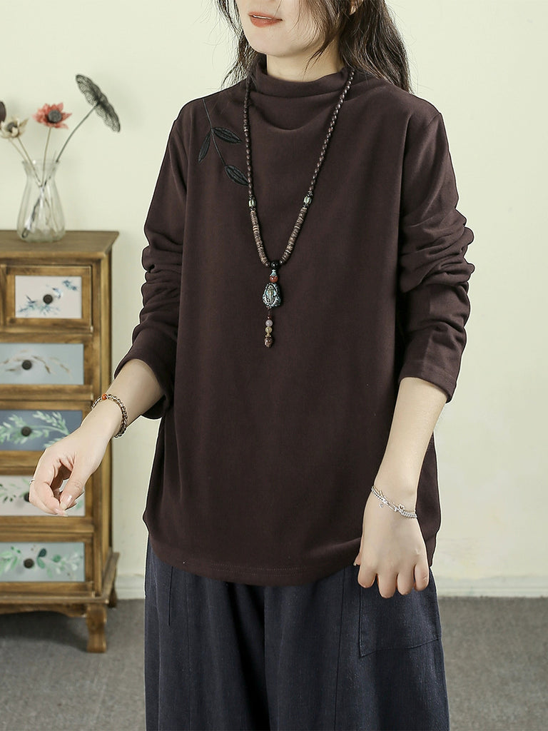 Women Autumn Casual Embroidery Half-Turtleneck Base Blouse