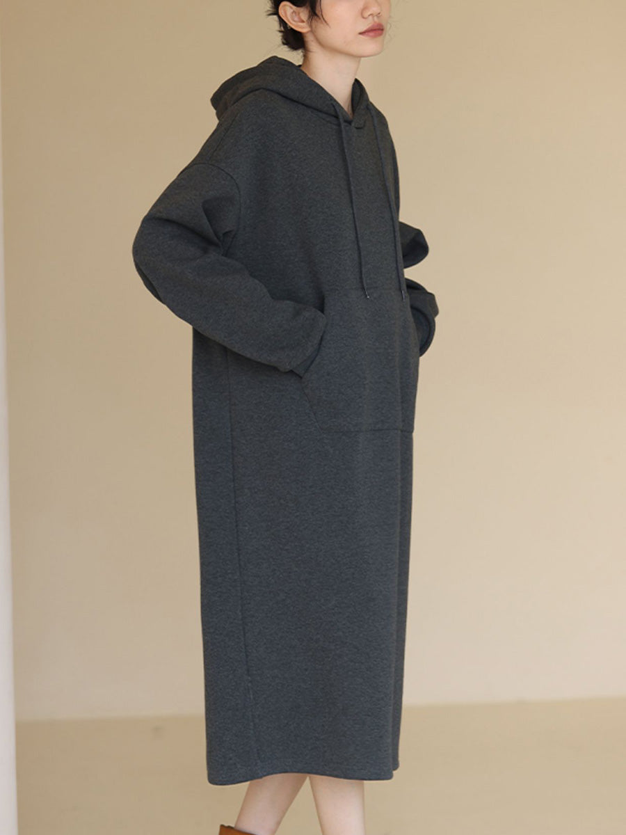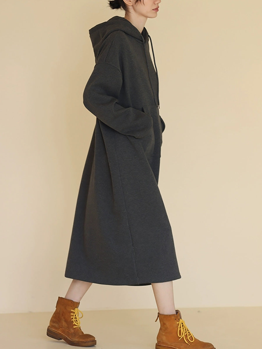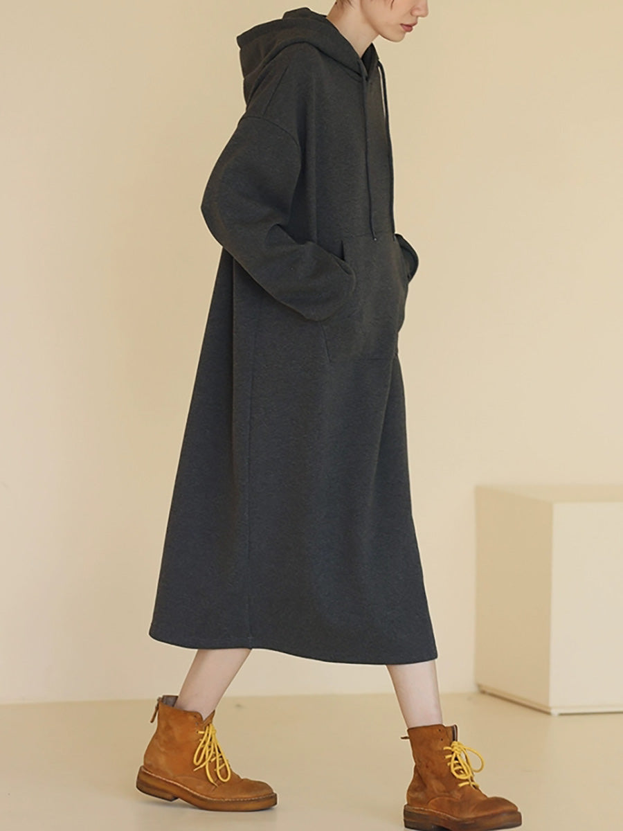 Women Autumn Casual Pure Color Hooded Long Dress