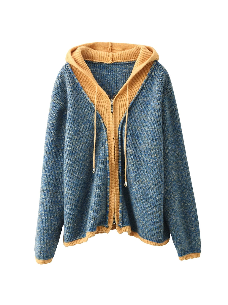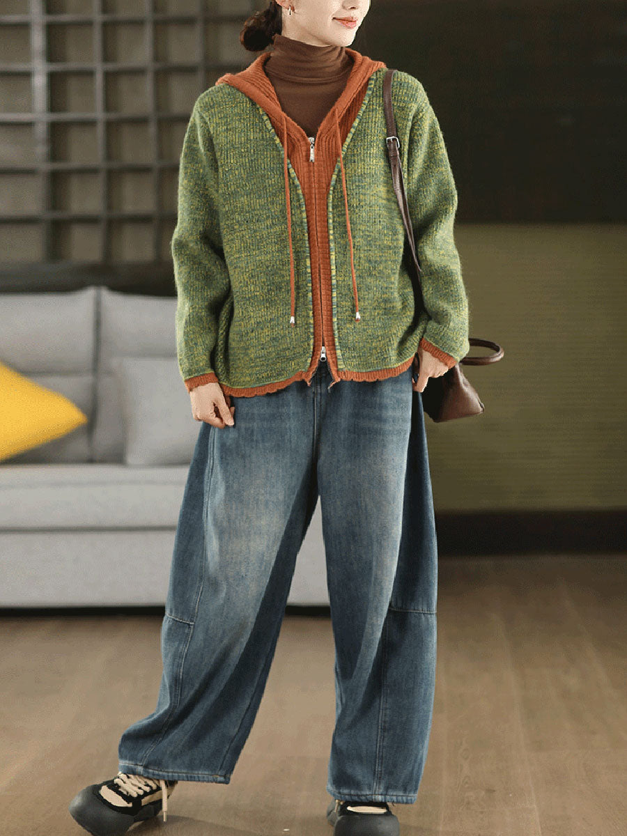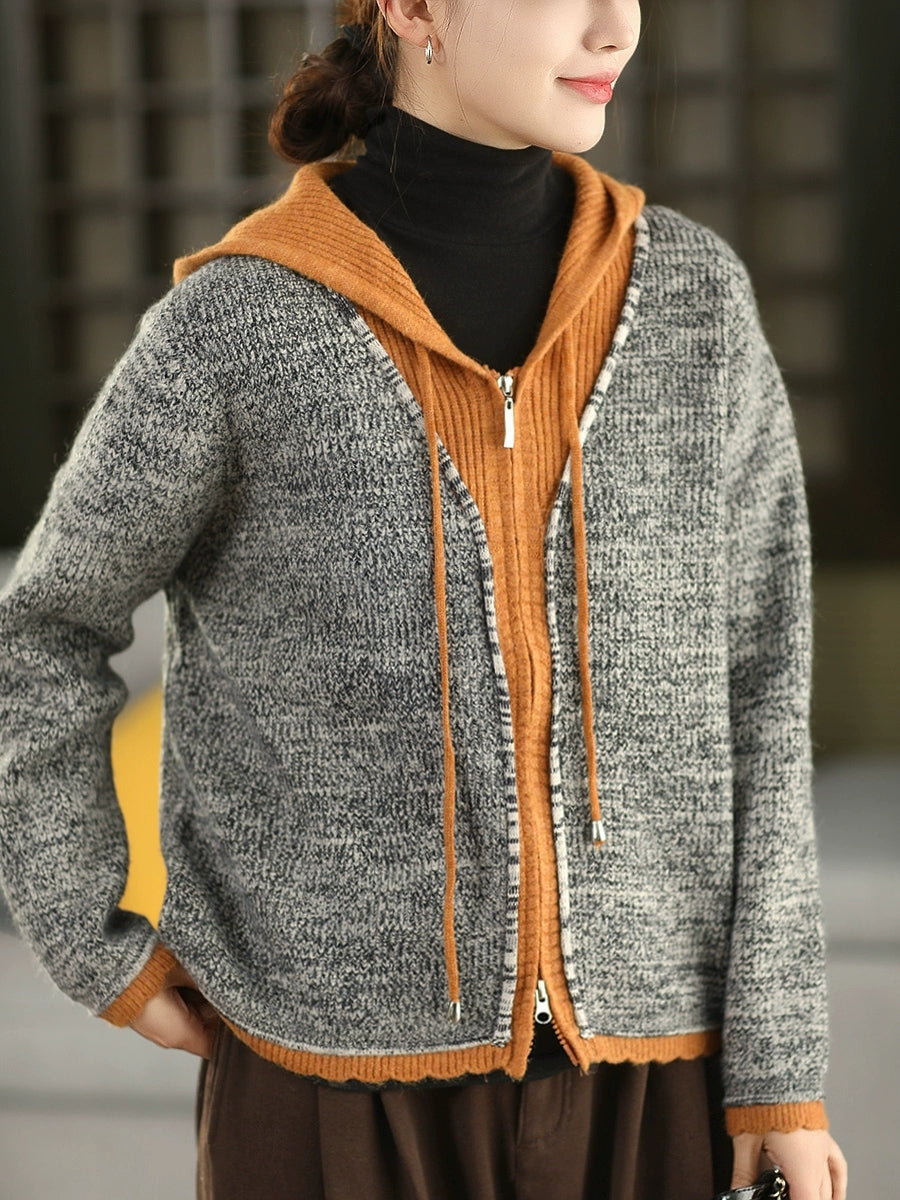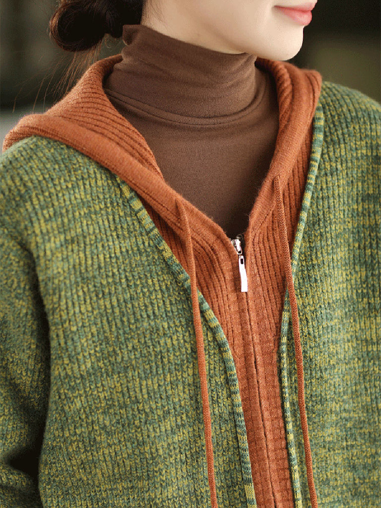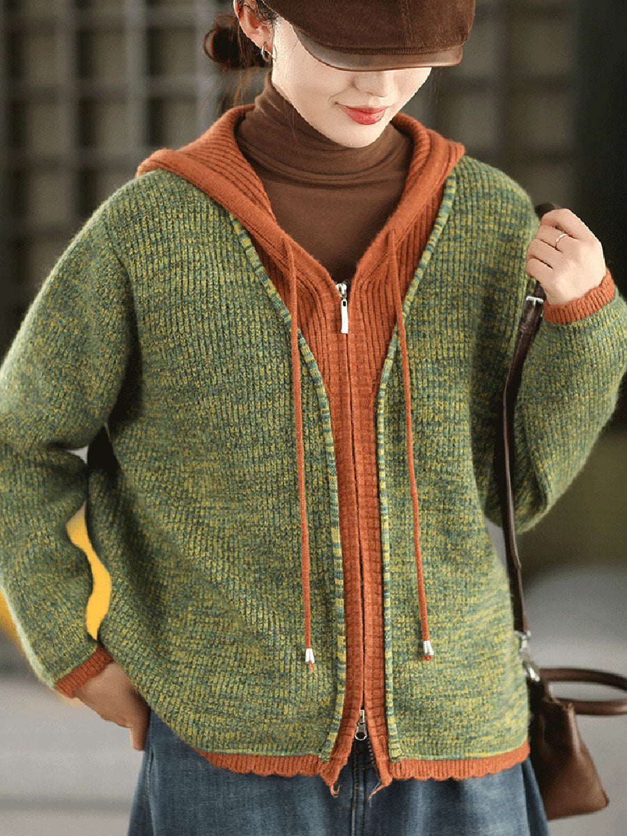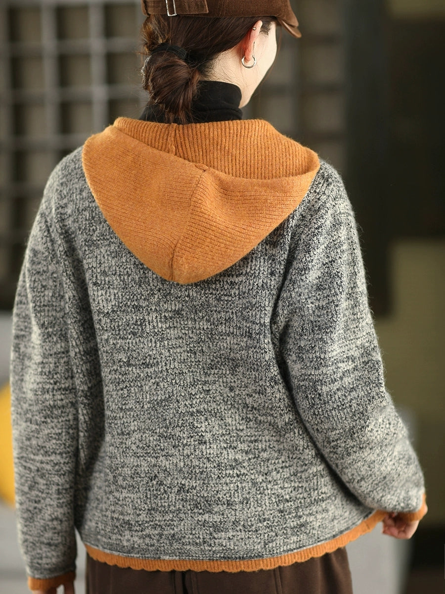 Women Autumn Retro Colorblock Hooded Sweater Coat