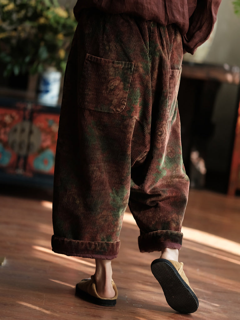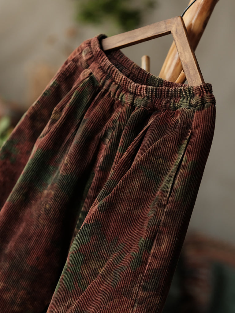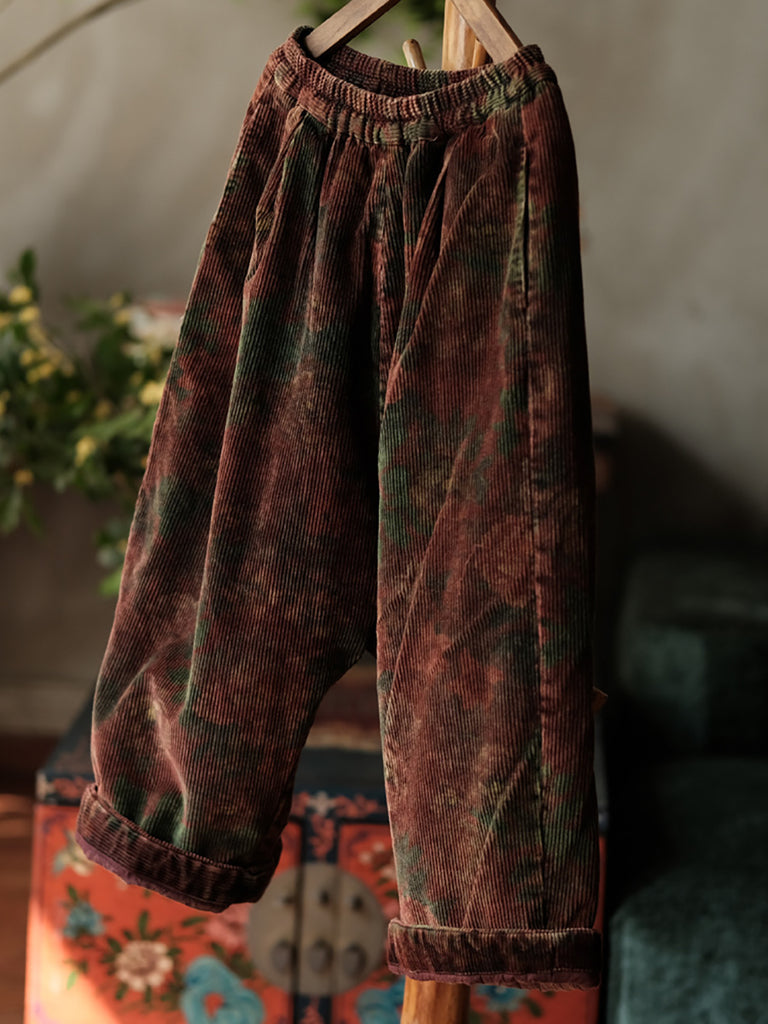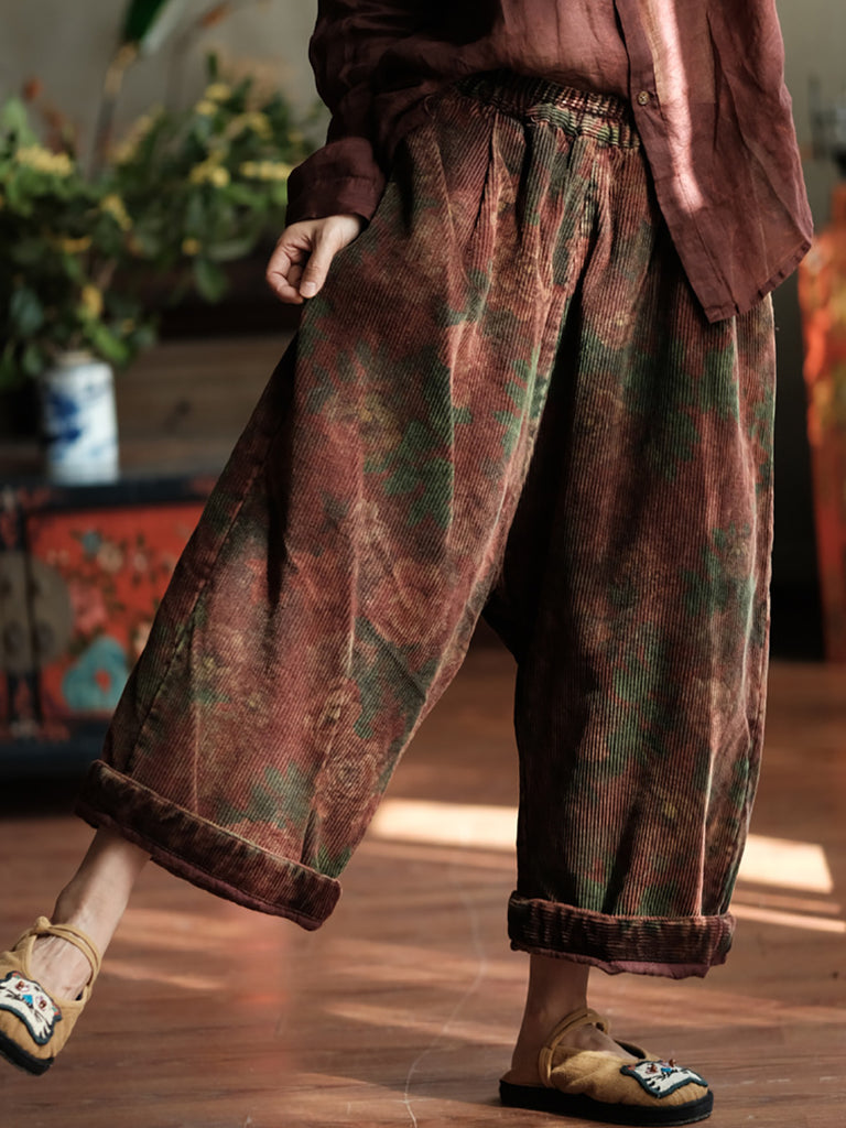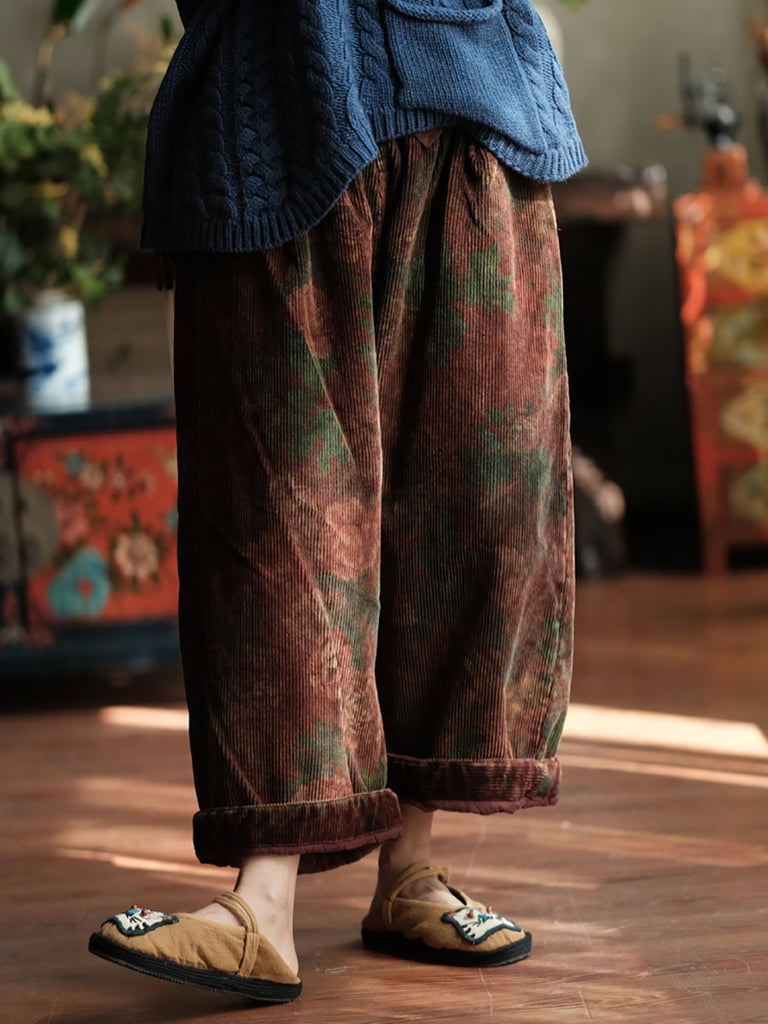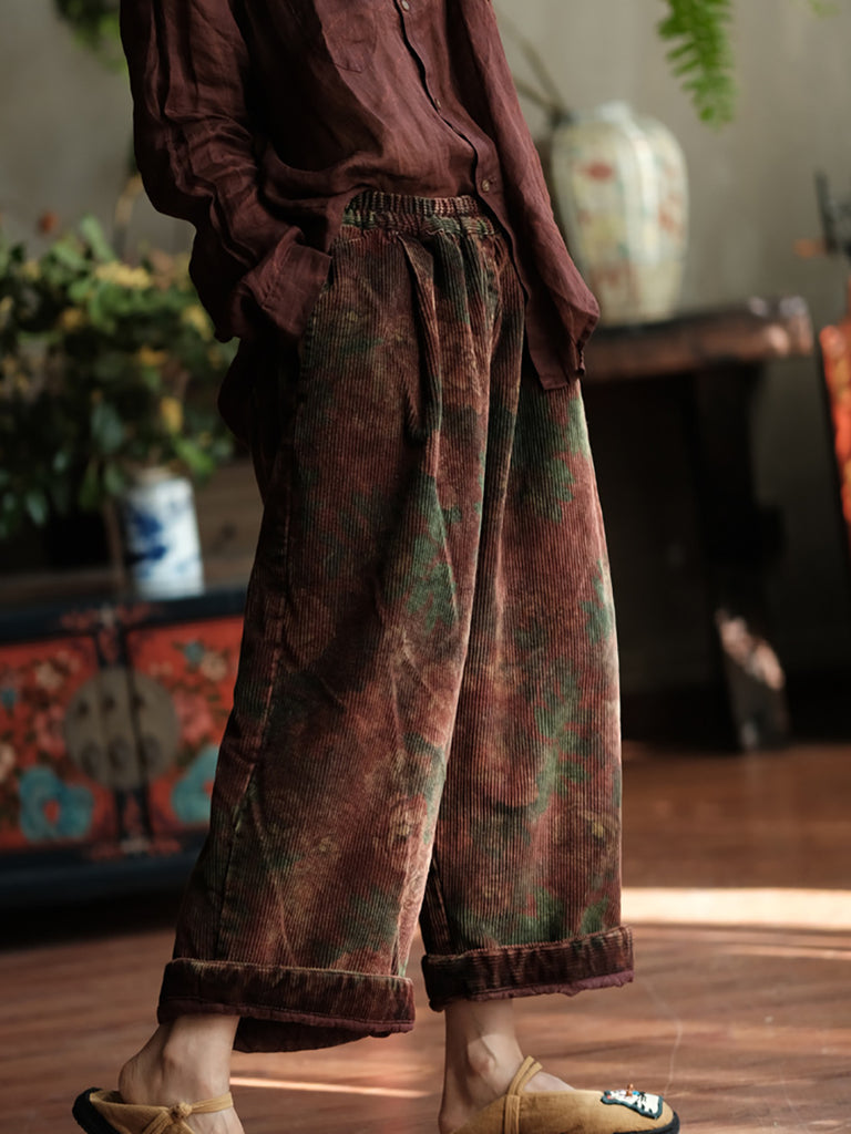 Women Autumn Retro Flower Corduroy Wide-leg Pants