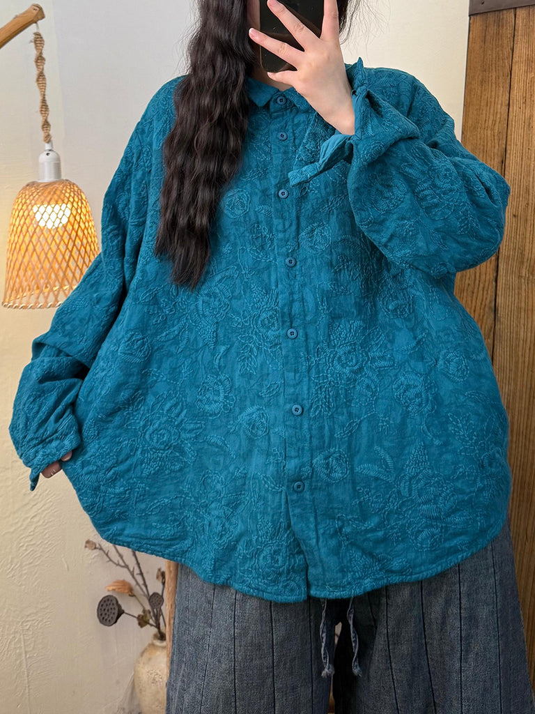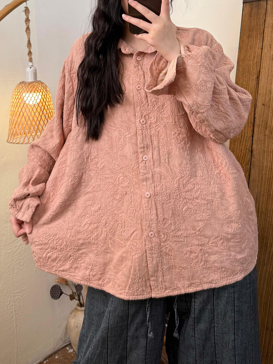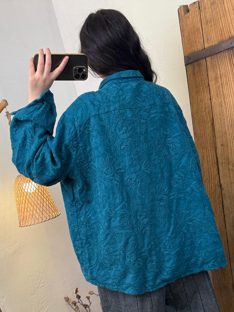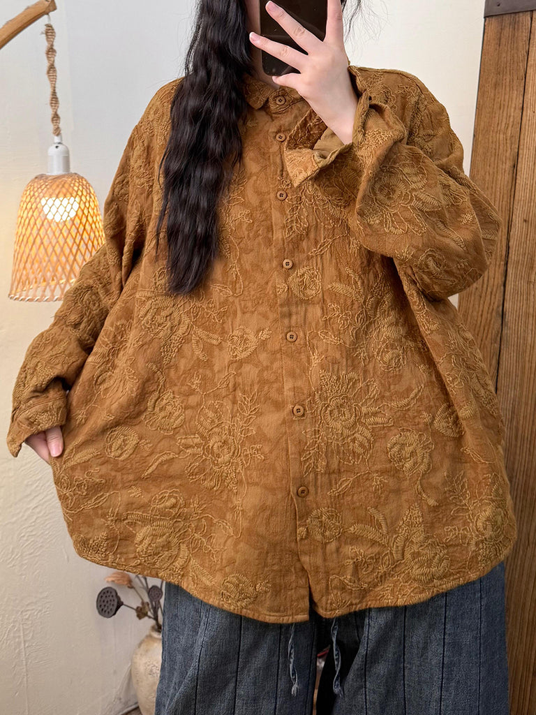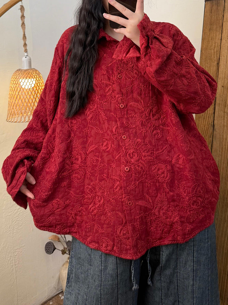 Women Autumn Retro Flower Embroidery Turn-down Collar Shirt