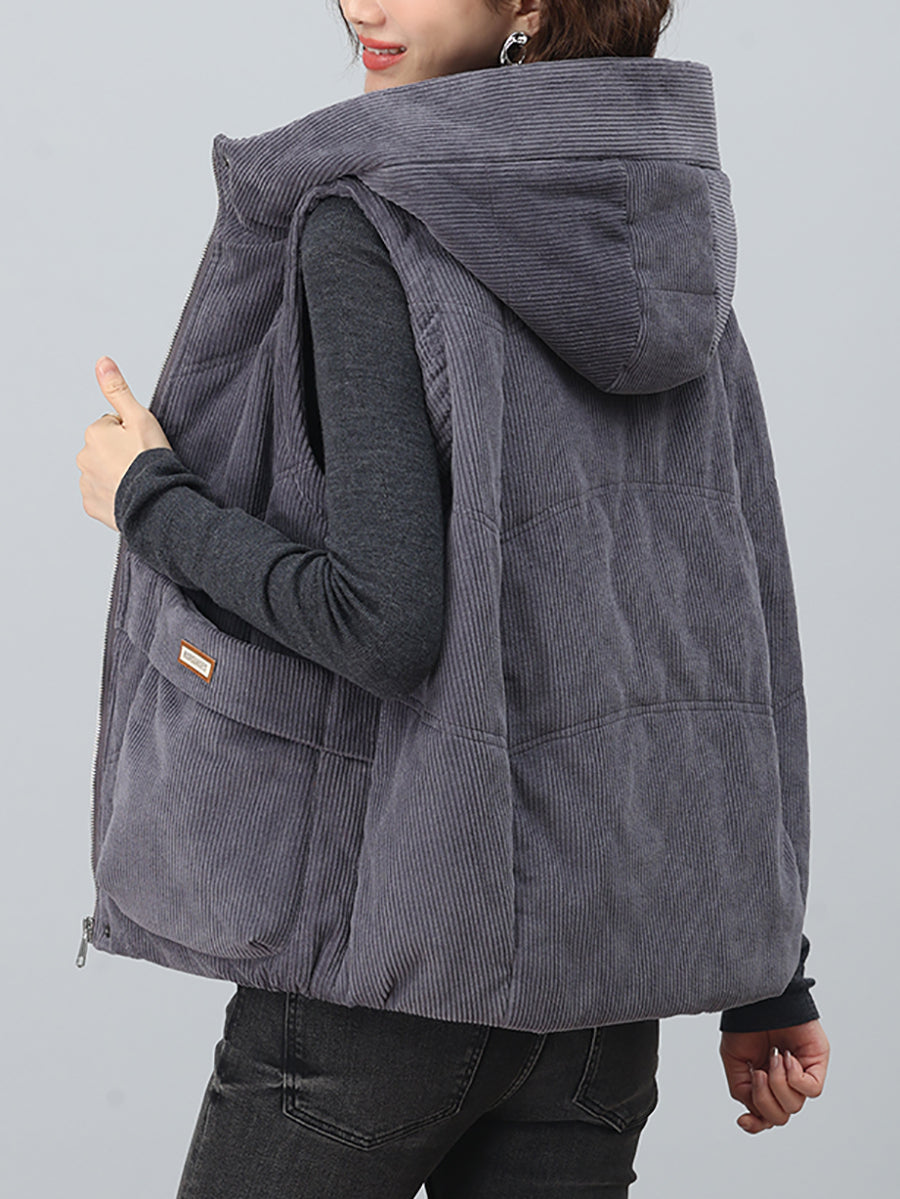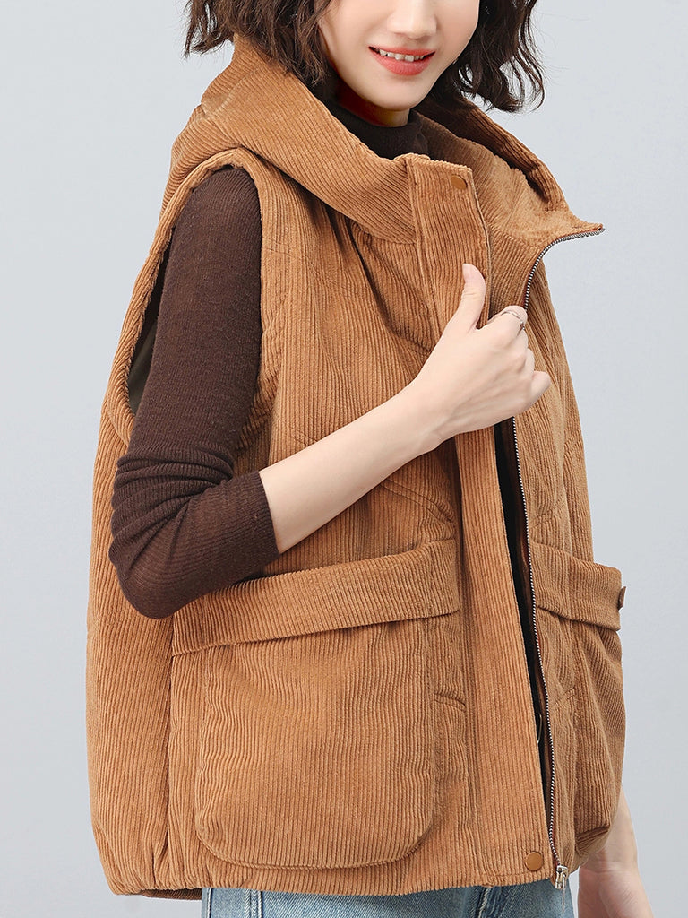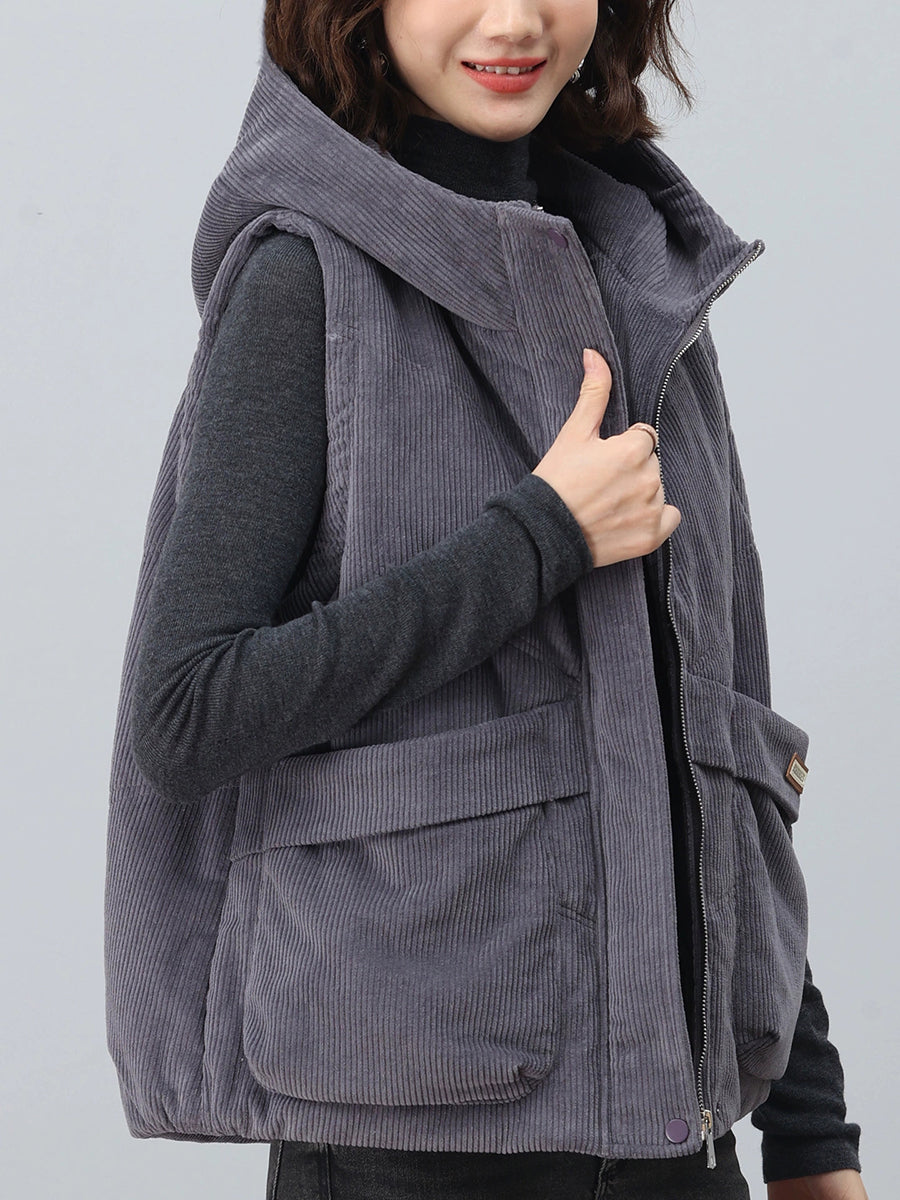 Women Autumn Retro Pure Color Hooded Corduroy Vest