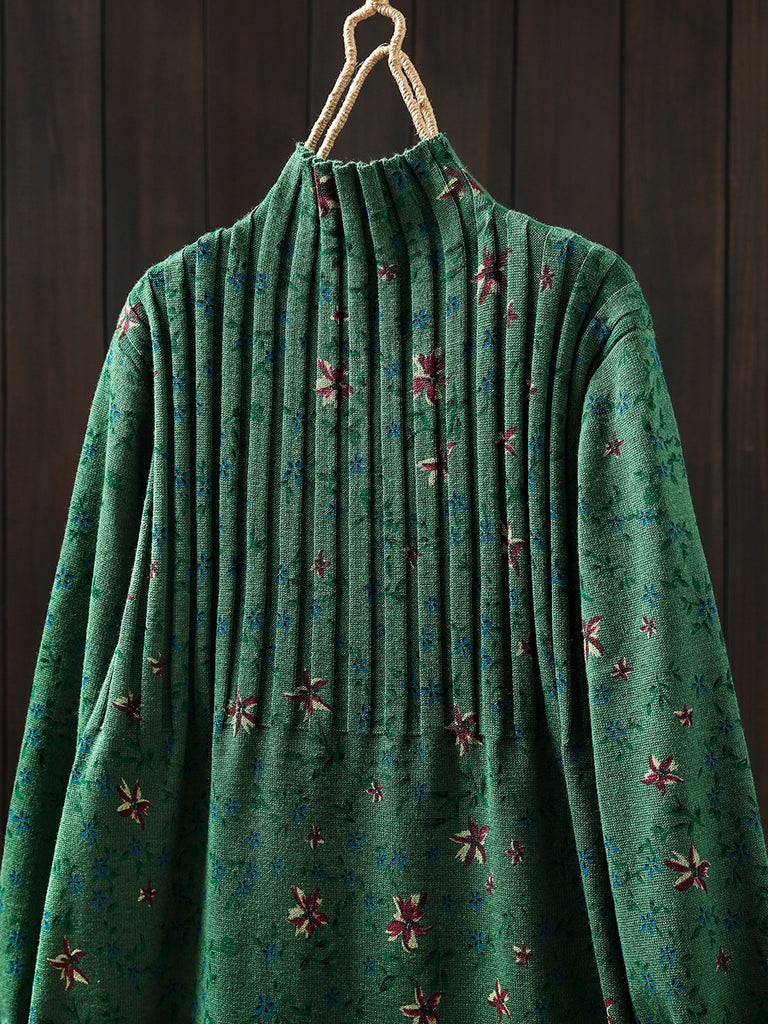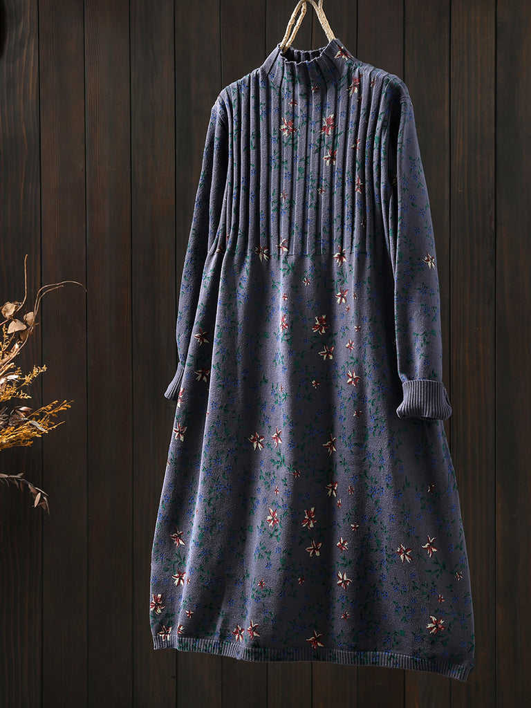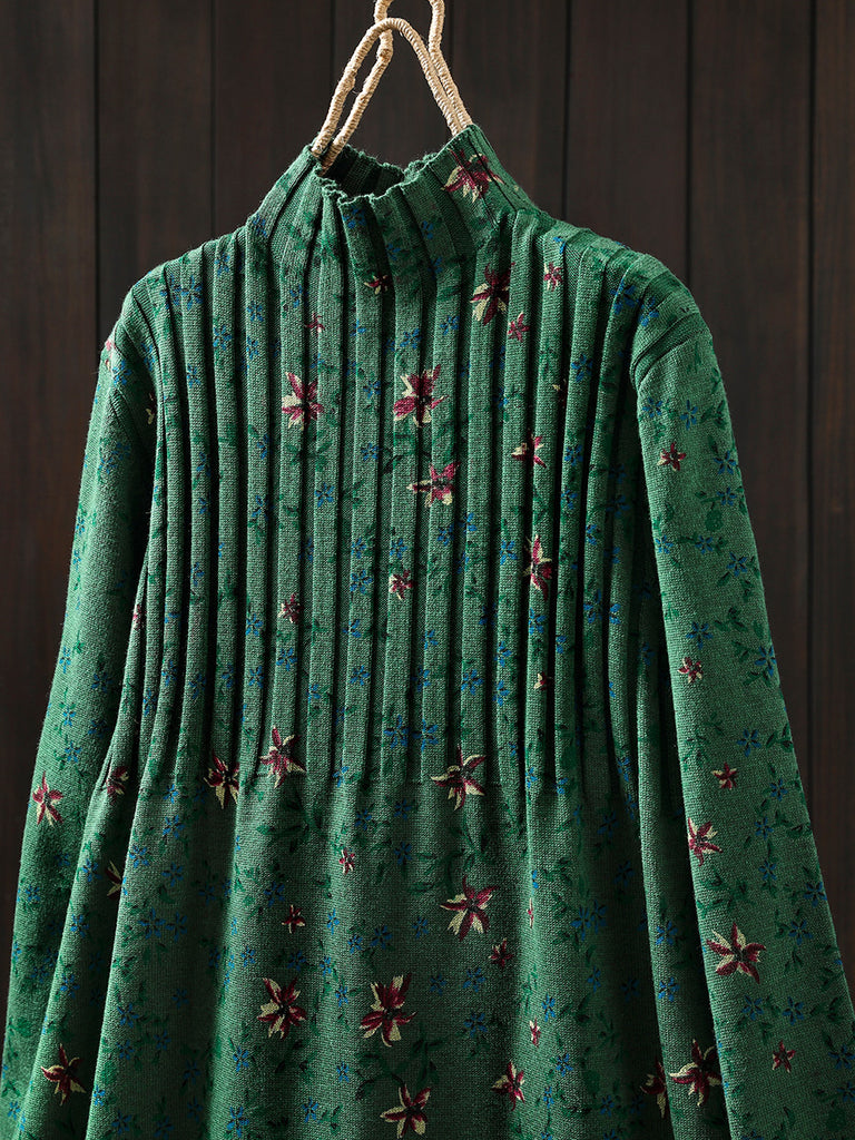 Women Autumn Vintage Floral Half-Turtleneck Knitted Dress