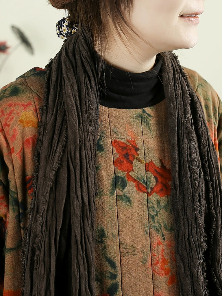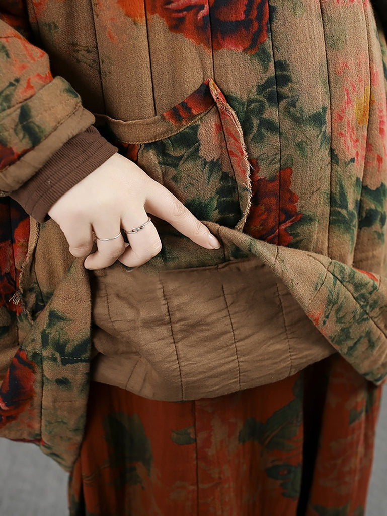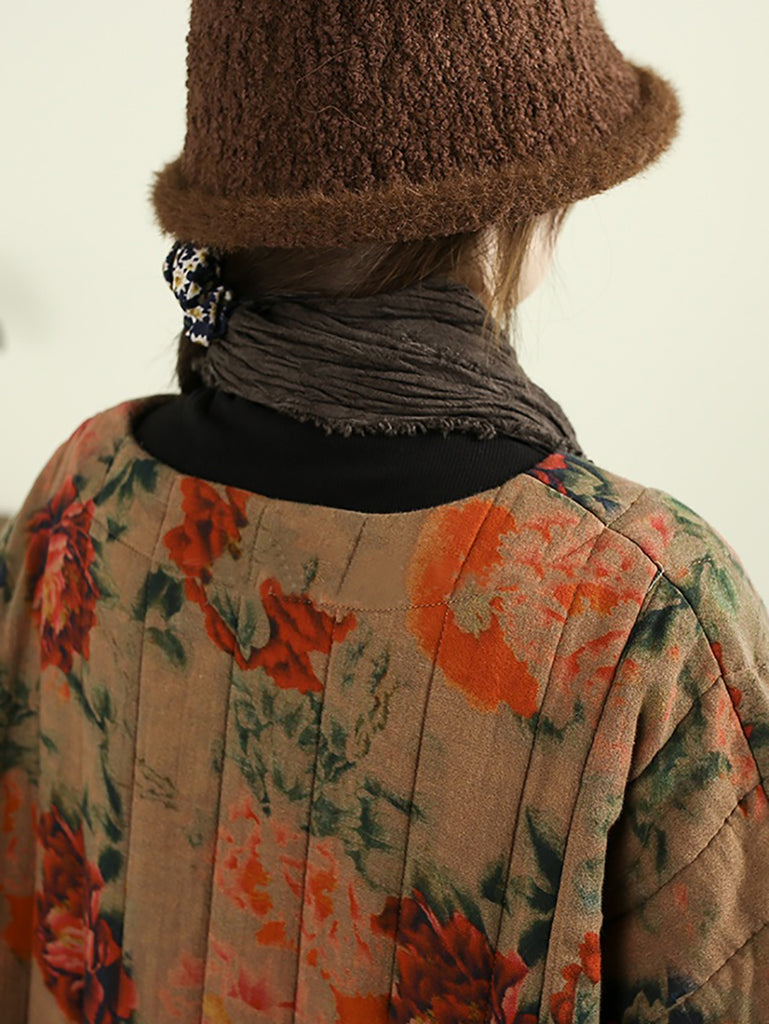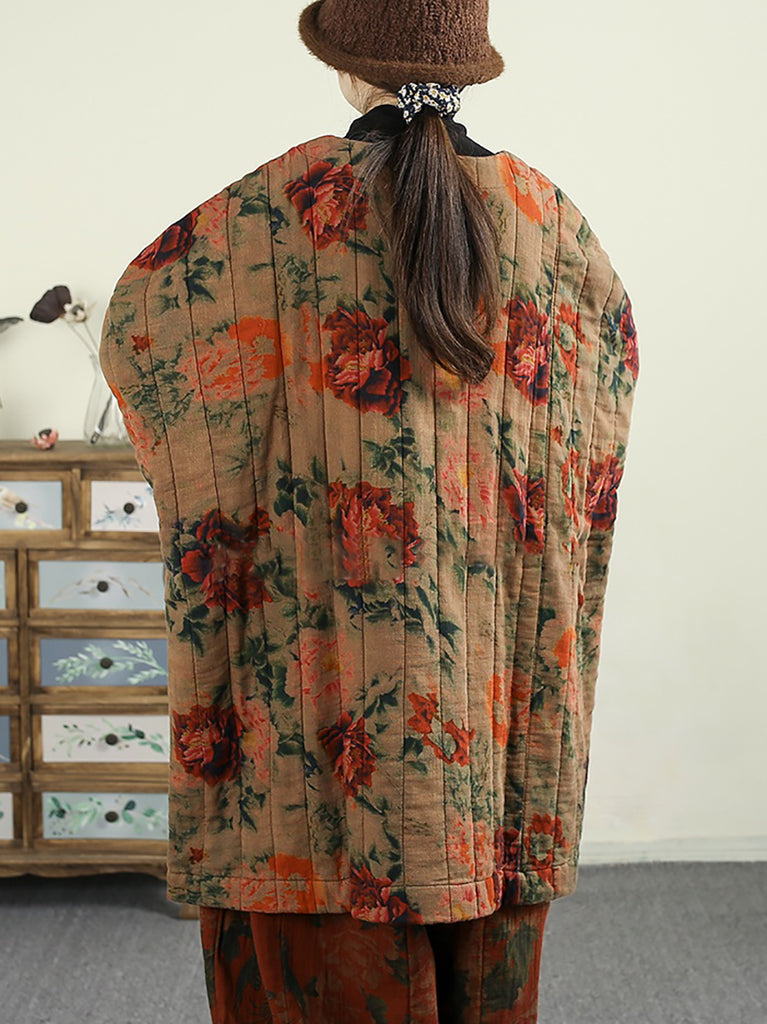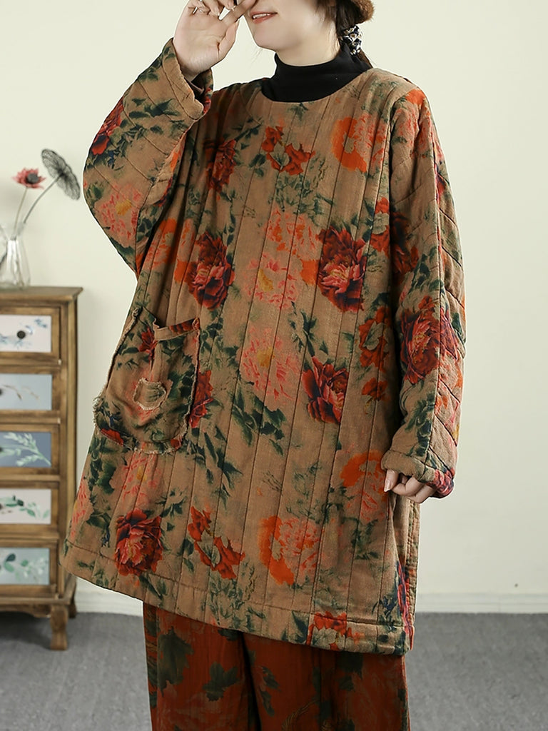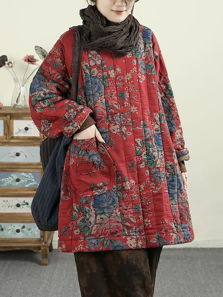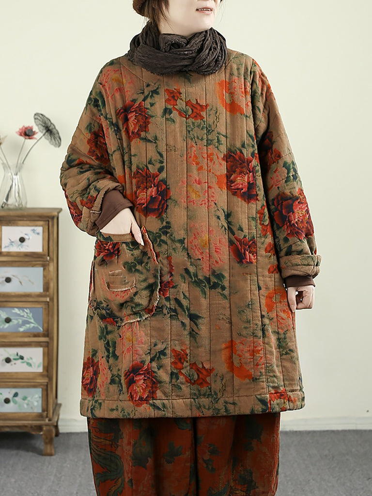 Women Autumn Vintage O-Neck Flower Cotton Padded Coat