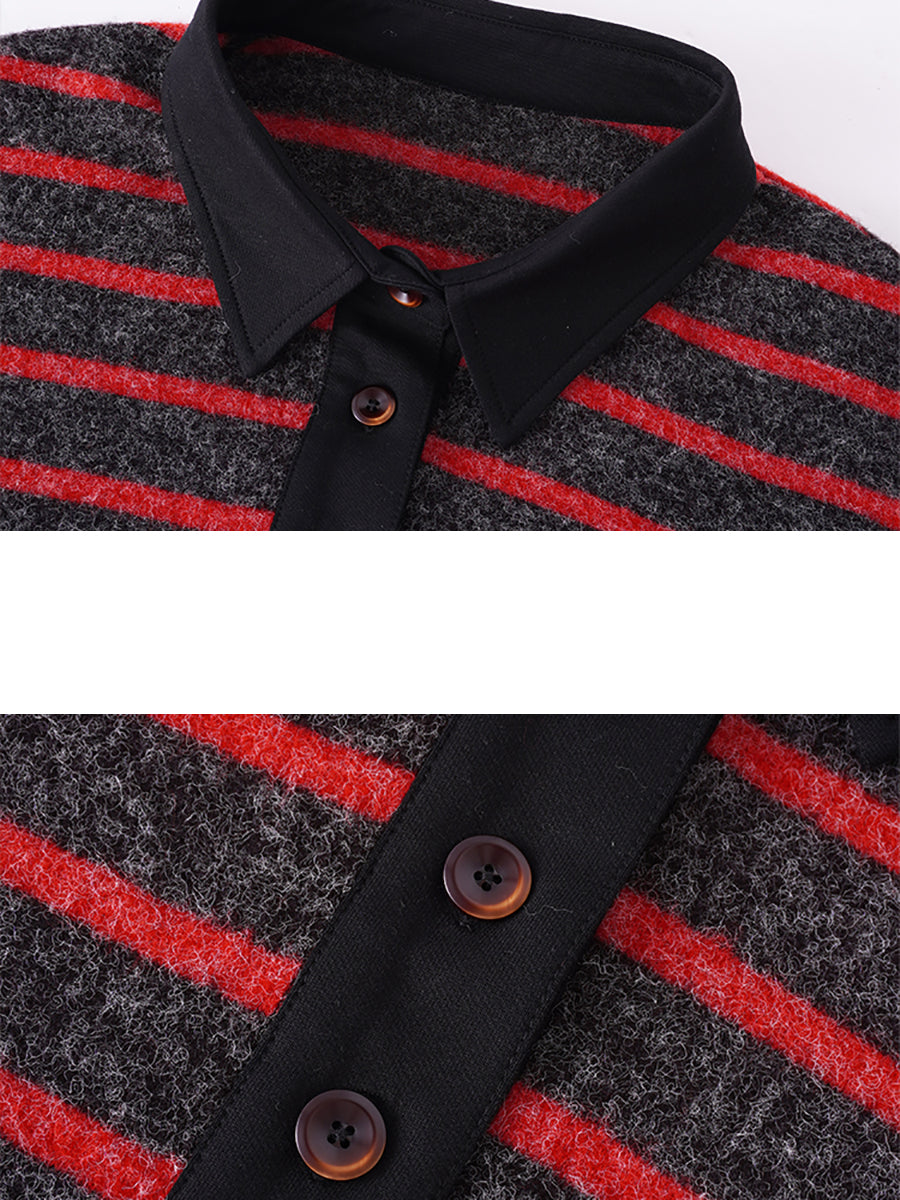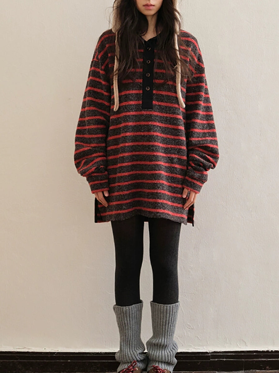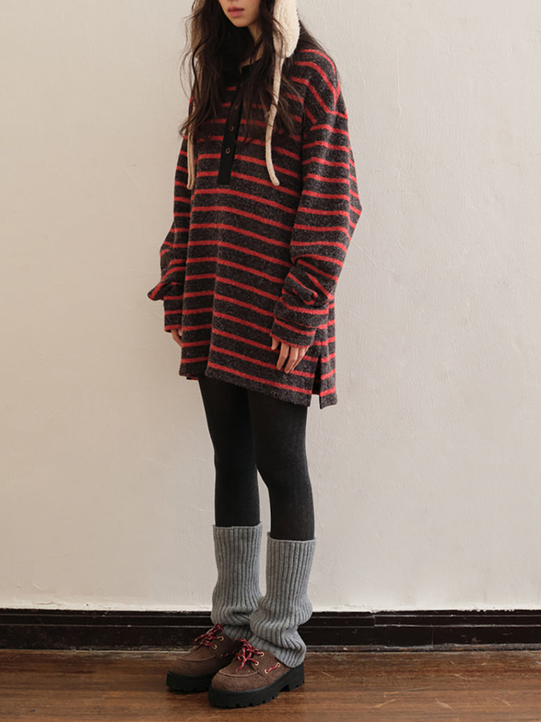 Women Autumn Vintage Stripe POLO Collar Long Sweater