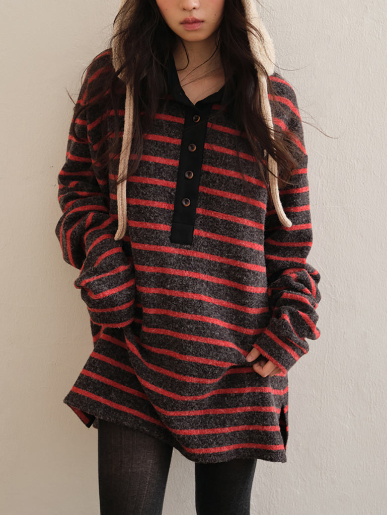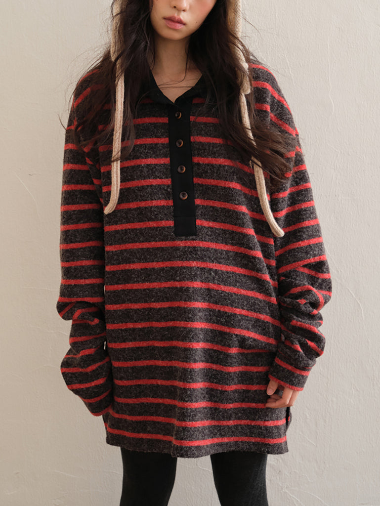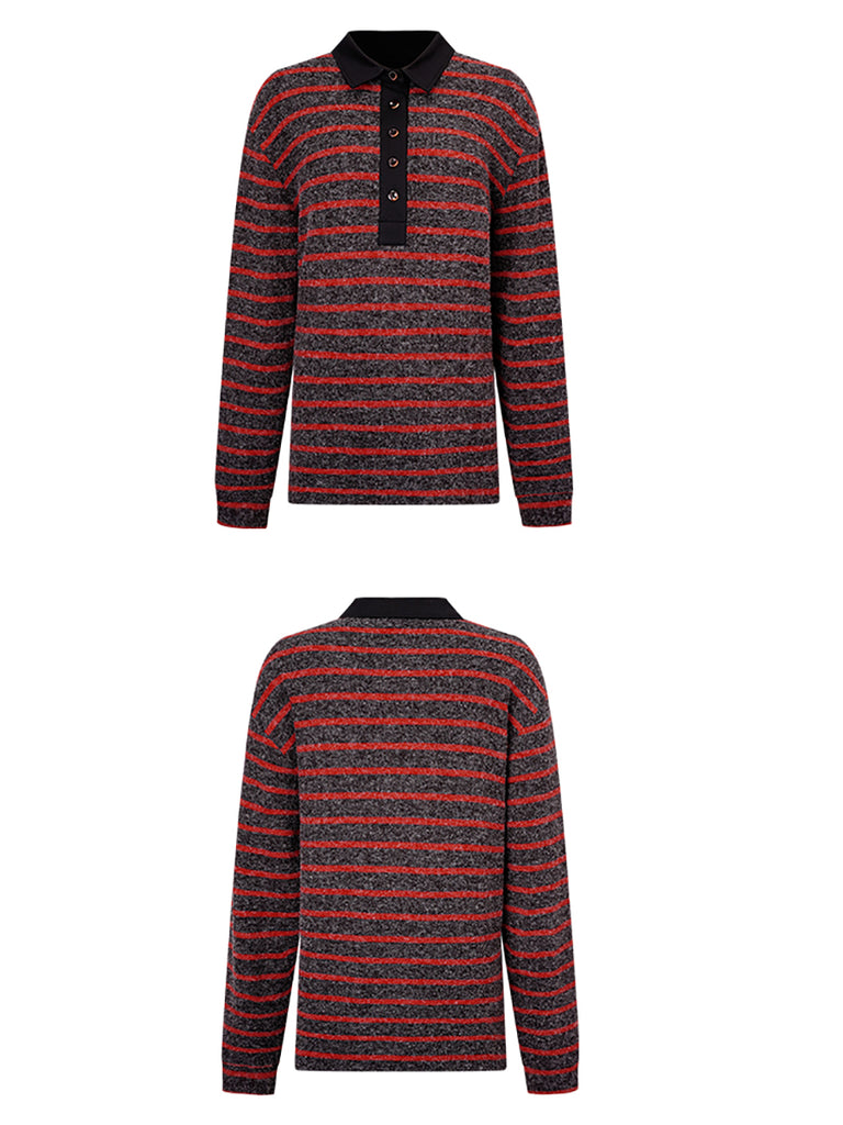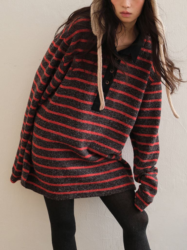 This sophisticated sweater combines vintage aesthetics with practical design, featuring a structured polo collar and extended raglan sleeves ideal for layering through autumn and winter. The striped detailing enhances its retro appeal while maintaining contemporary versatility. A refined wardrobe staple that transitions seamlessly from casual to polished occasions.