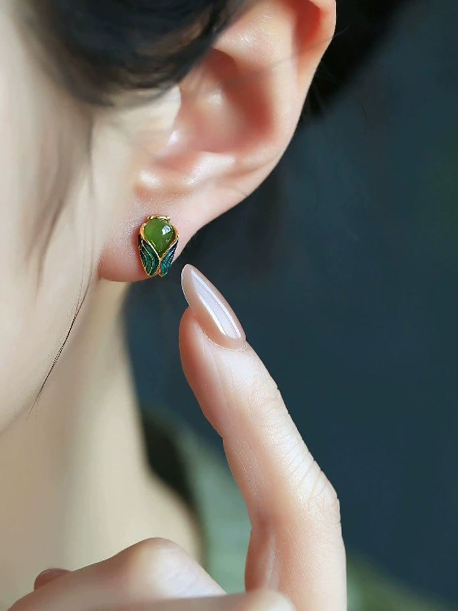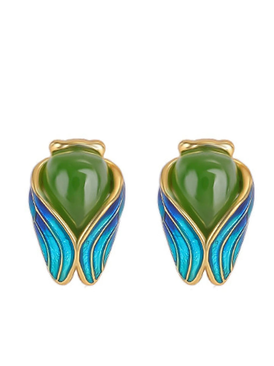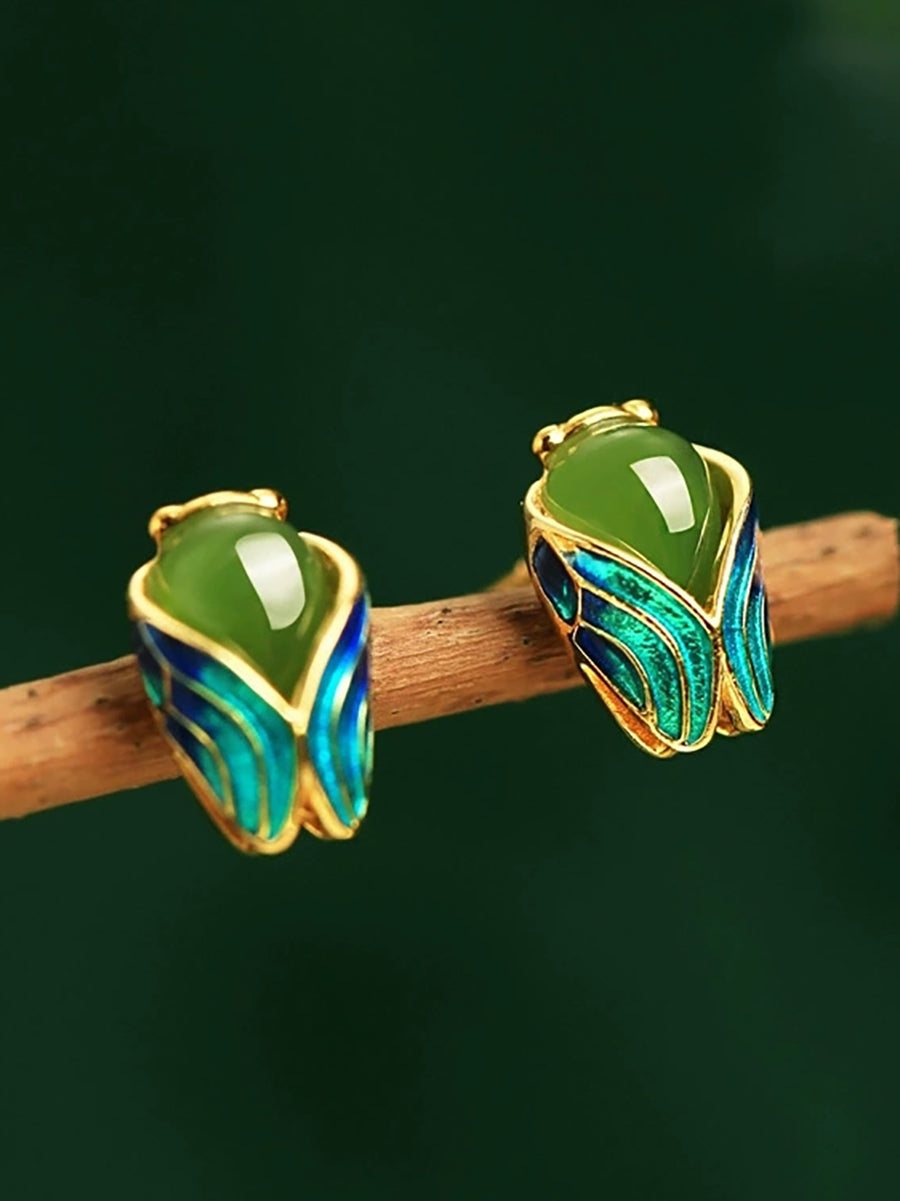 Women Ethnic Enamel Jade Golden Cicada Earring