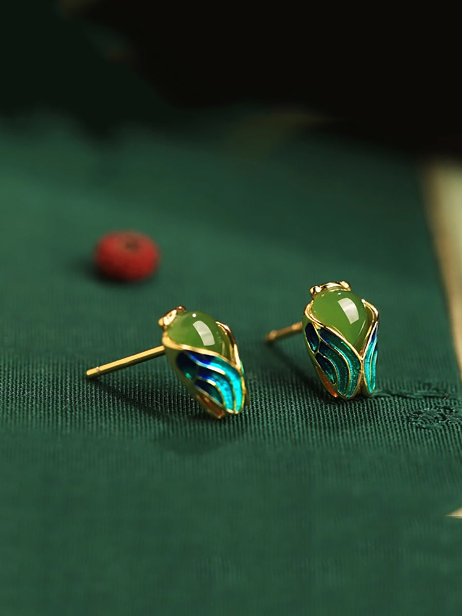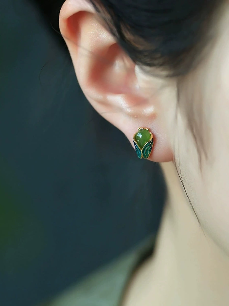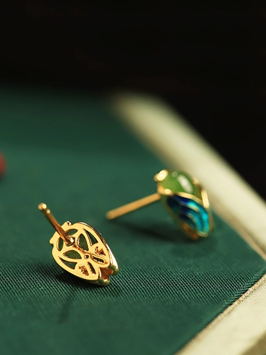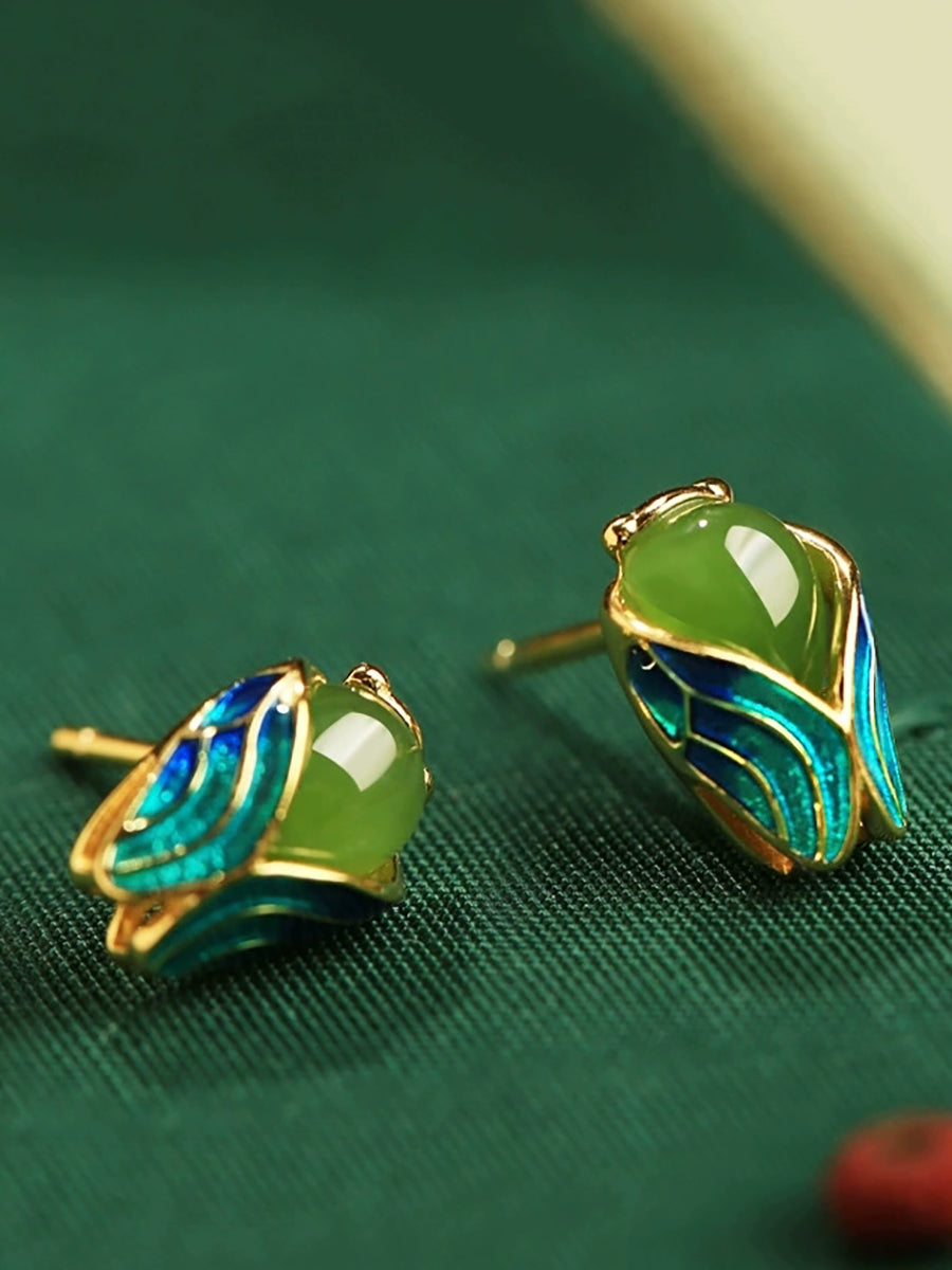 Women Ethnic Enamel Jade Golden Cicada Earring