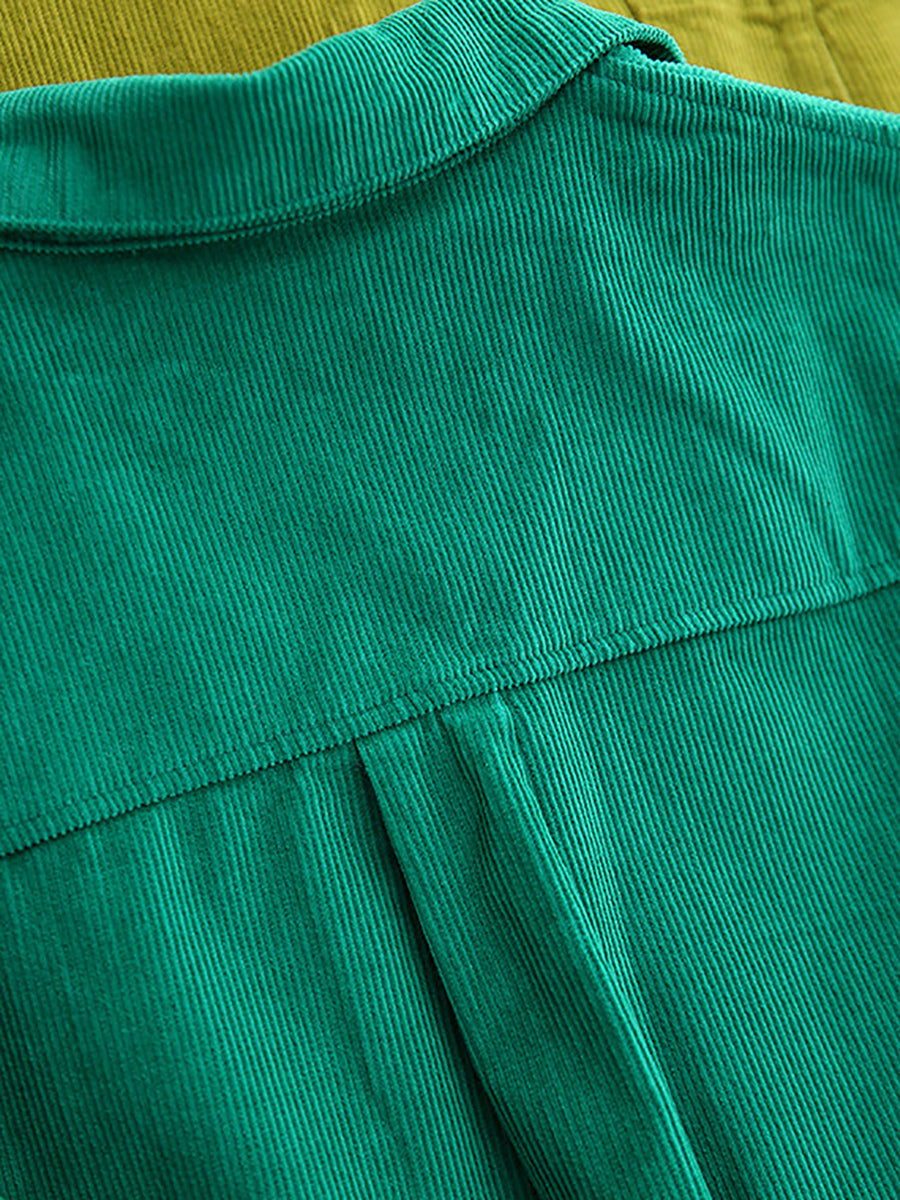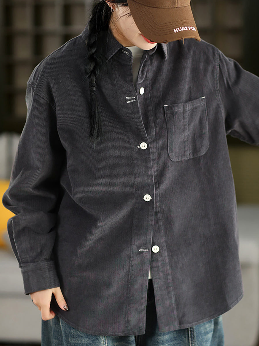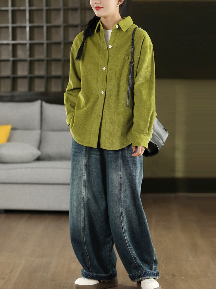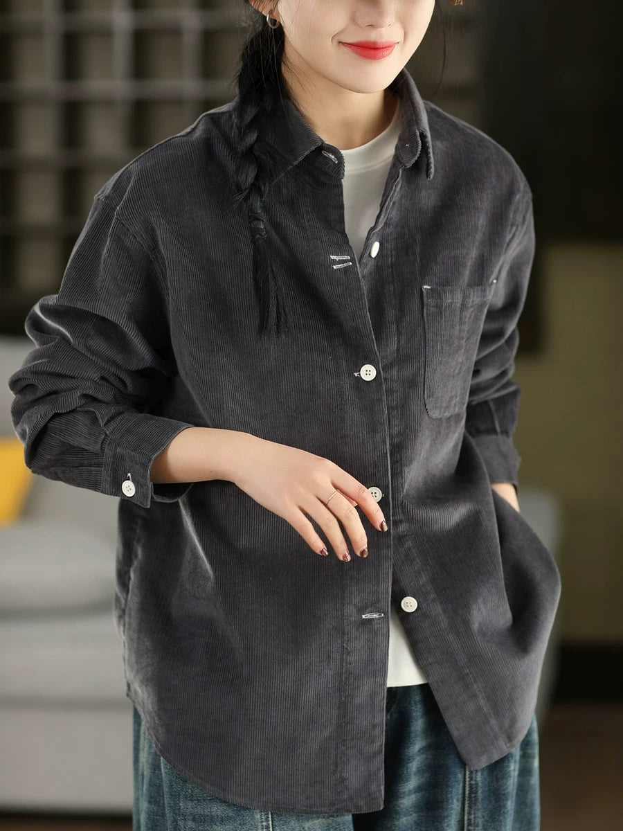 Women Retro Spring Pure Color Corduroy Turn-down Collar Shirt