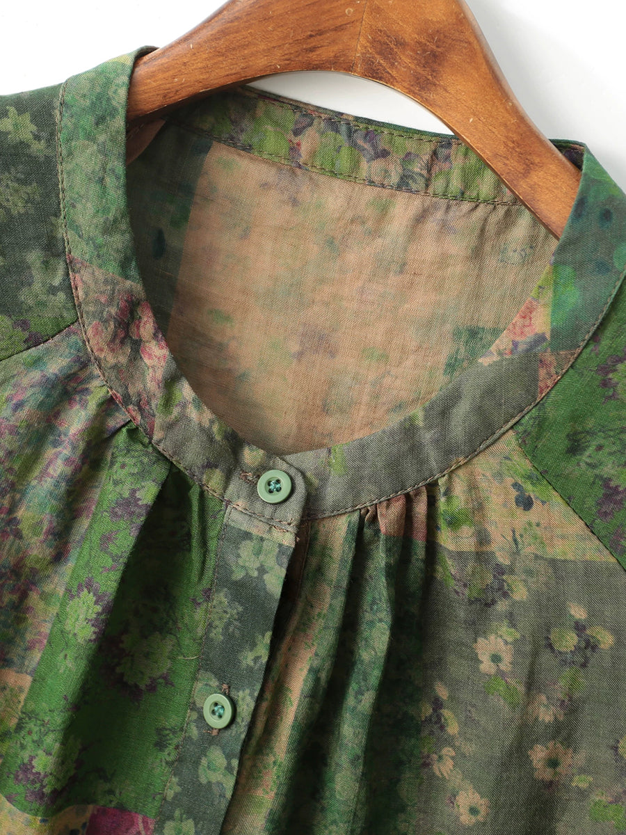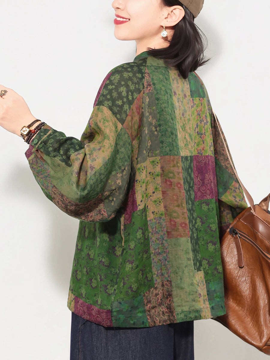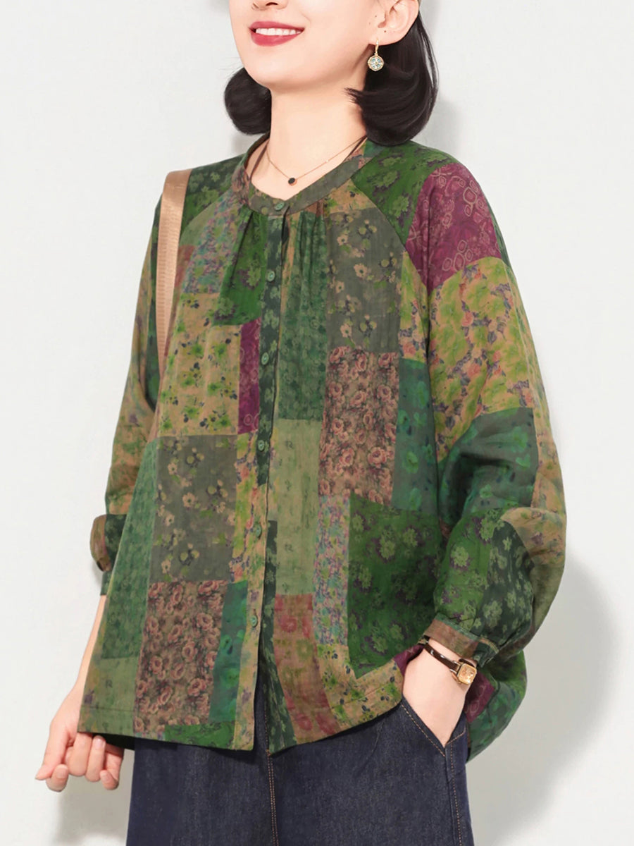 Women Spring Artsy Floral Patch Ramie Shirt