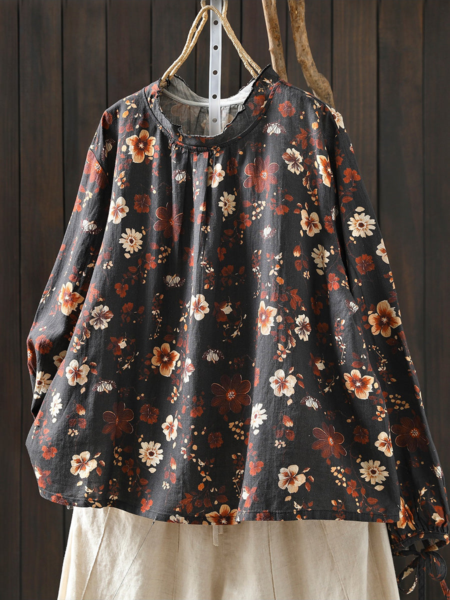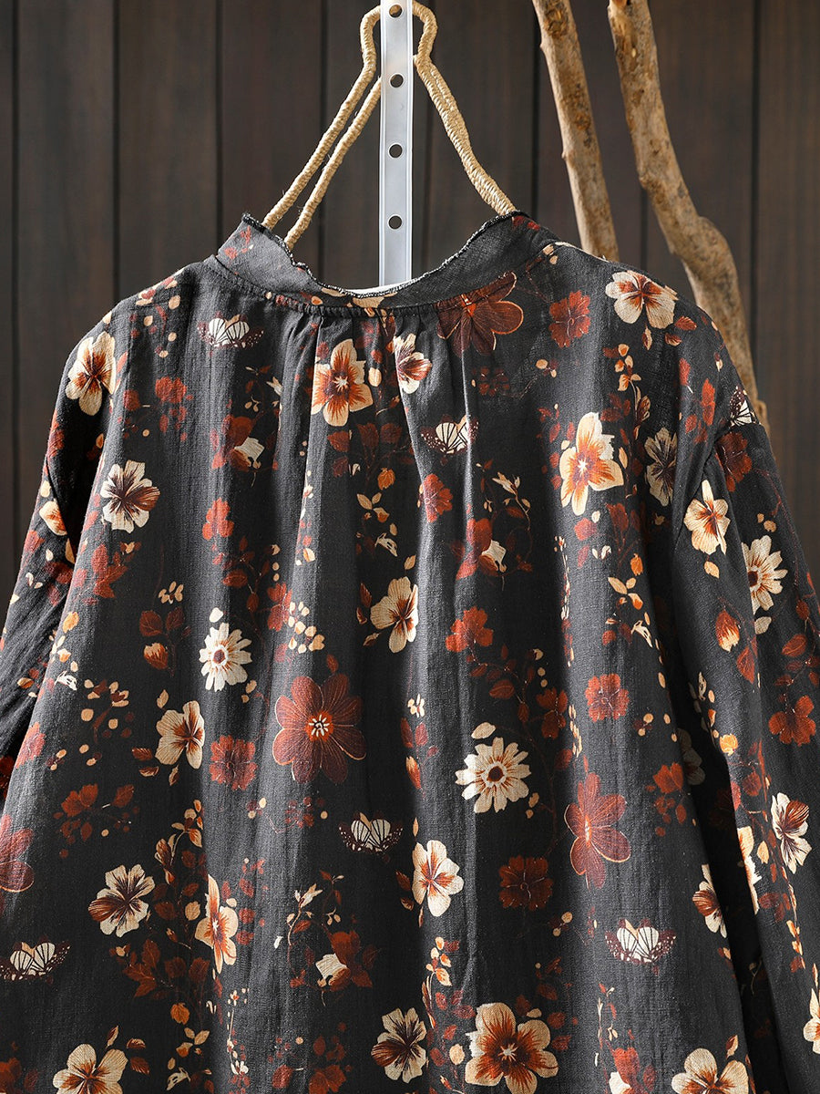 Women Spring Artsy Flower 100%Linen Blouse