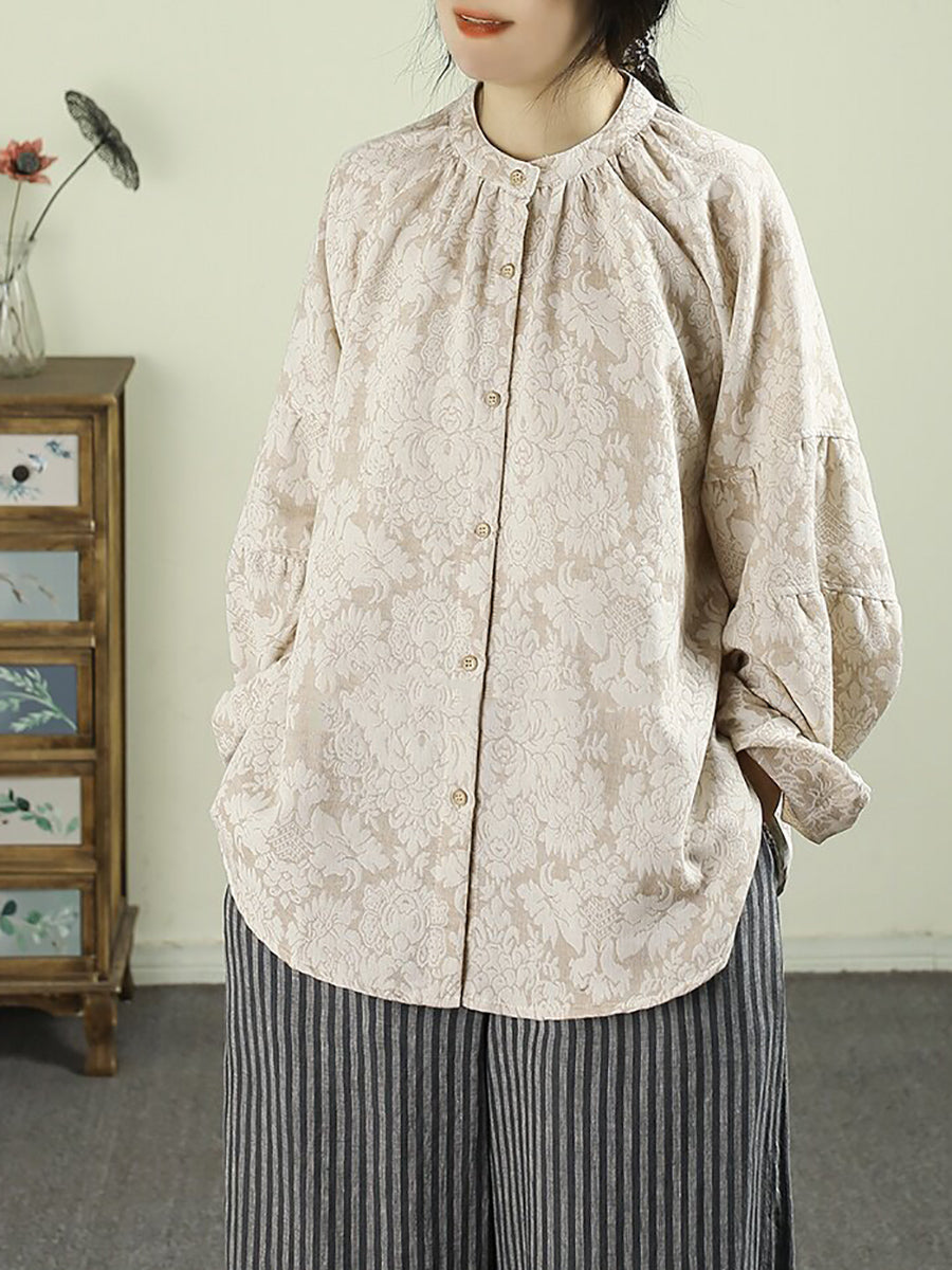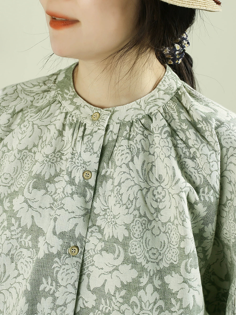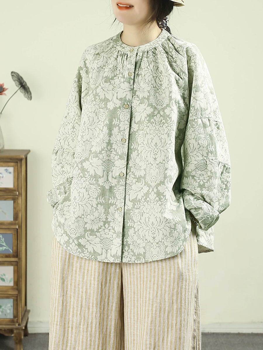 Women Spring Artsy Flower Stand Collar 100%Linen Shirt