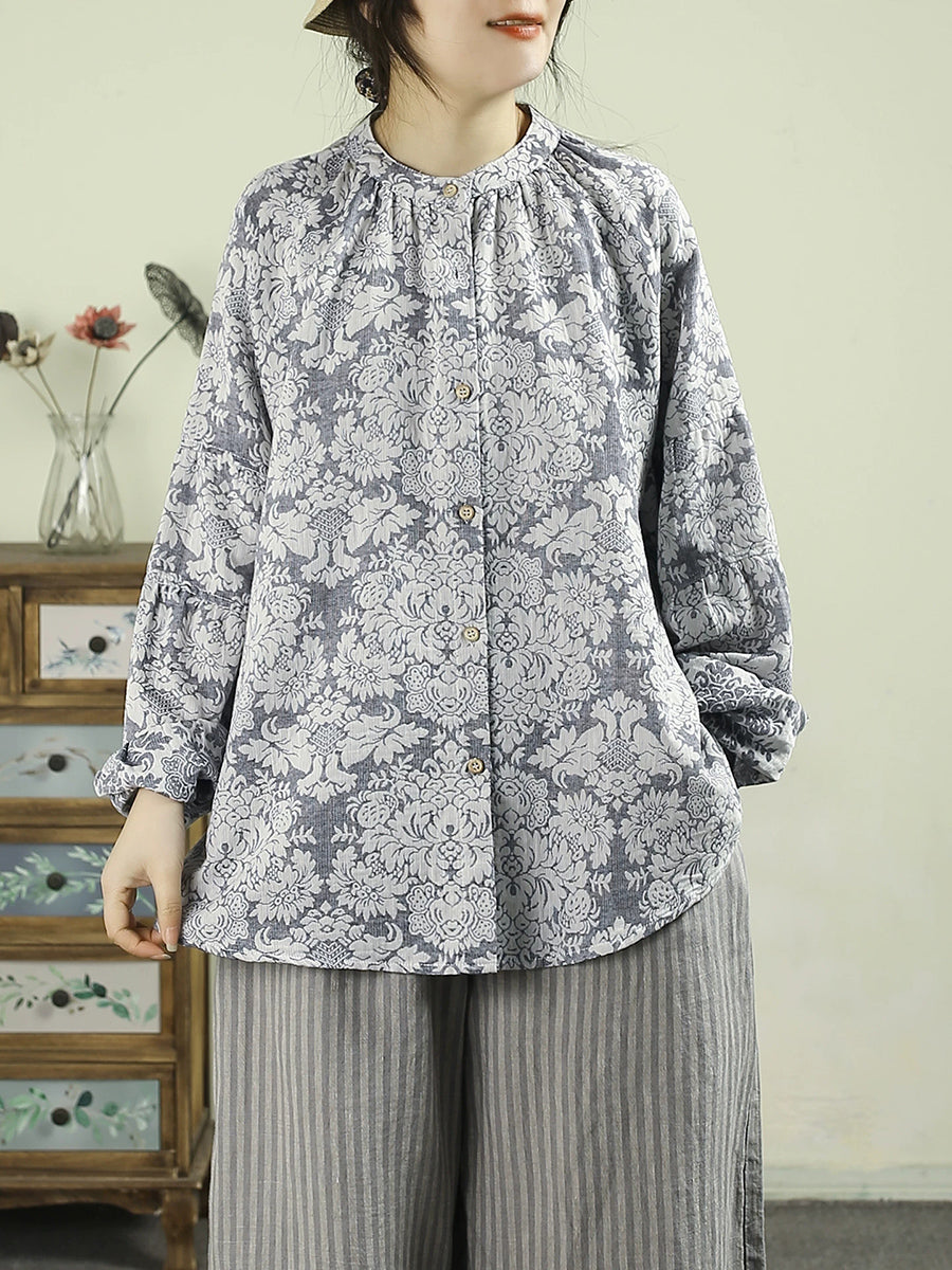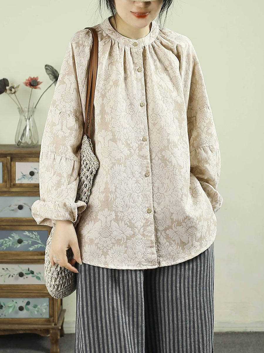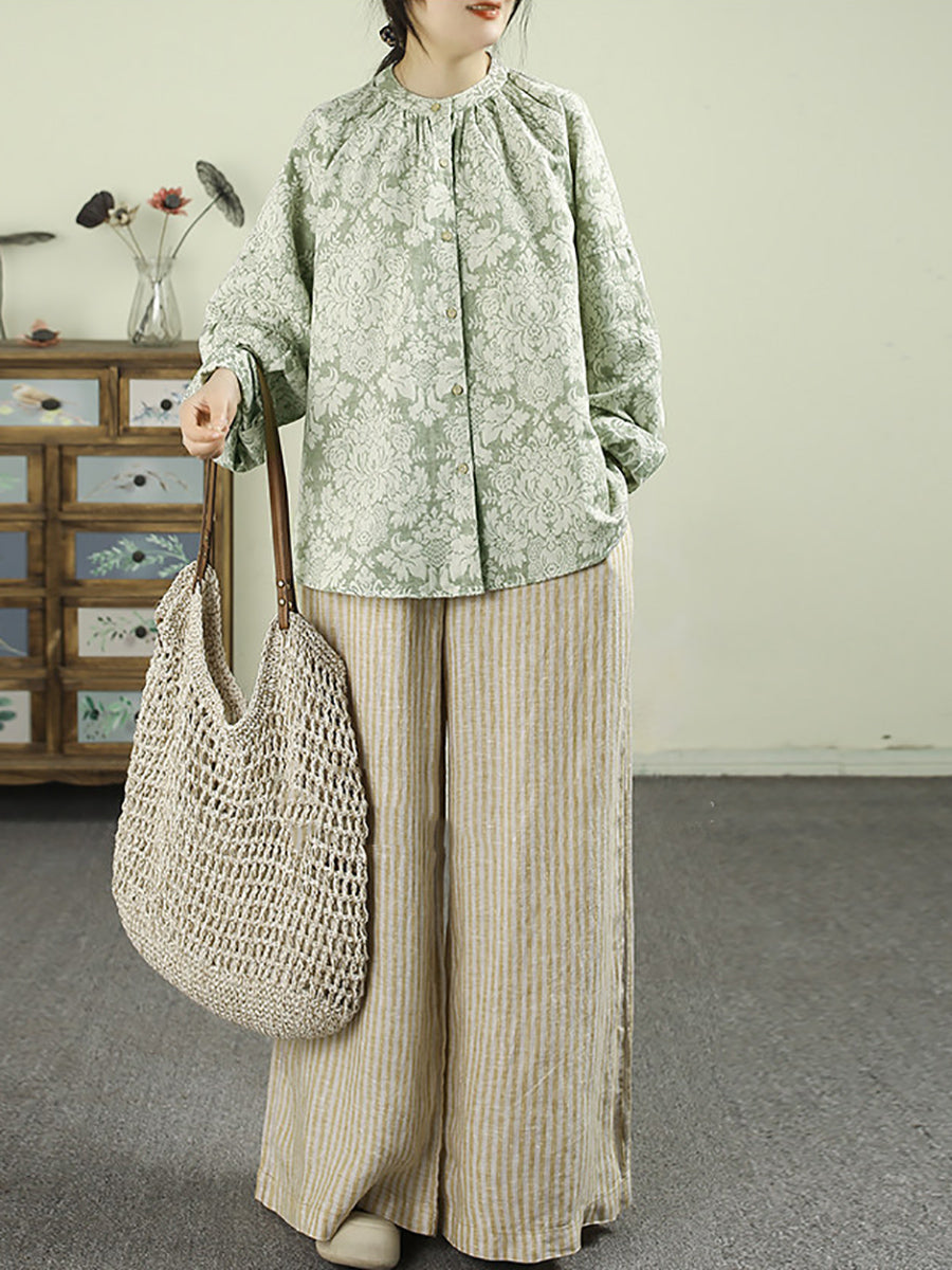 Women Spring Artsy Flower Stand Collar 100%Linen Shirt