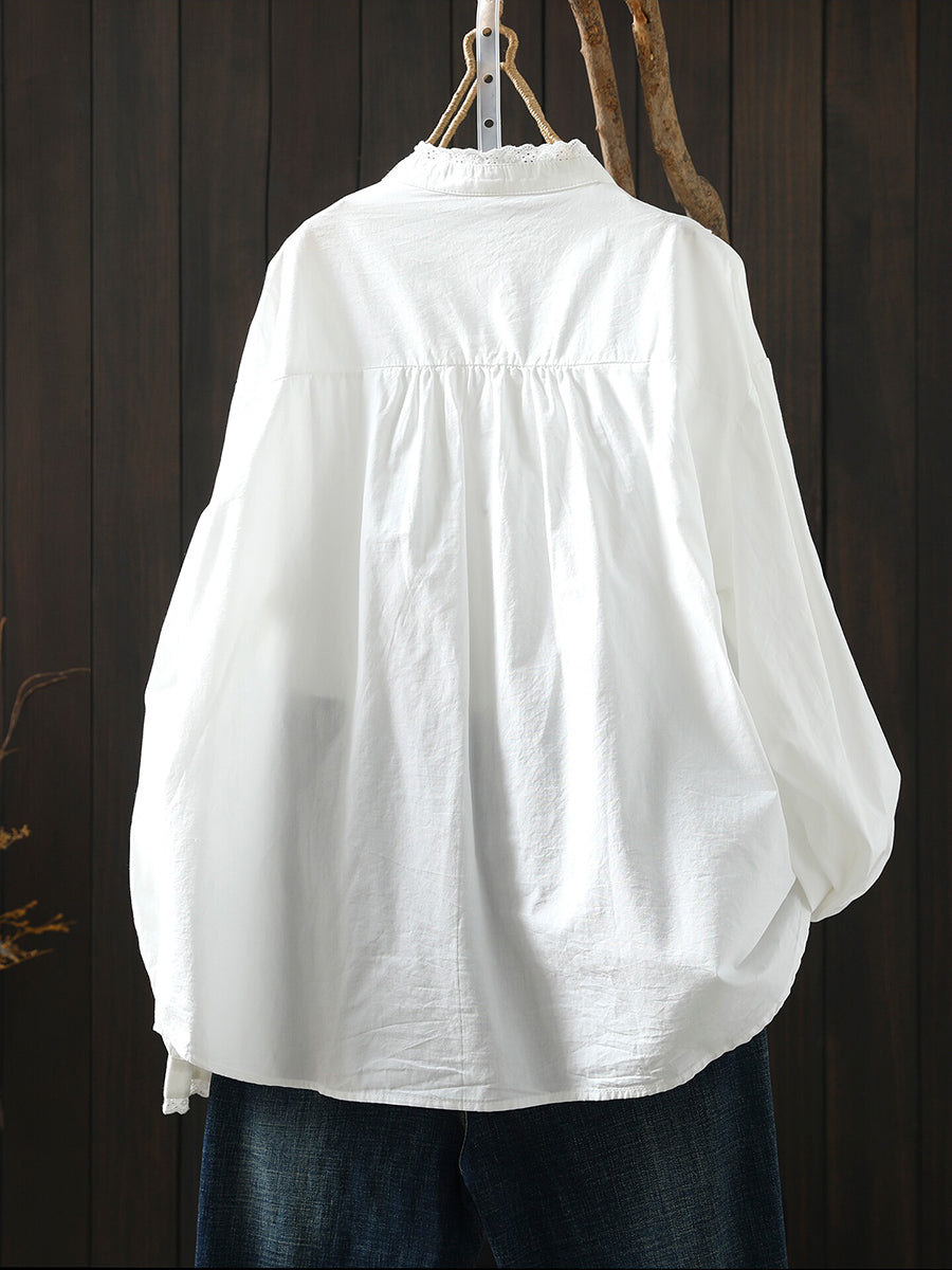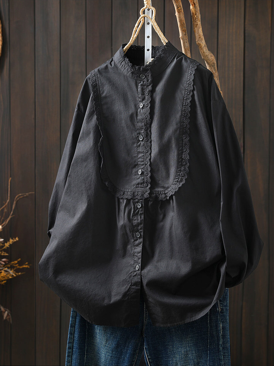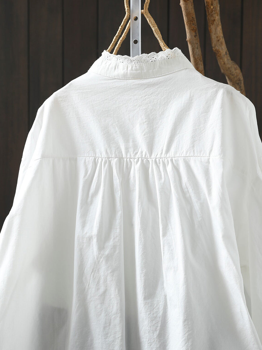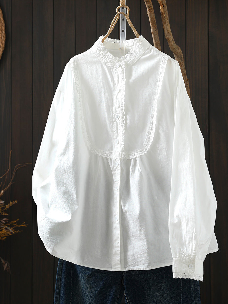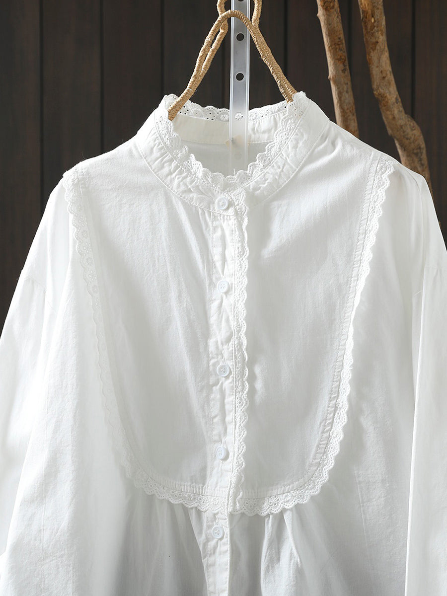 Women Spring Artsy Lace Spliced 100%Cotton Shirt