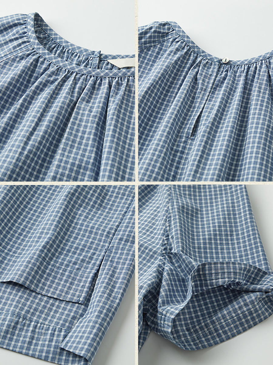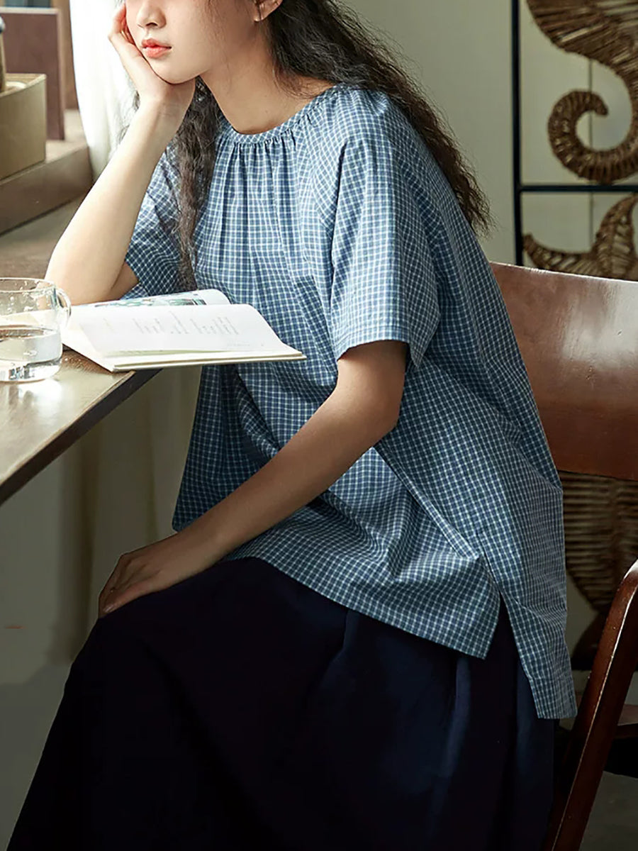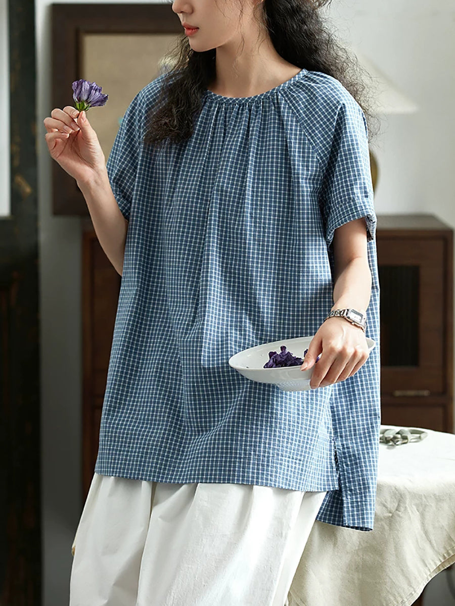 Women Summer Artsy Plaid O-Neck Cotton Blouse