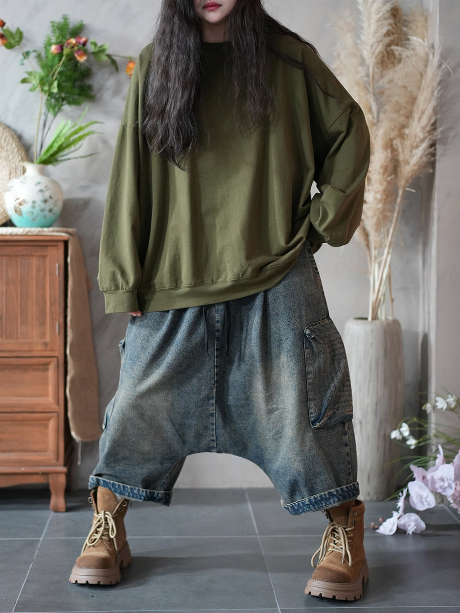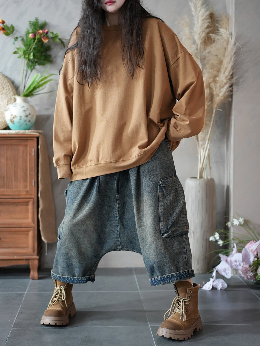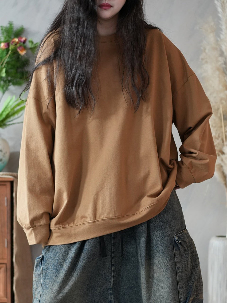 Women Spring Artsy Pure Color 100%Cotton O-Neck Blouse