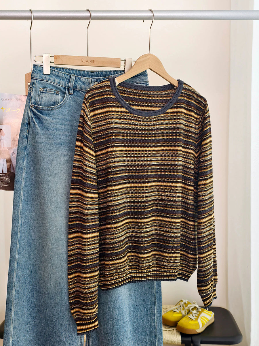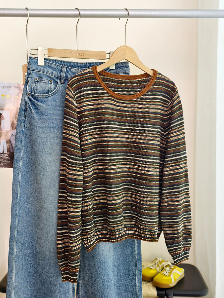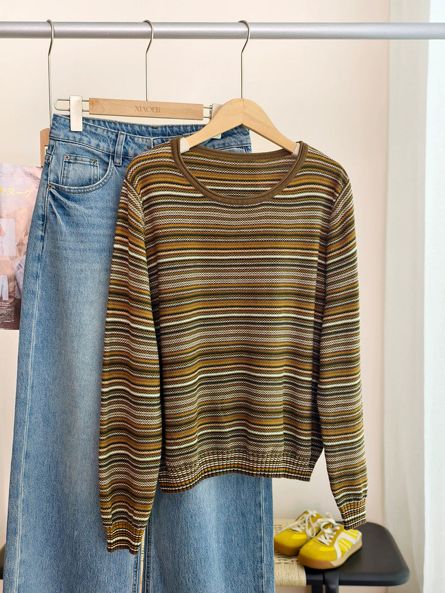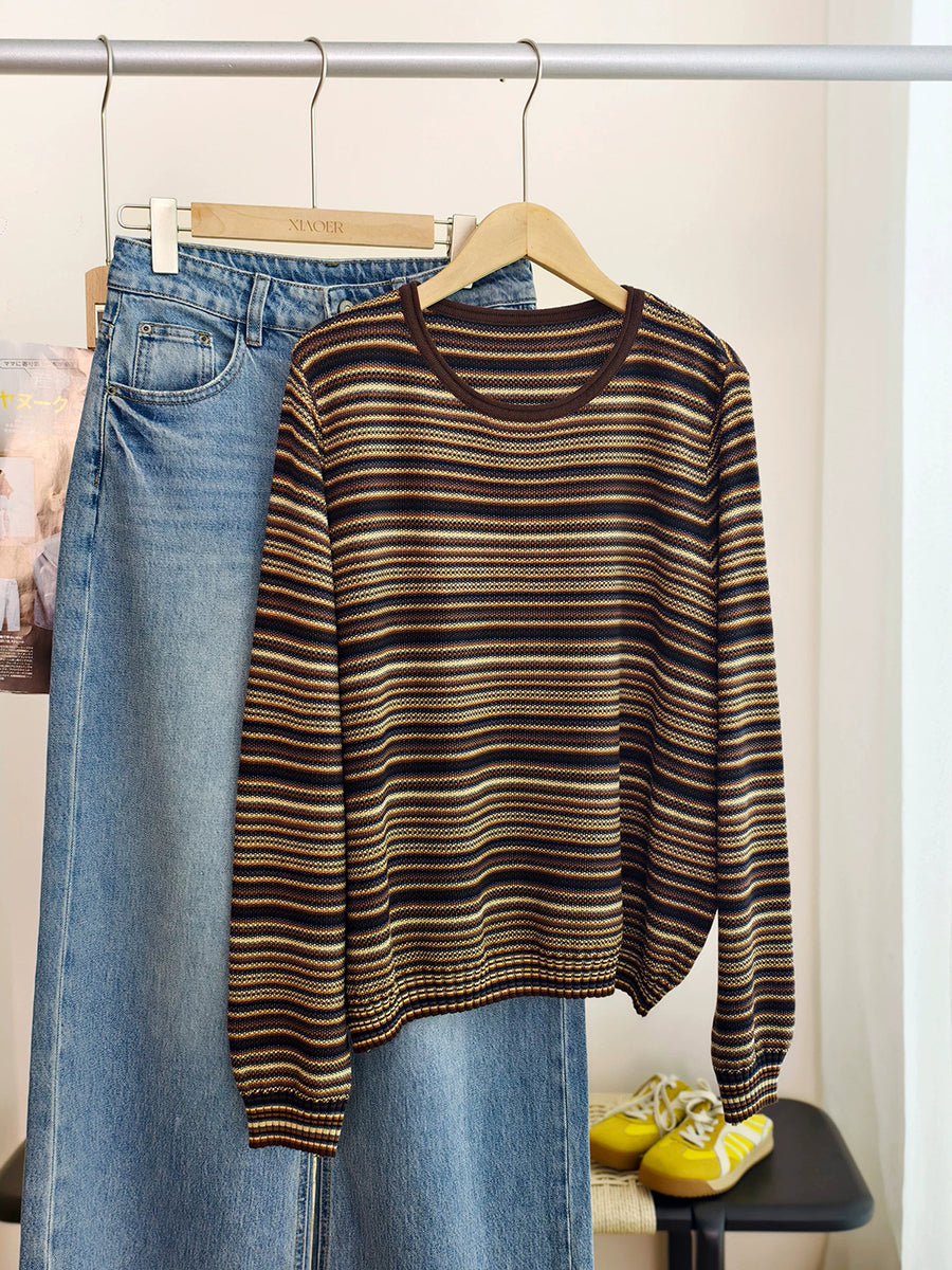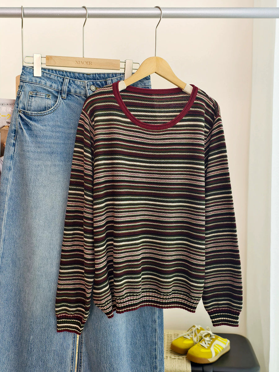 Women Spring Casual Stripe Cotton O-Neck Blouse