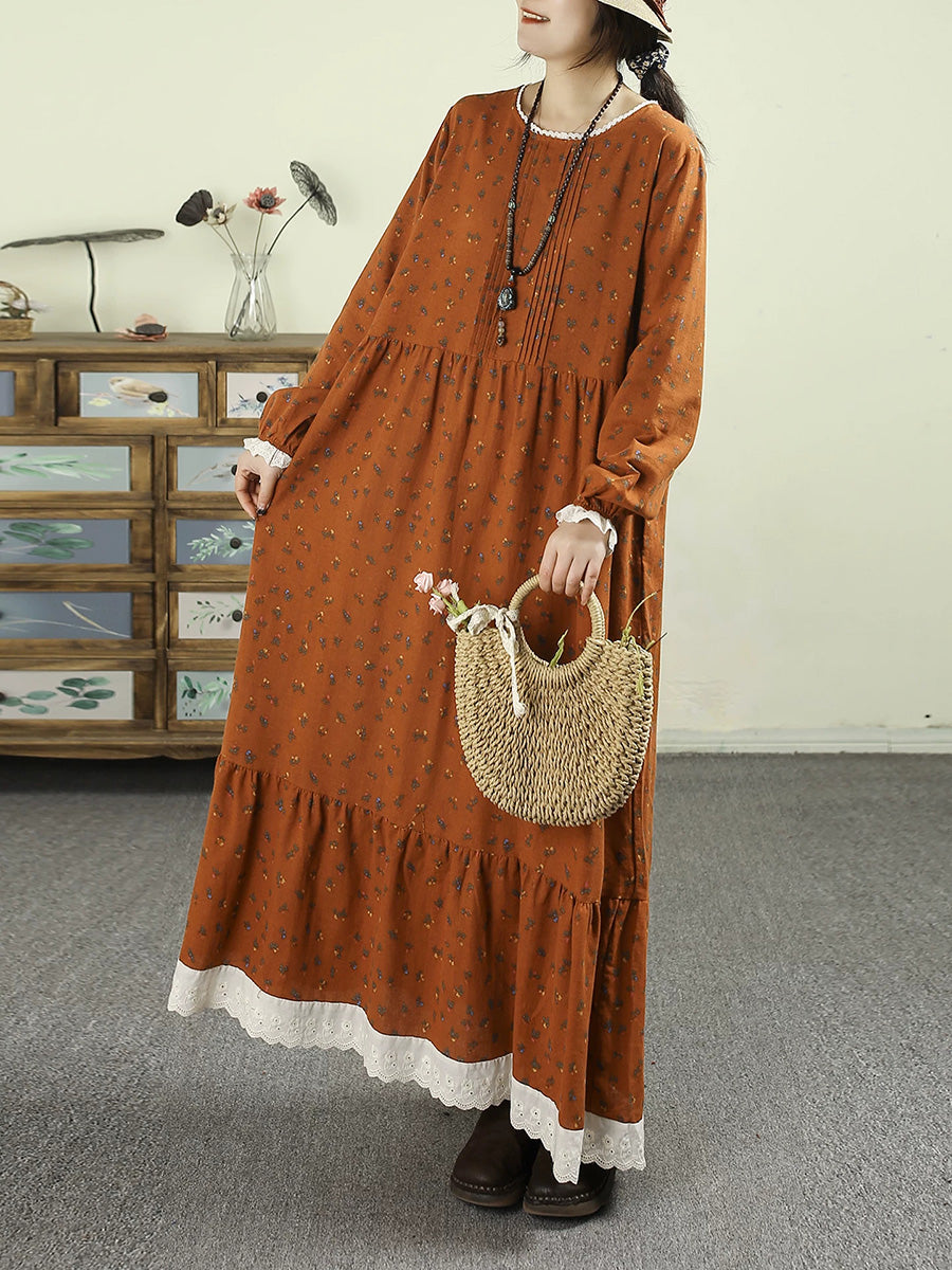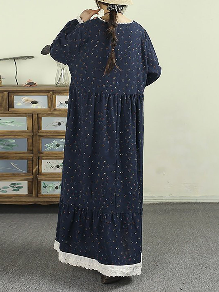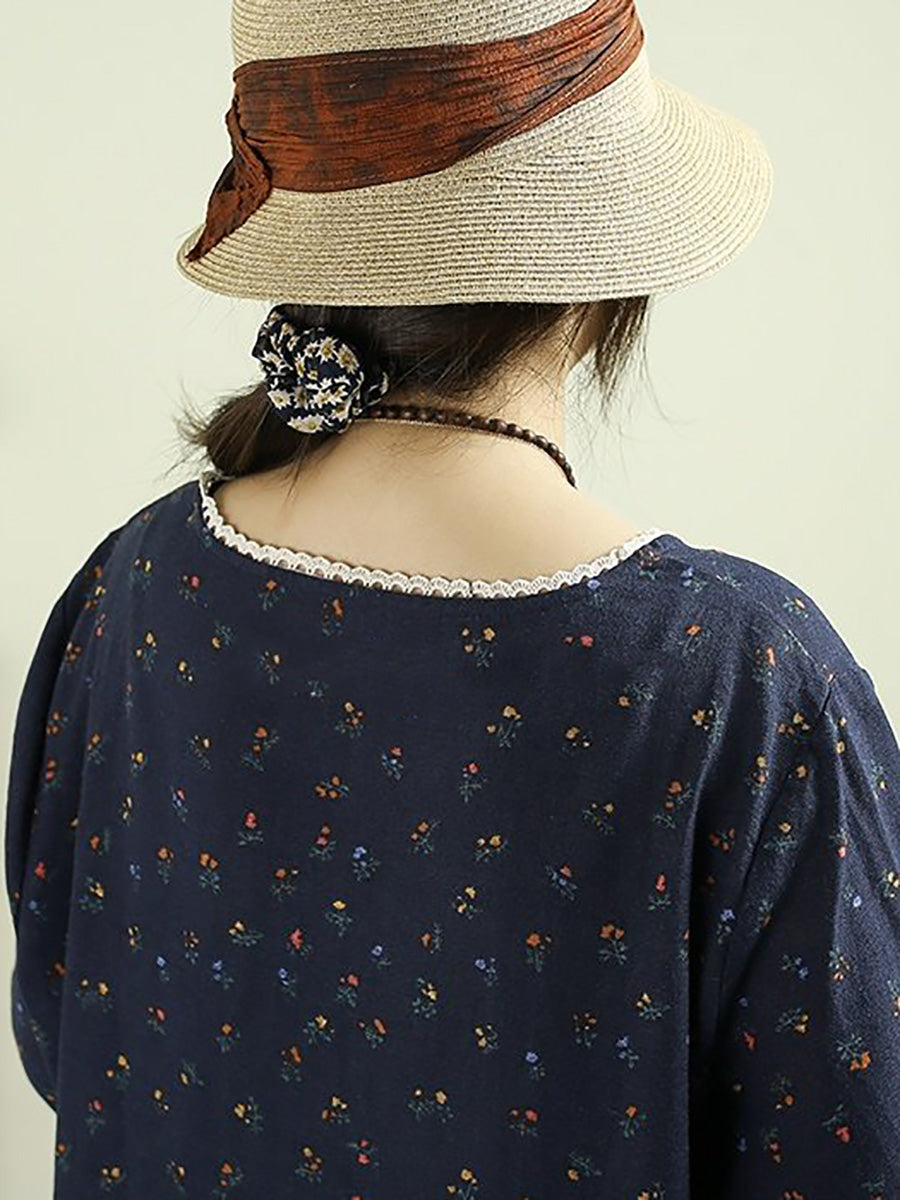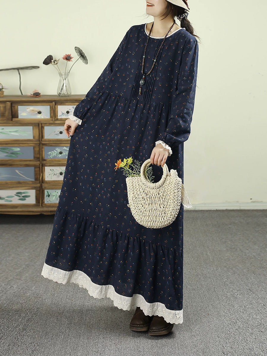 Women Spring Floral O-Neck Lace 100%Cotton Dress