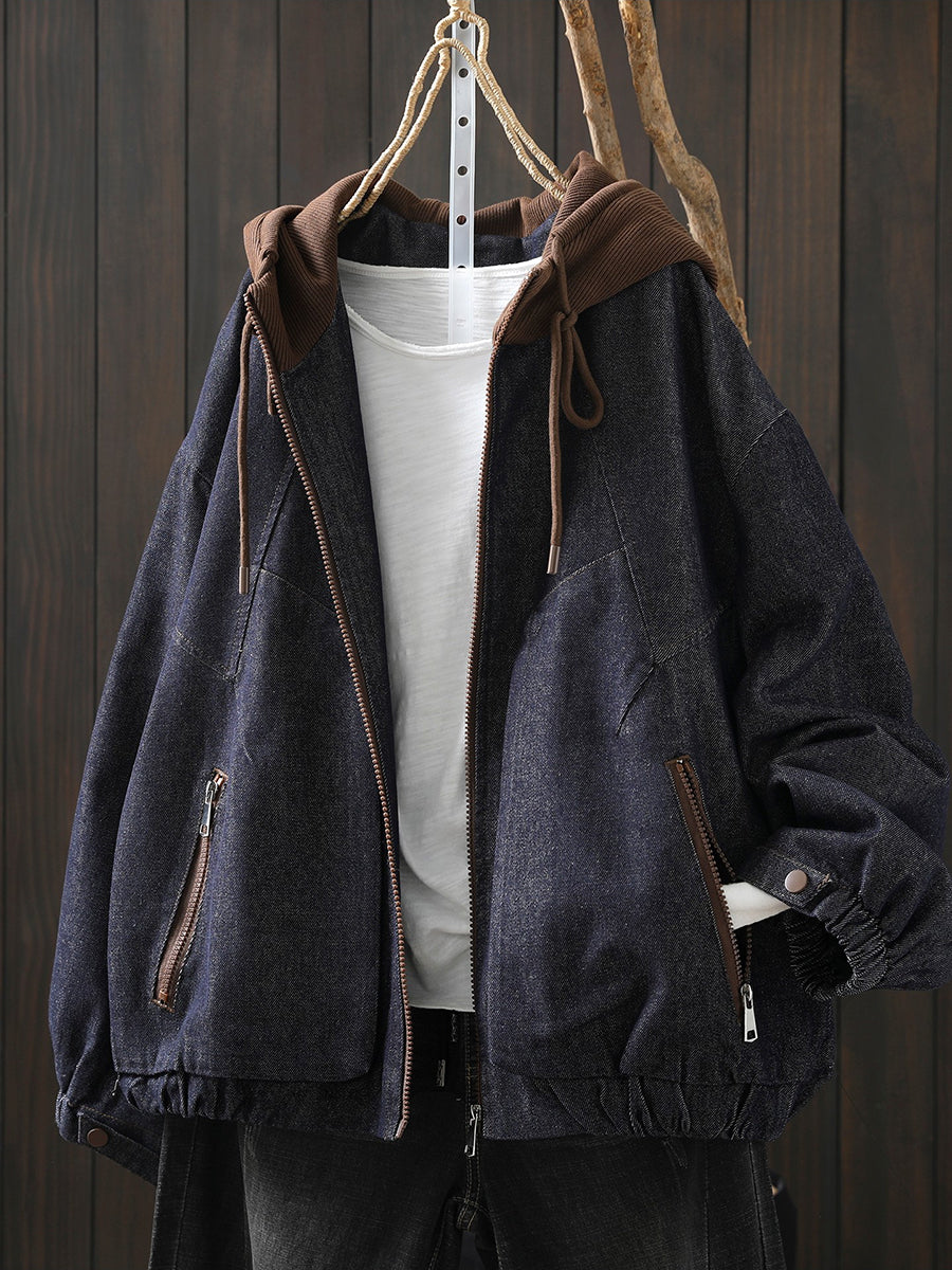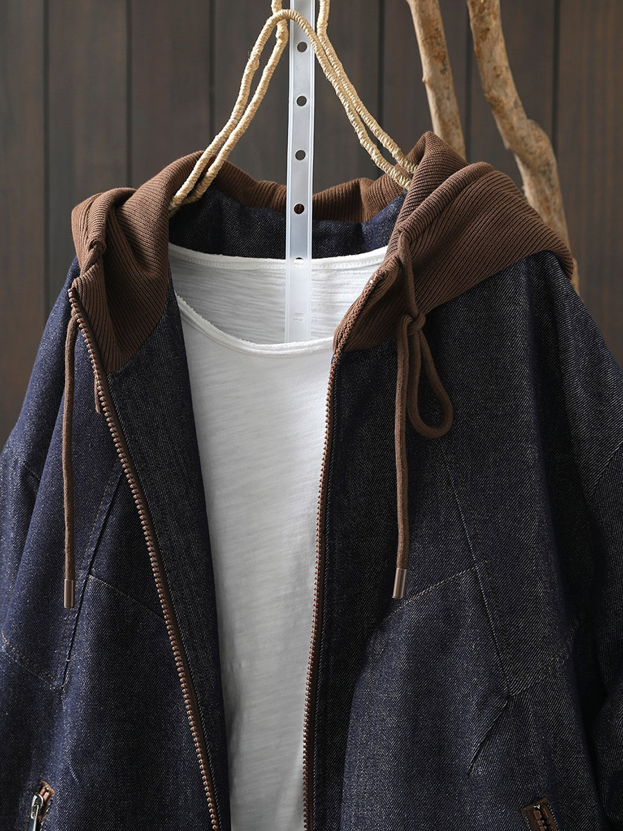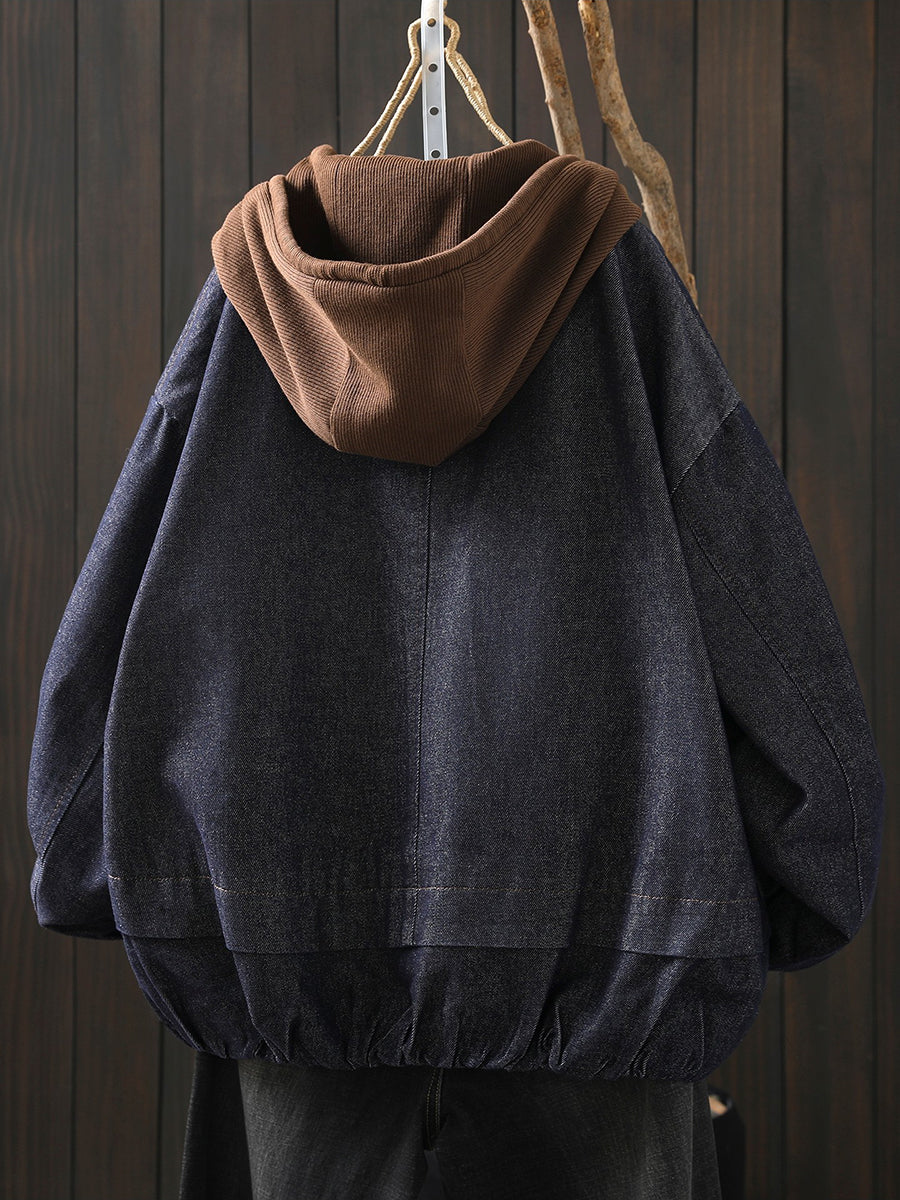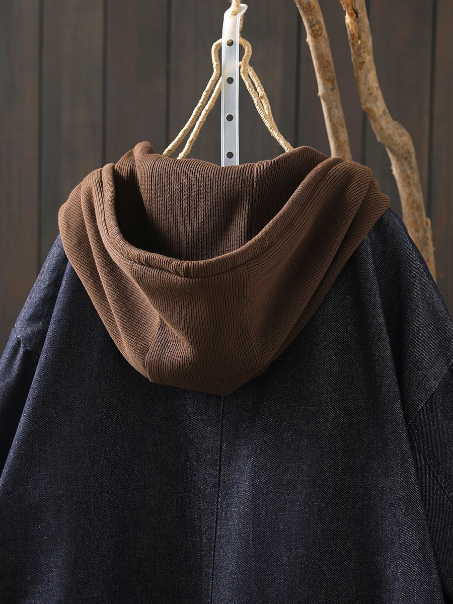 Women Spring Retro Colorblock Hooded Denim Jacket