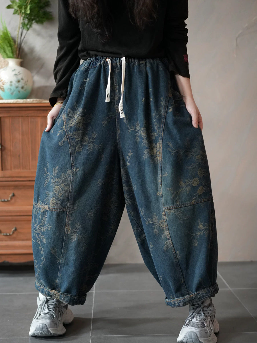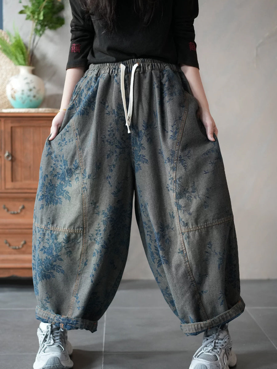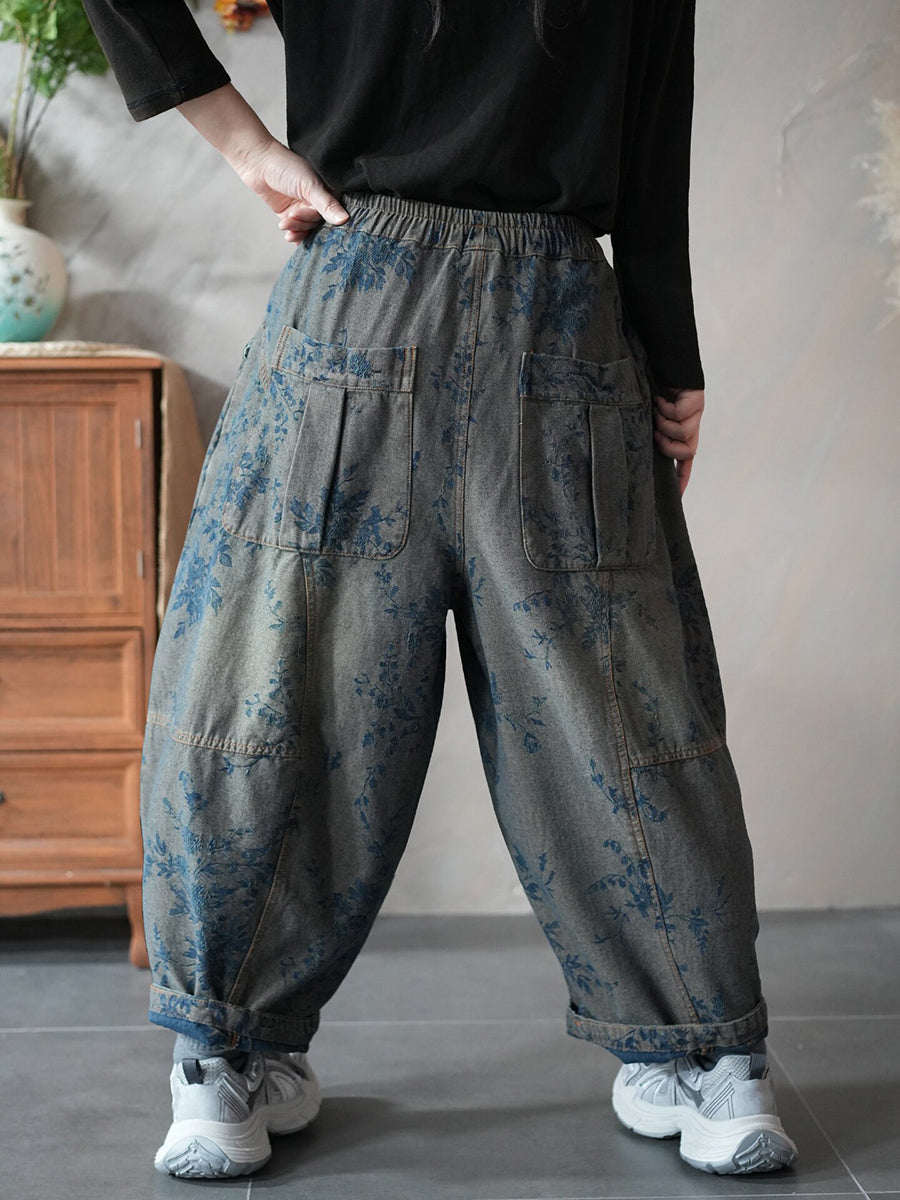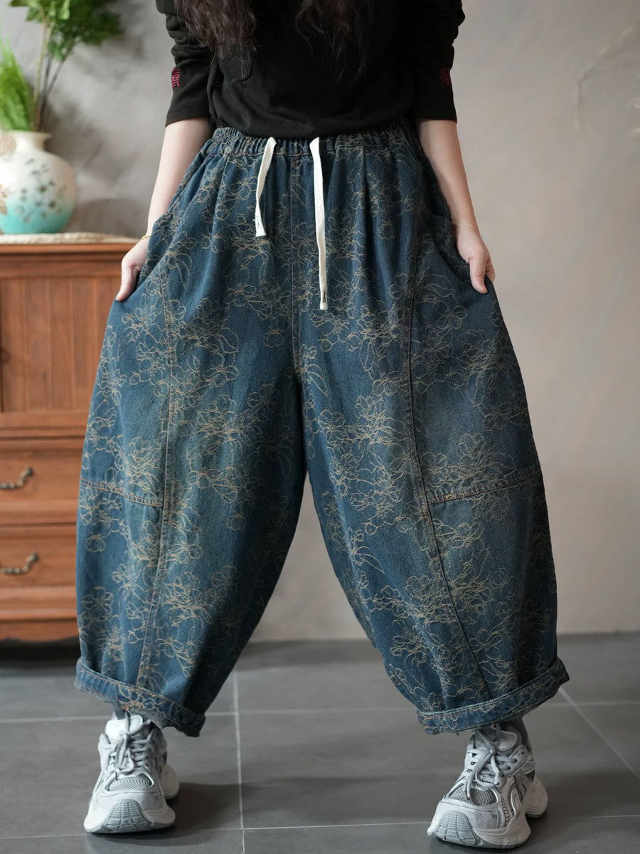 Women Spring Retro Denim Flower Harem Pants