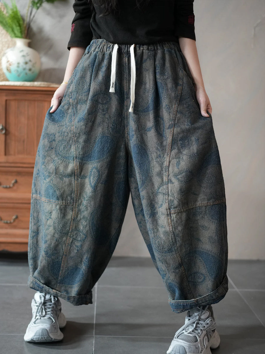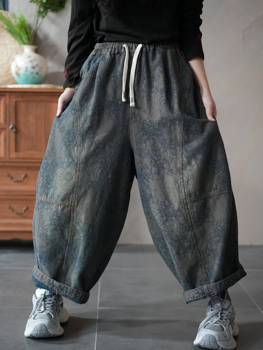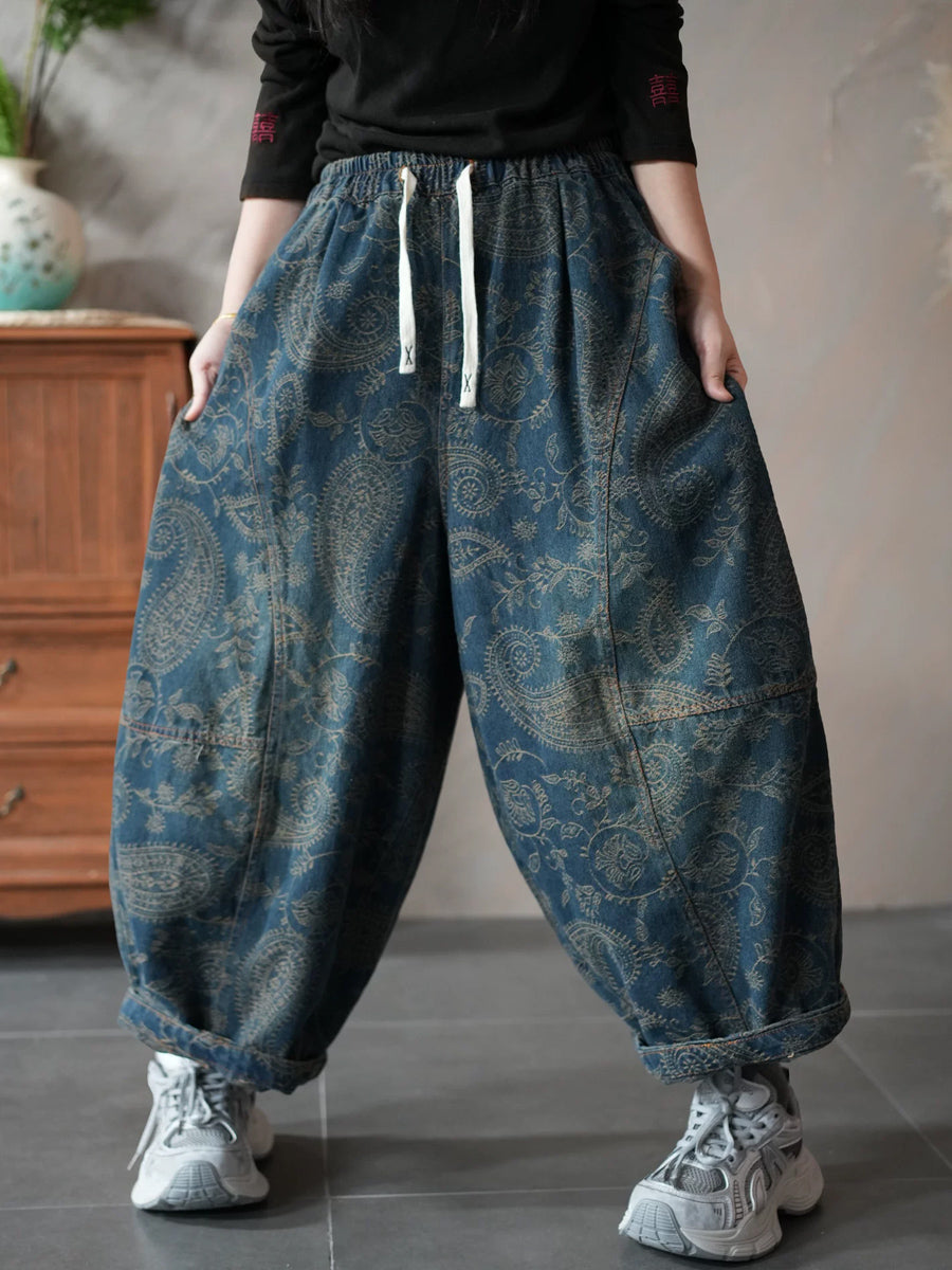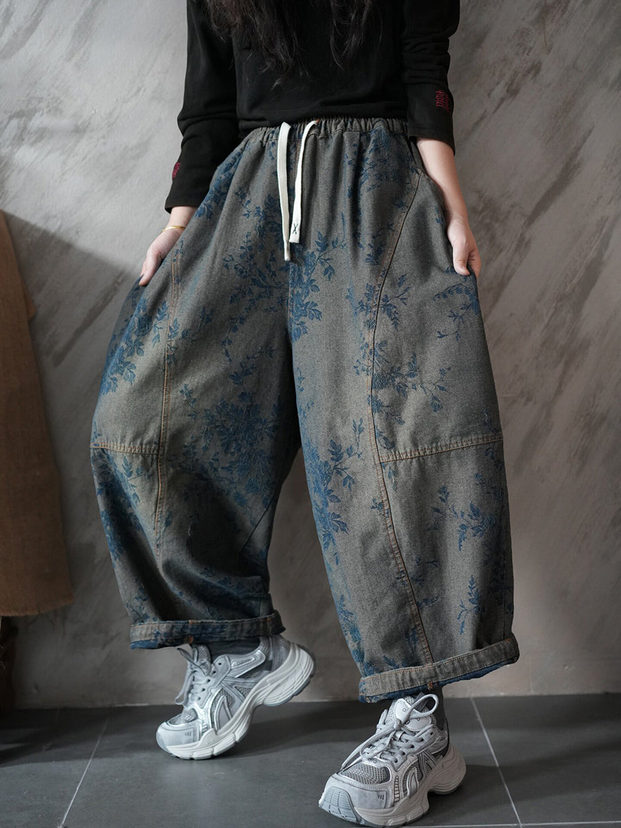 Women Spring Retro Denim Flower Harem Pants