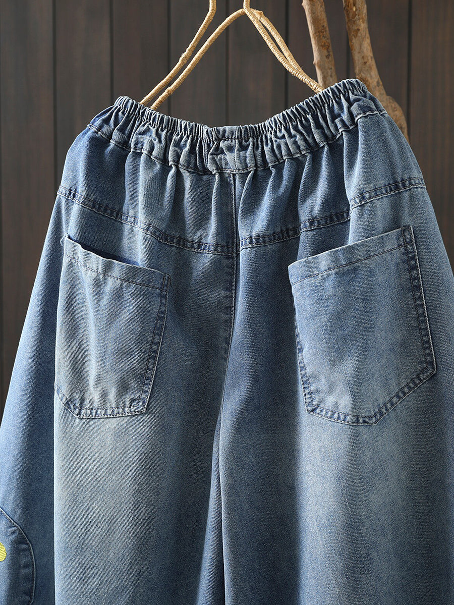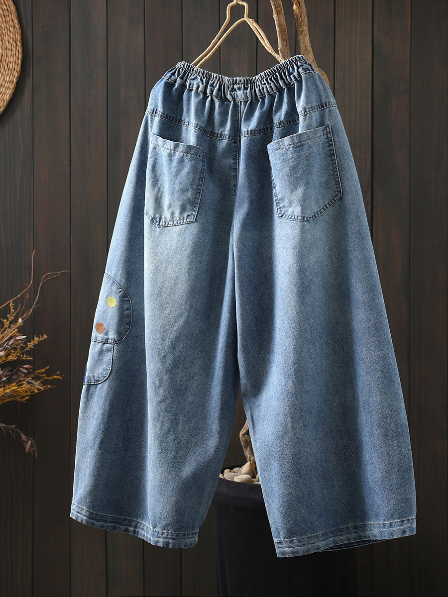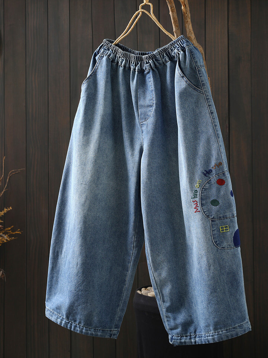 Women Spring Retro Embroidery Denim Wide-leg Pants