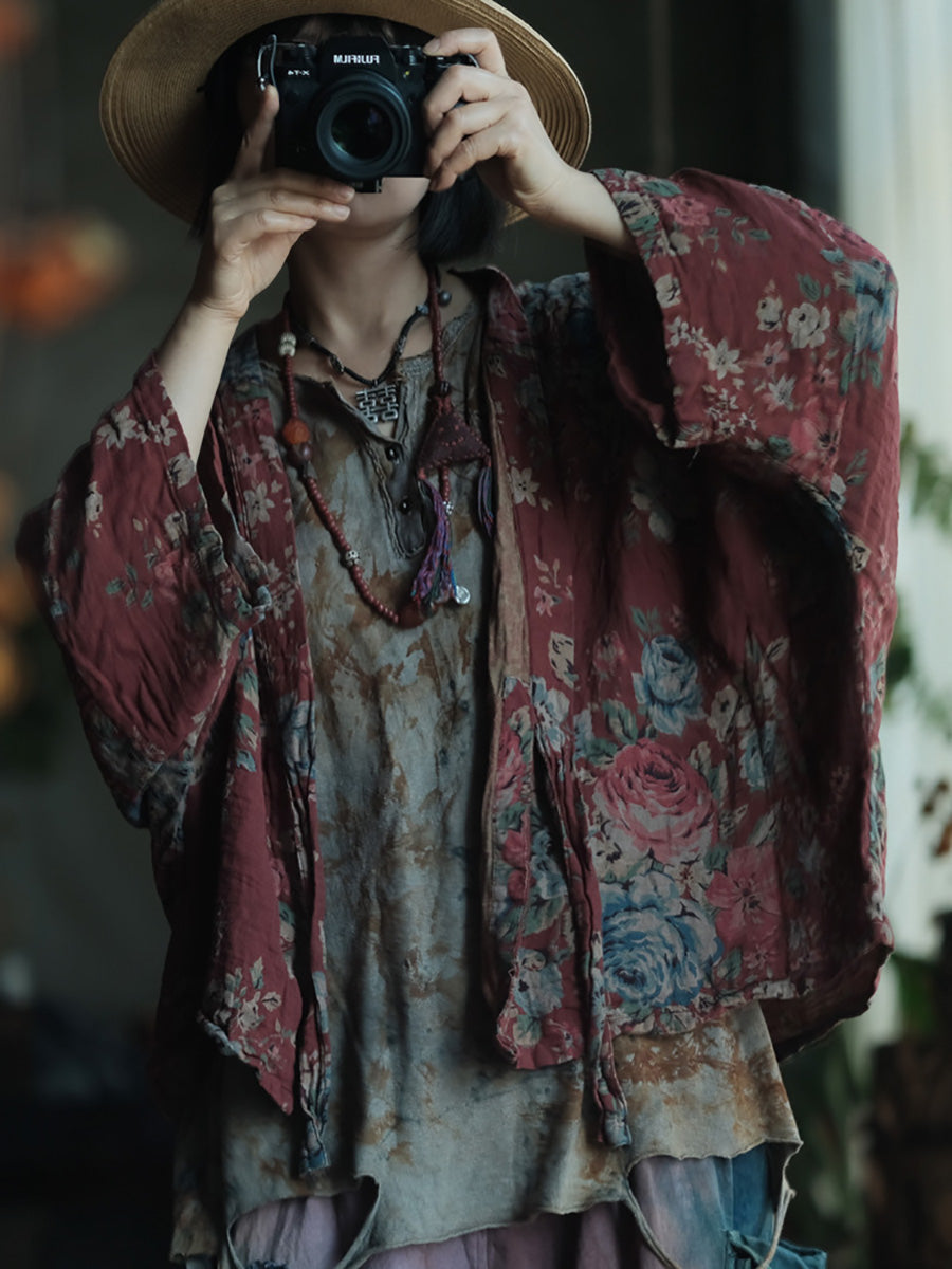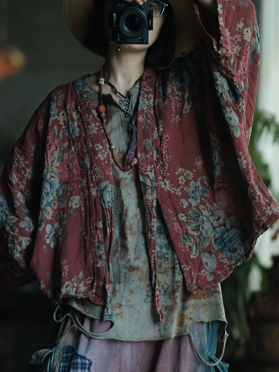 Women Spring Retro Flower V-Neck Cotton Shirt Coat