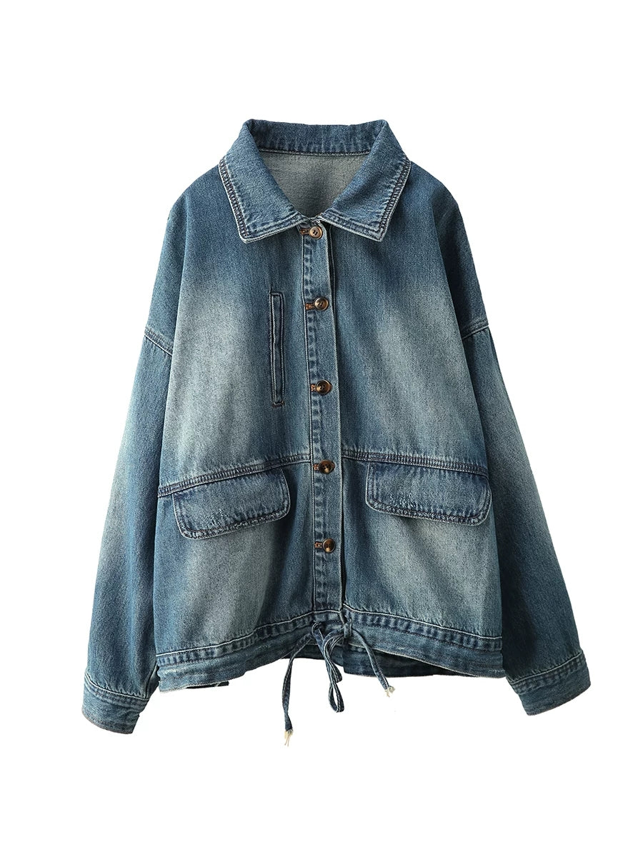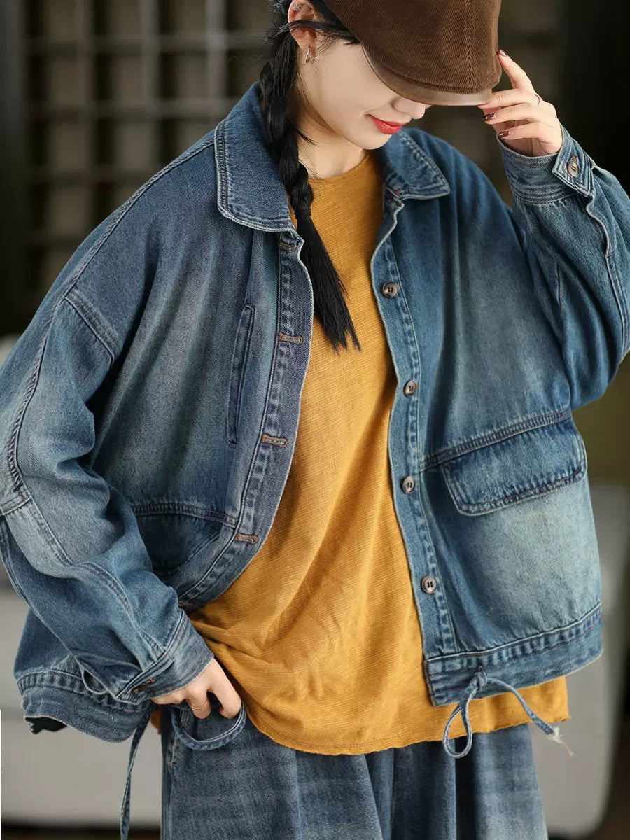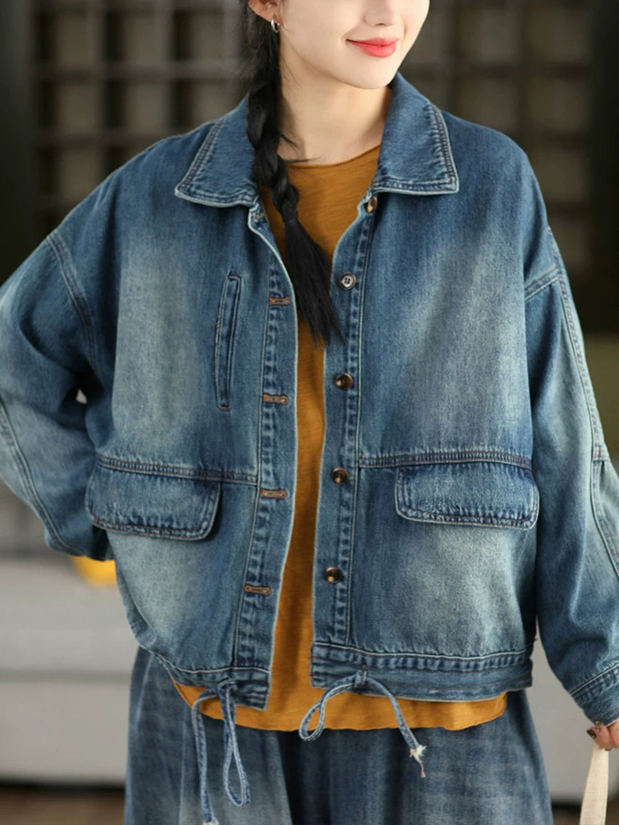 Women Spring Retro Pure Color Denim Coat