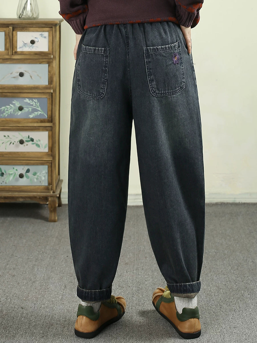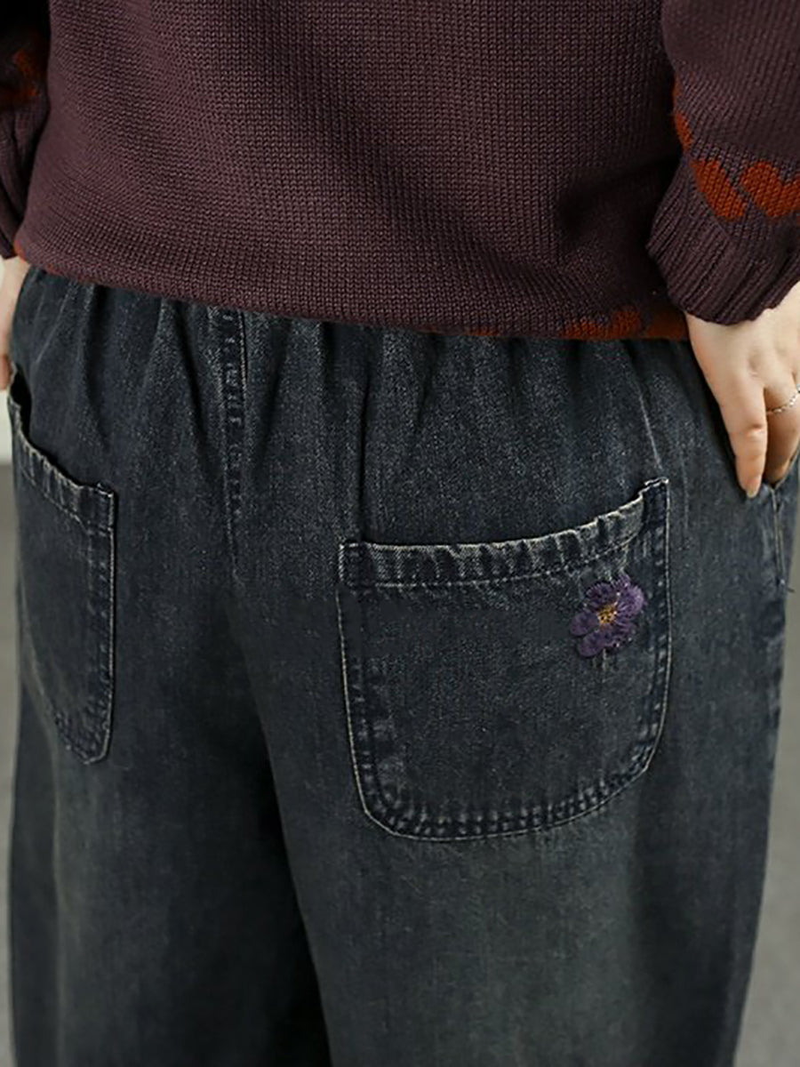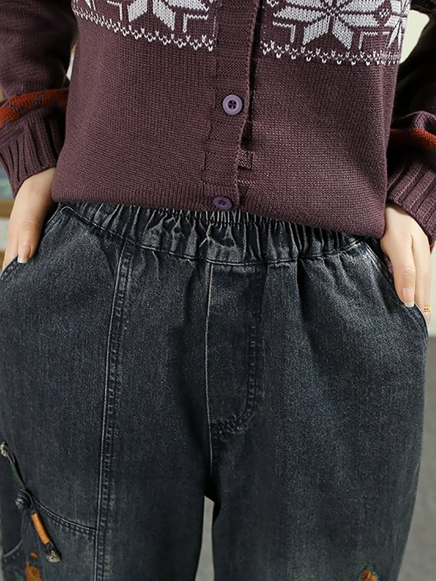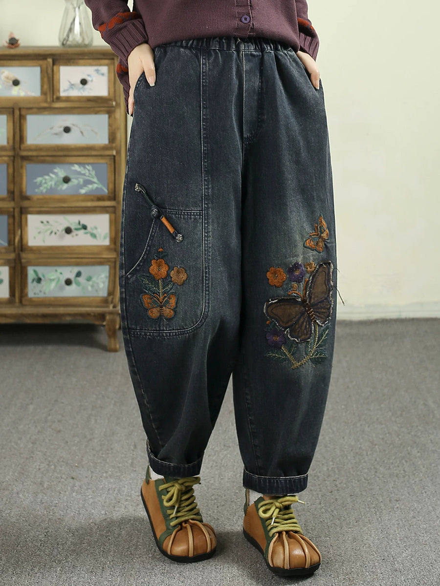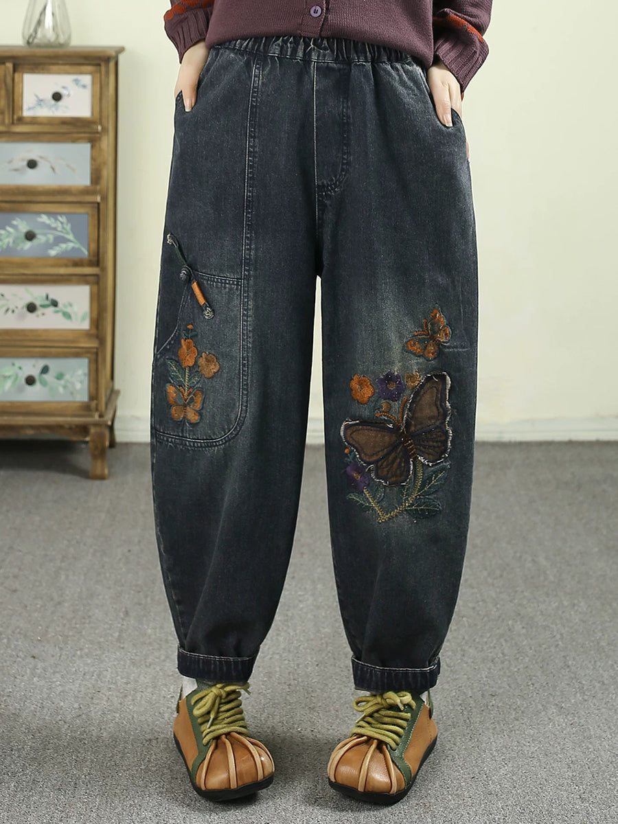 Women Spring Vintage Denim Butterfly Patchwork Harem Pants