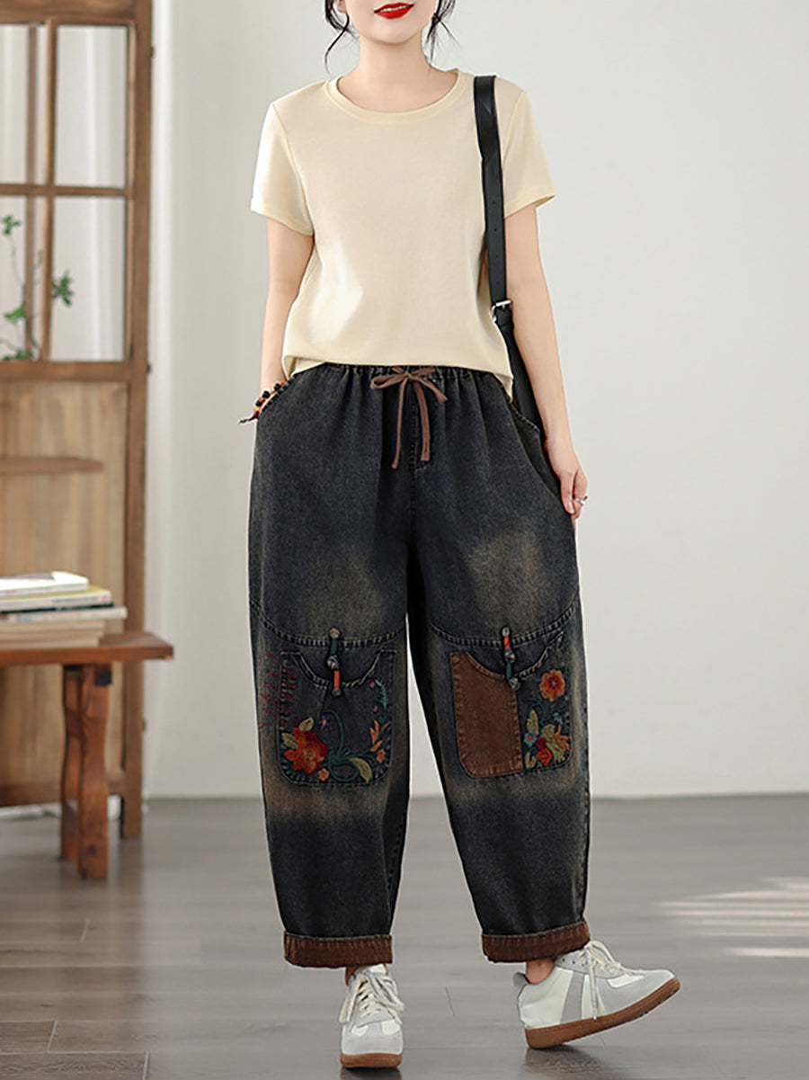 Women Spring Vintage Embroidery Patchwork Denim Harem Pants